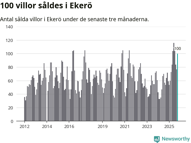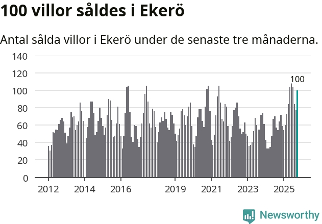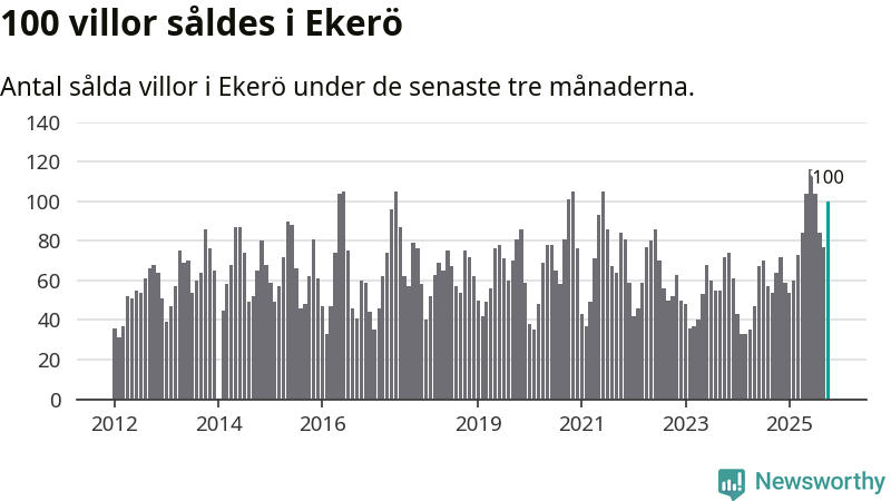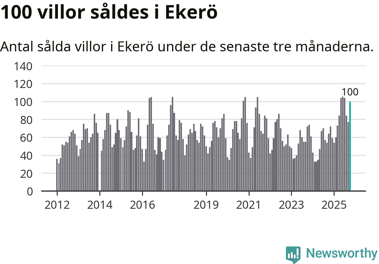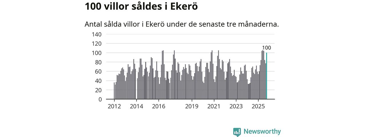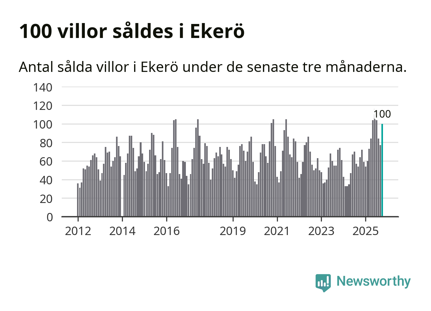 Sammanlagt såldes 100 villor i Ekerö kommun mellan augusti och oktober till ett genomsnittligt pris på 7,2 miljoner kronor. I fjol gjordes 64 affärer vid den här tiden på året.