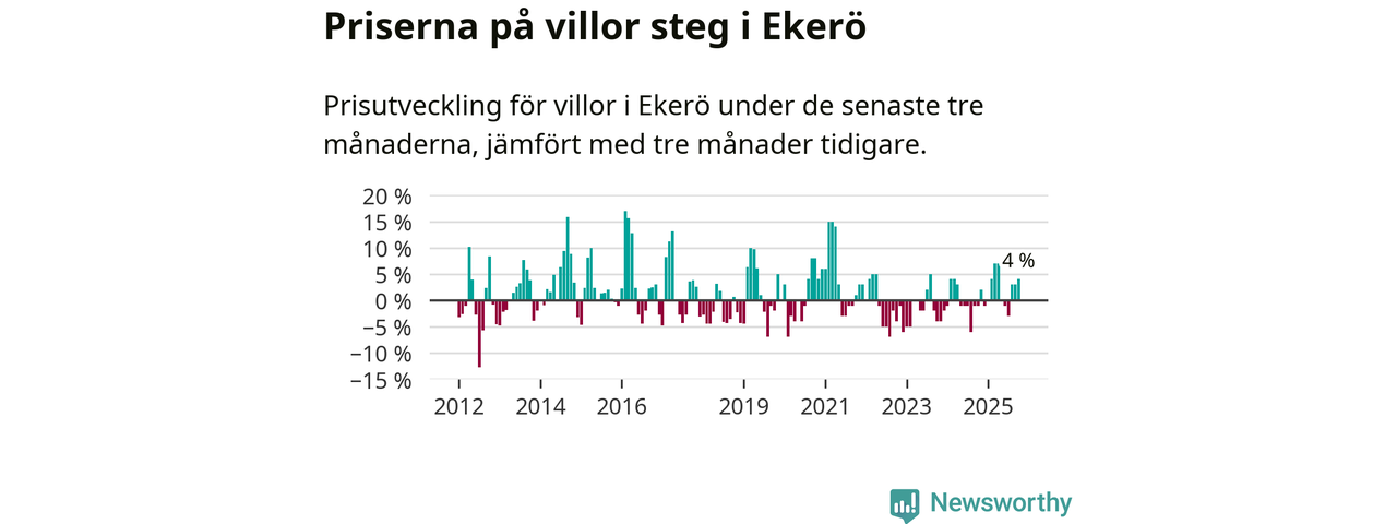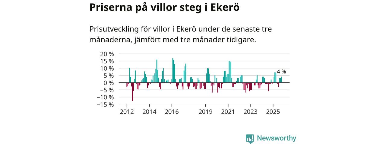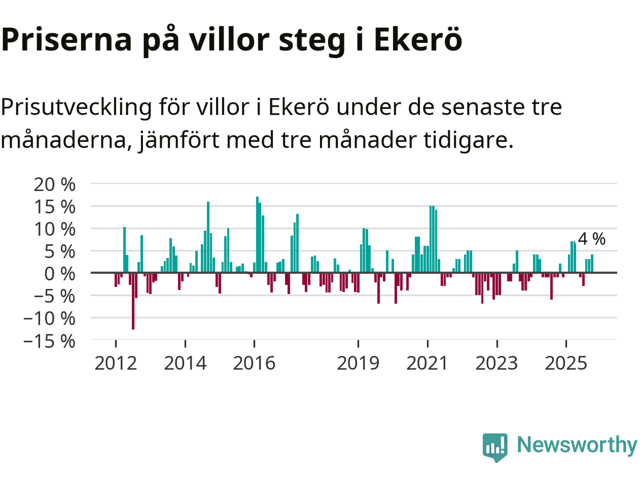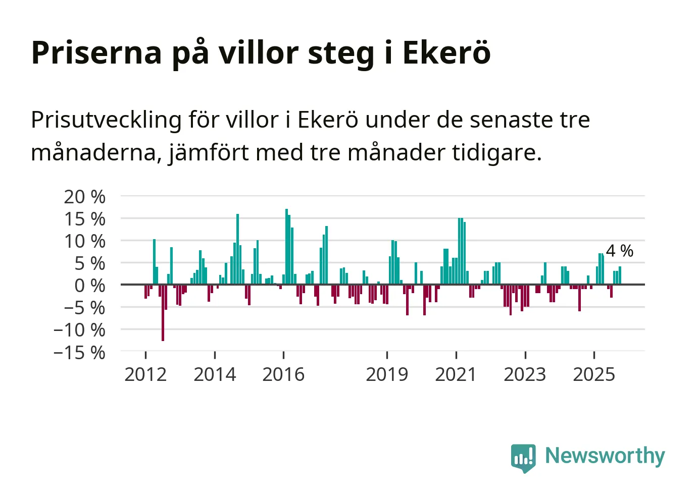 Villapriserna har gått upp i Ekerö kommun. Medelpriset på försäljningarna under de senaste tre månaderna visar på en uppgång med 4 procent.
