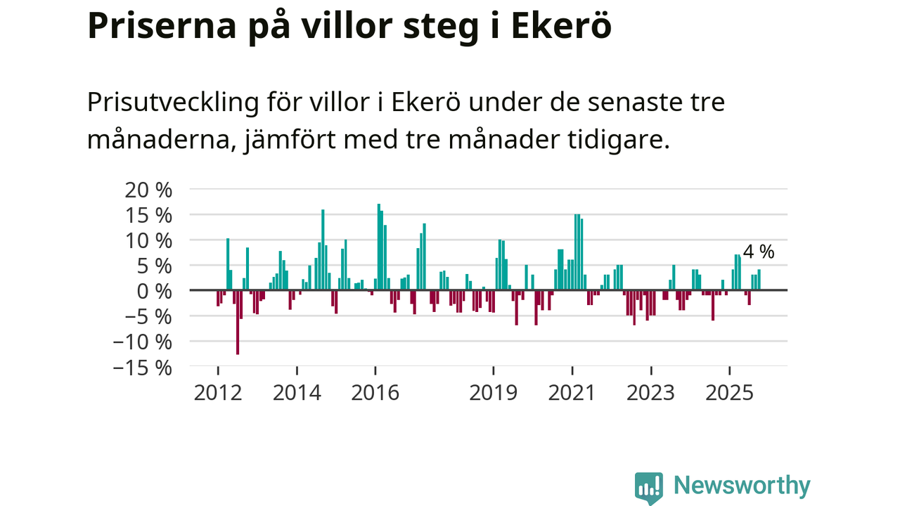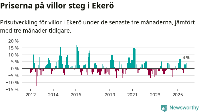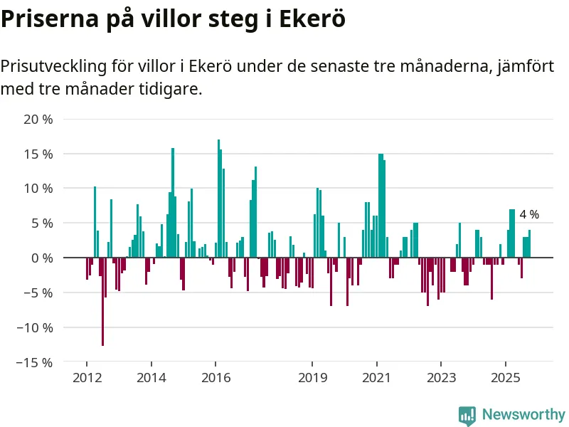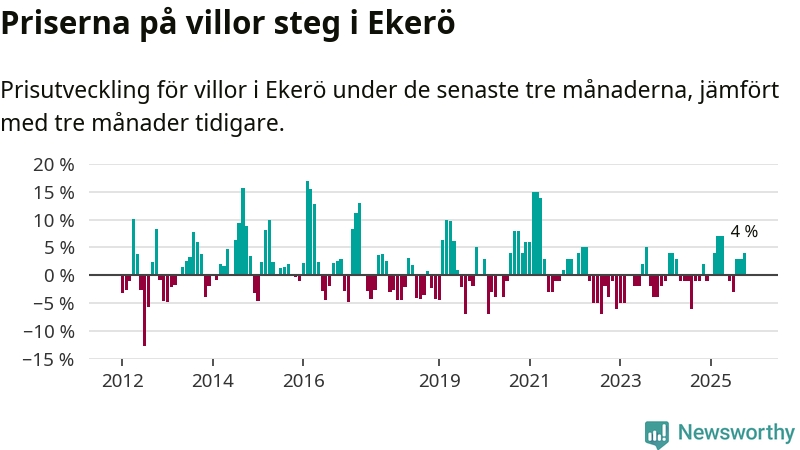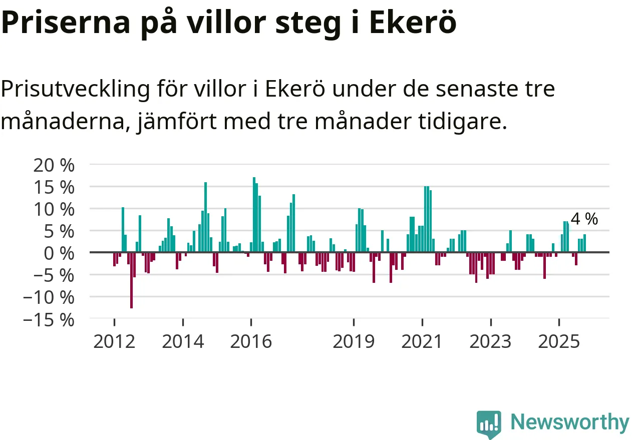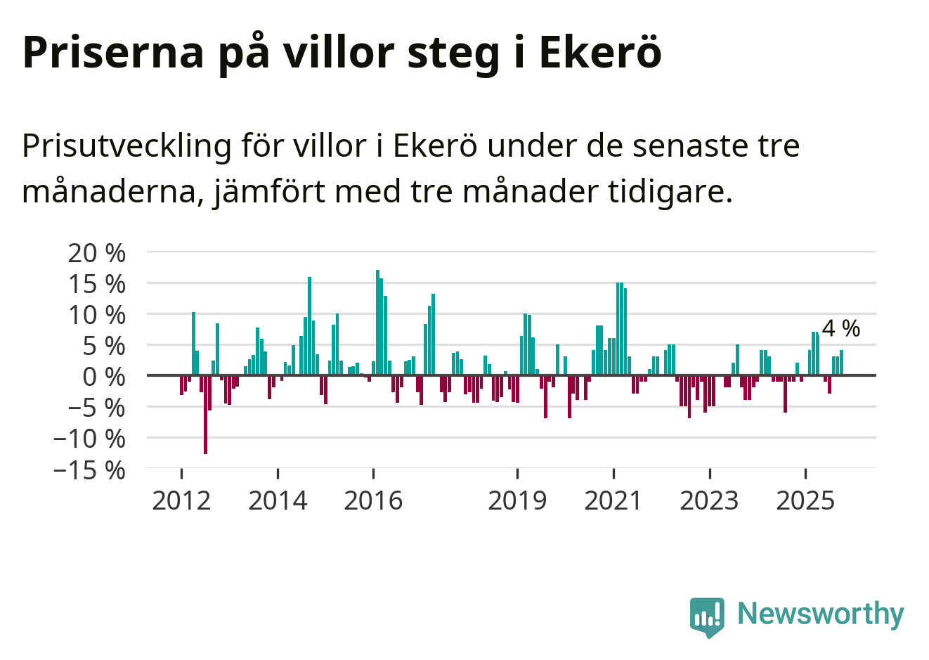 Villapriserna har gått upp i Ekerö kommun. Medelpriset på försäljningarna under de senaste tre månaderna visar på en uppgång med 4 procent.