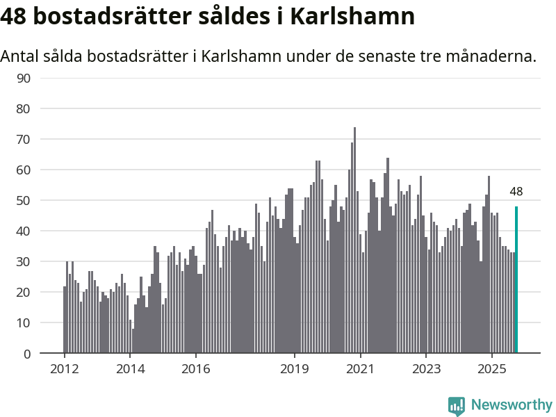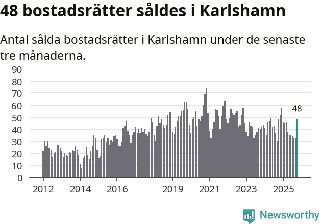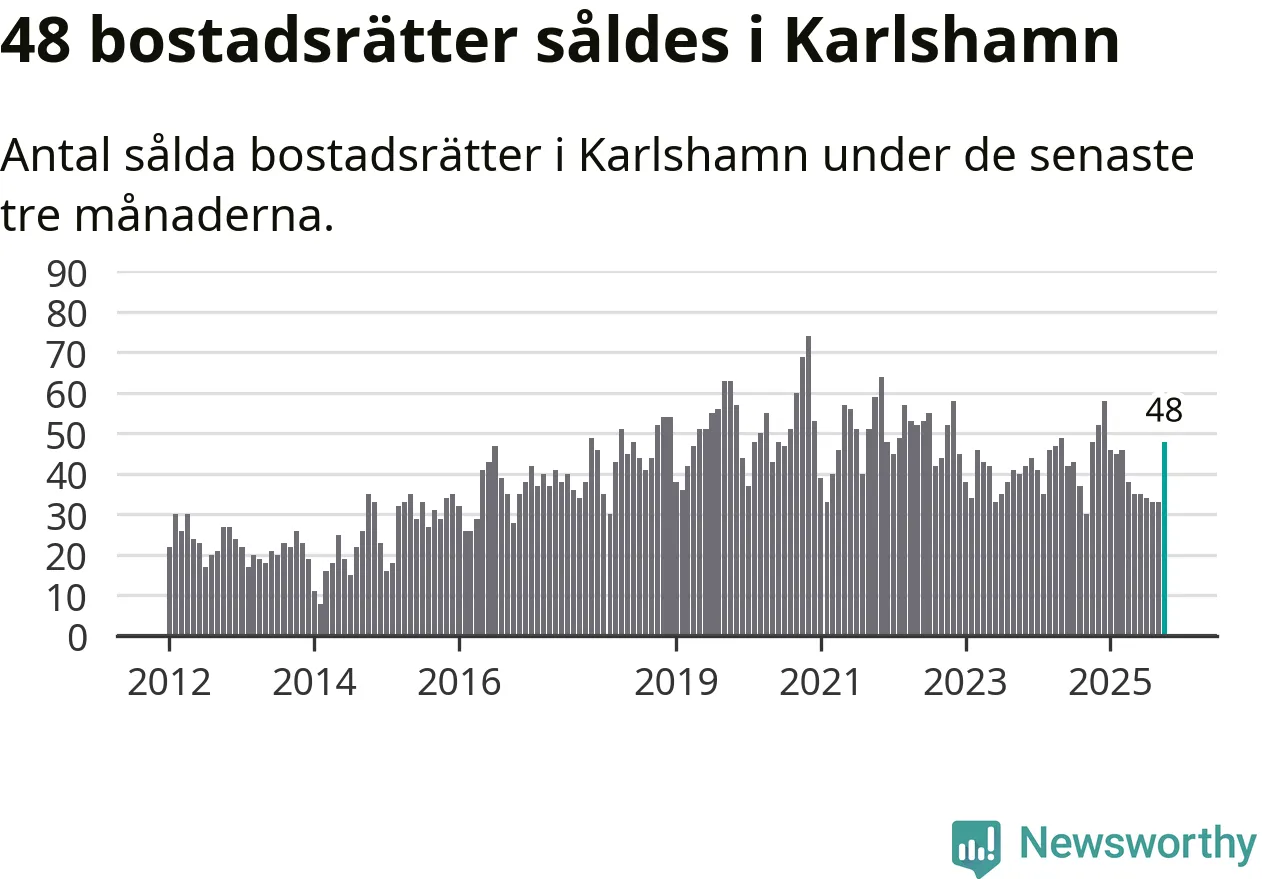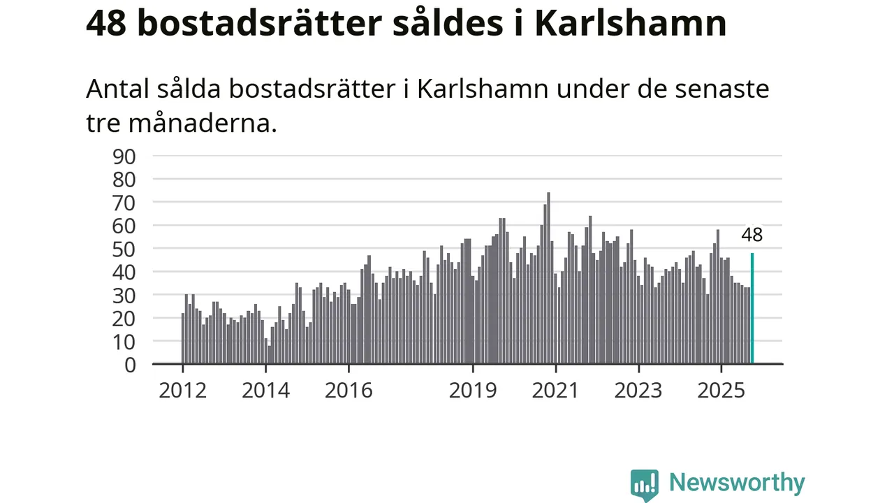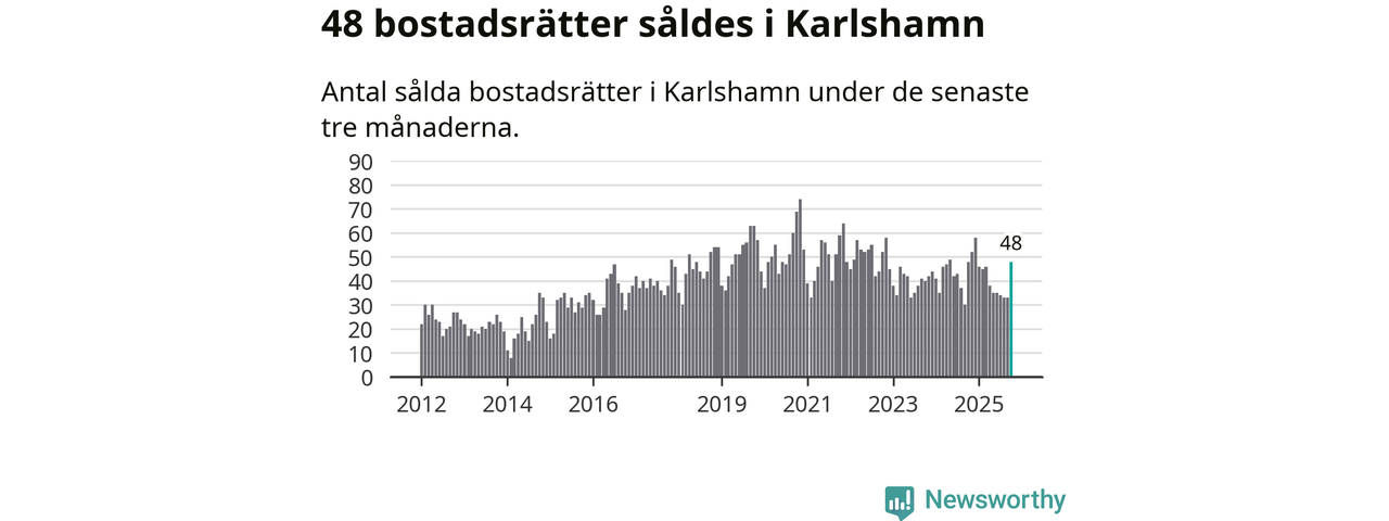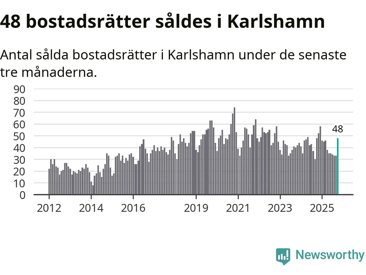 Sammanlagt såldes 48 bostadsrätter i Karlshamns kommun mellan augusti och oktober till ett genomsnittligt pris på 1,1 miljoner kronor. I fjol gjordes 48 affärer vid den här tiden på året.