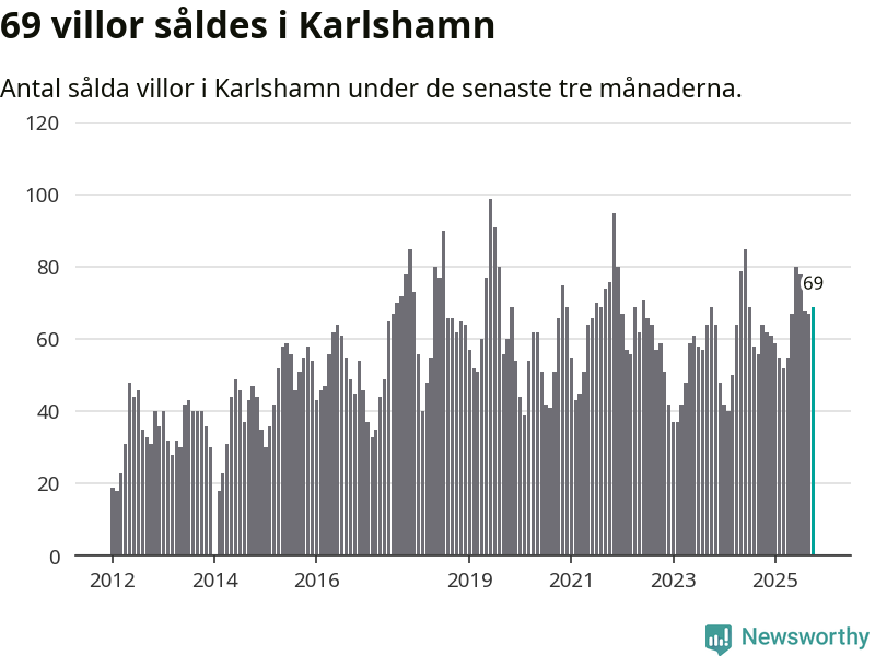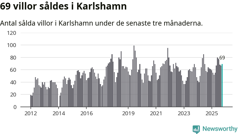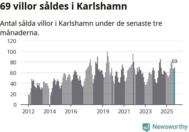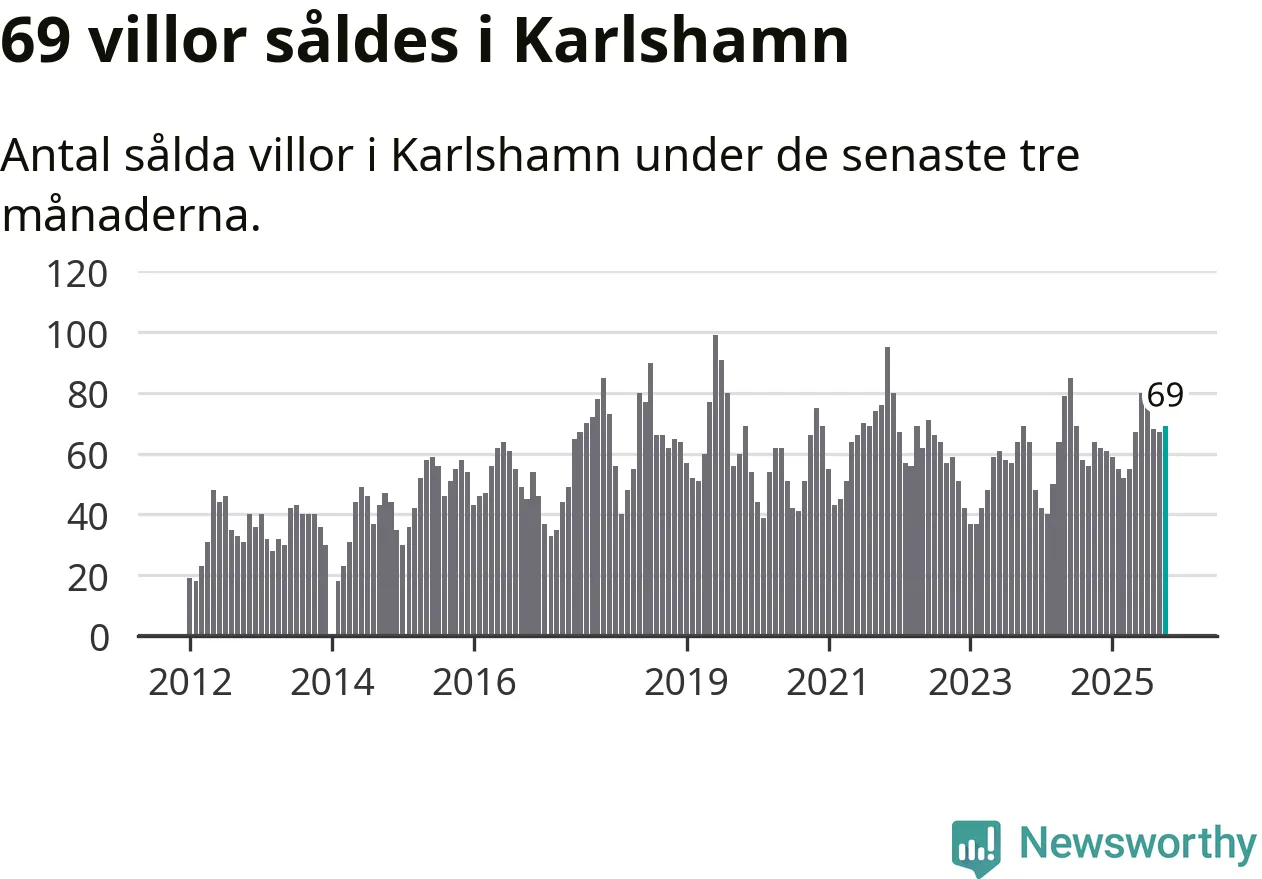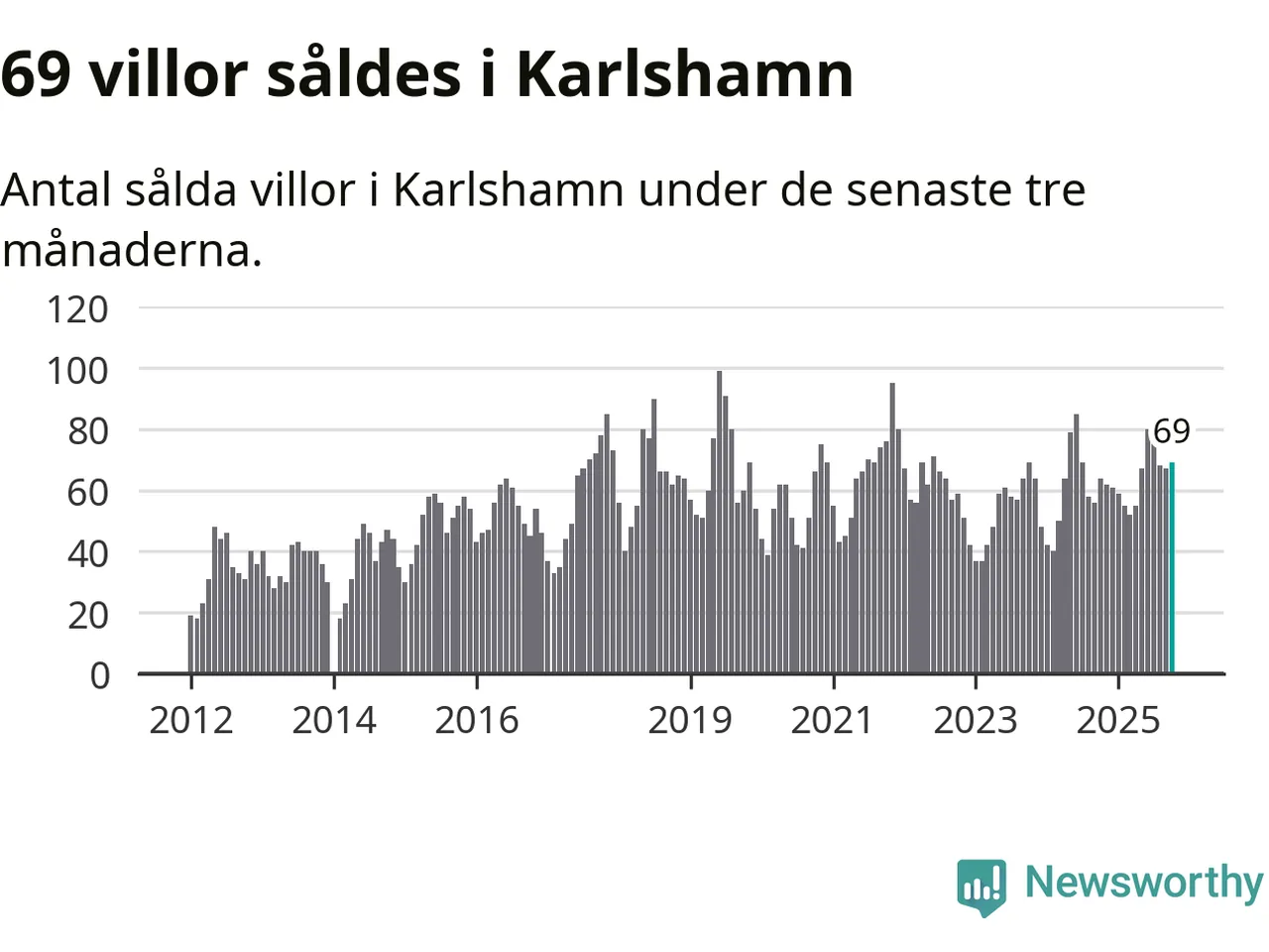 Sammanlagt såldes 69 villor i Karlshamns kommun mellan augusti och oktober till ett genomsnittligt pris på 2,2 miljoner kronor. I fjol gjordes 64 affärer vid den här tiden på året.
