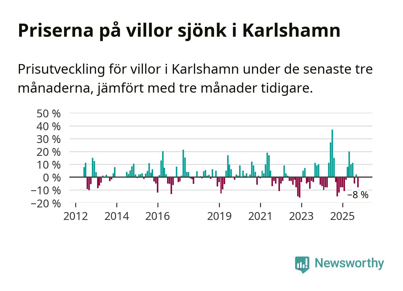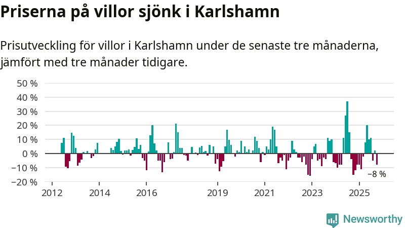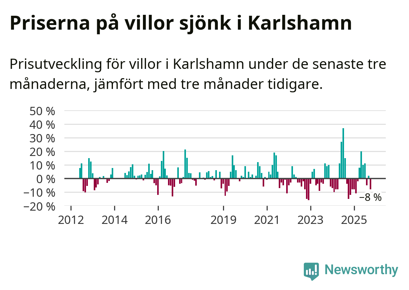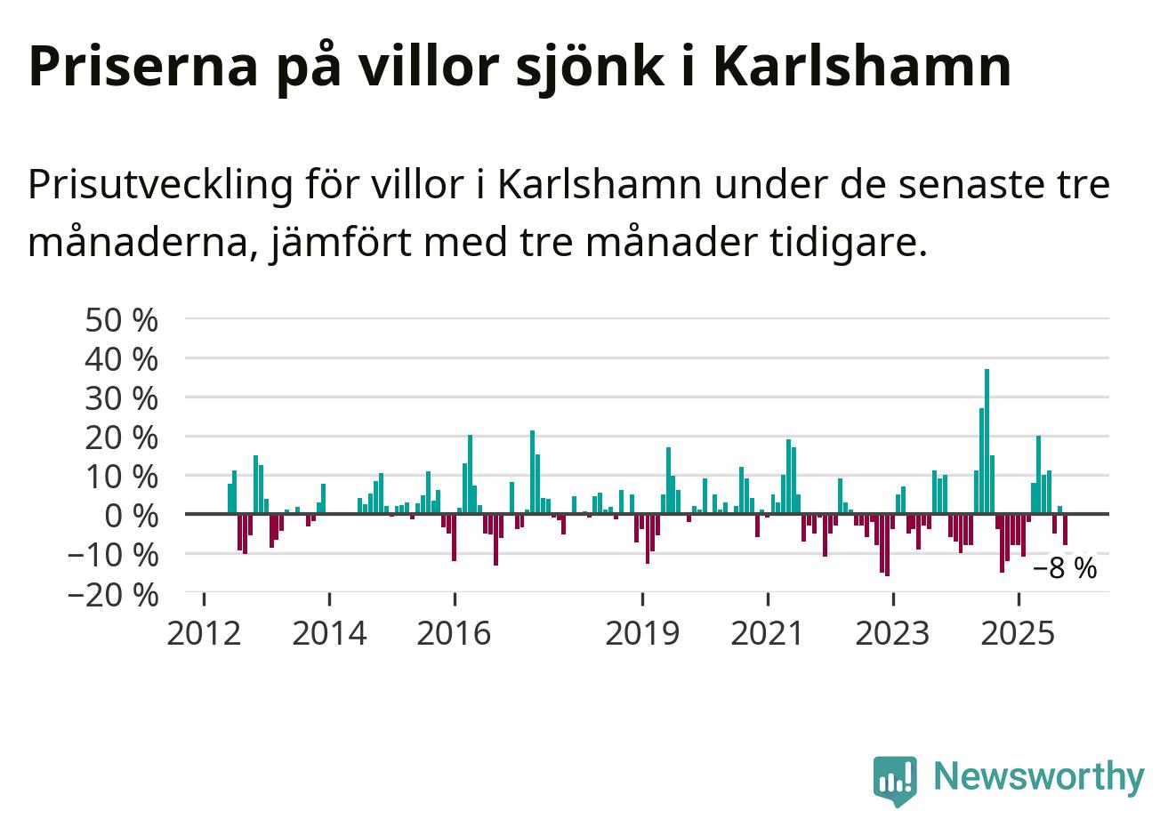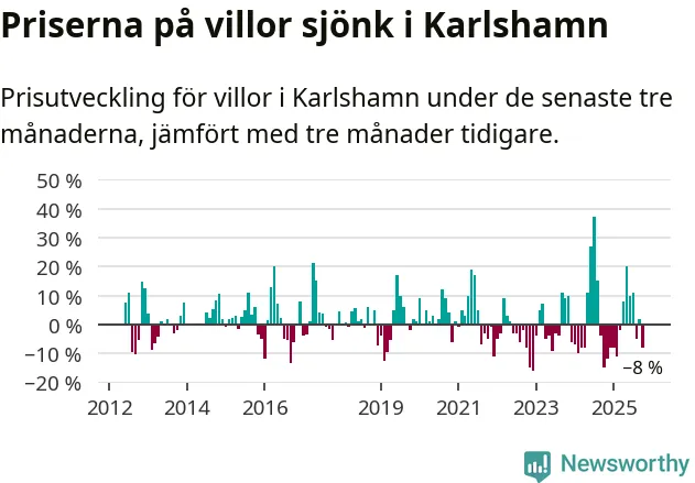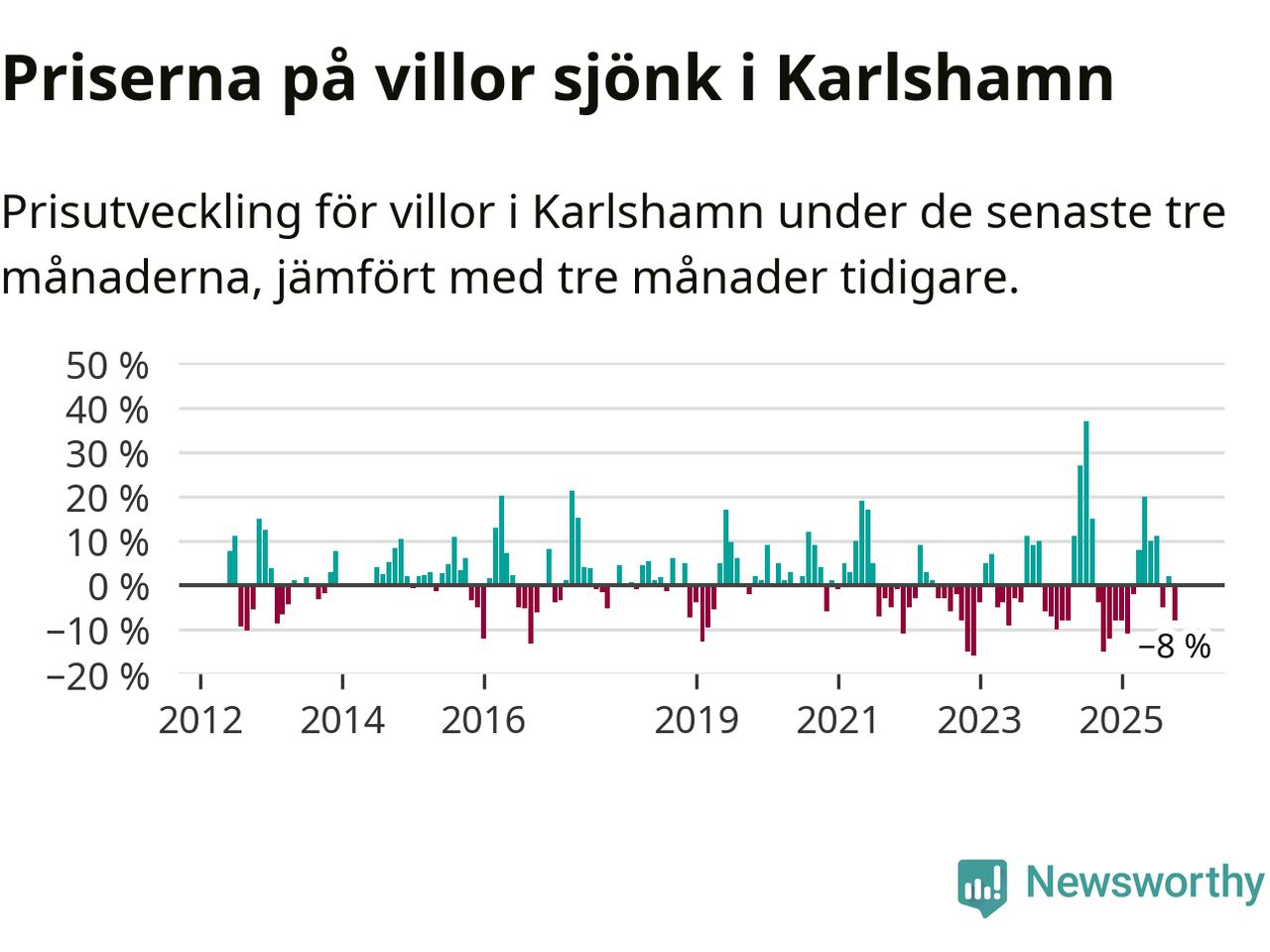 Villapriserna har gått ner i Karlshamns kommun. Medelpriset på försäljningarna under de senaste tre månaderna visar på en nedgång med 8 procent.