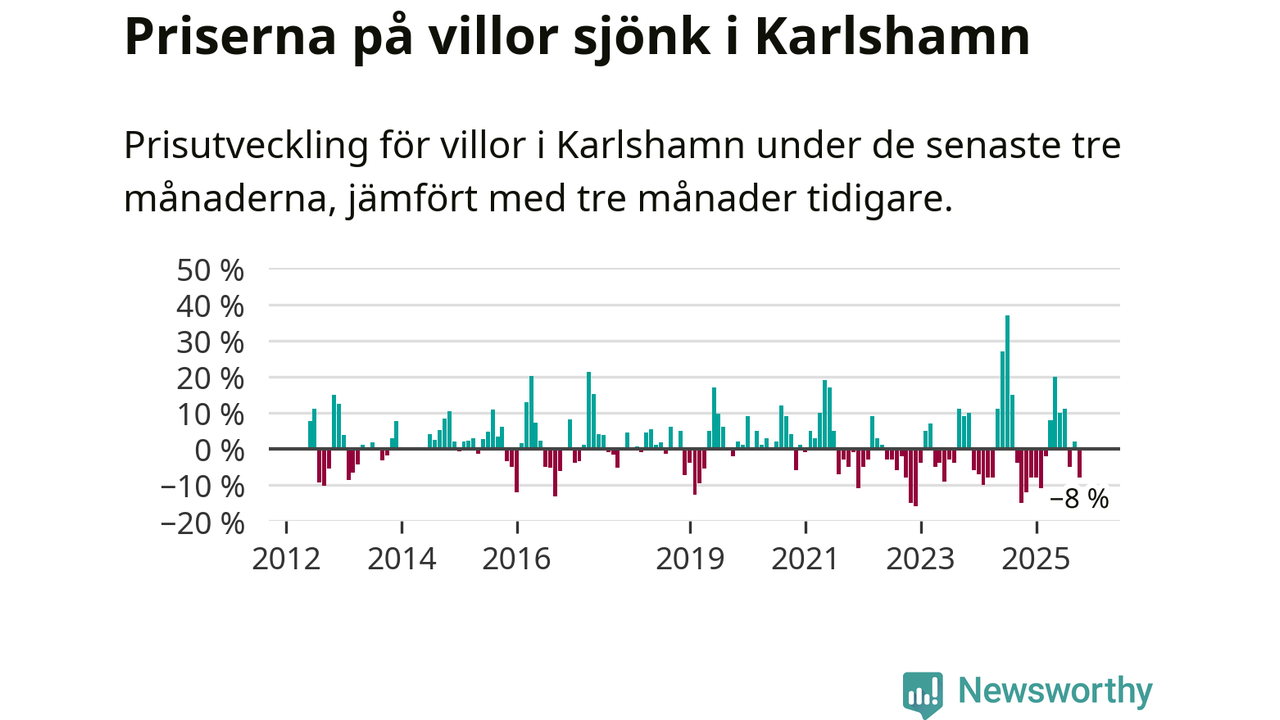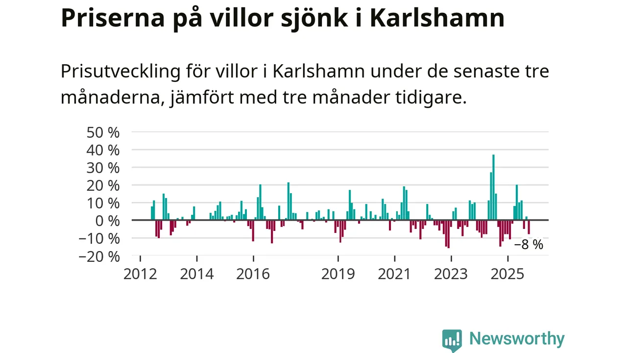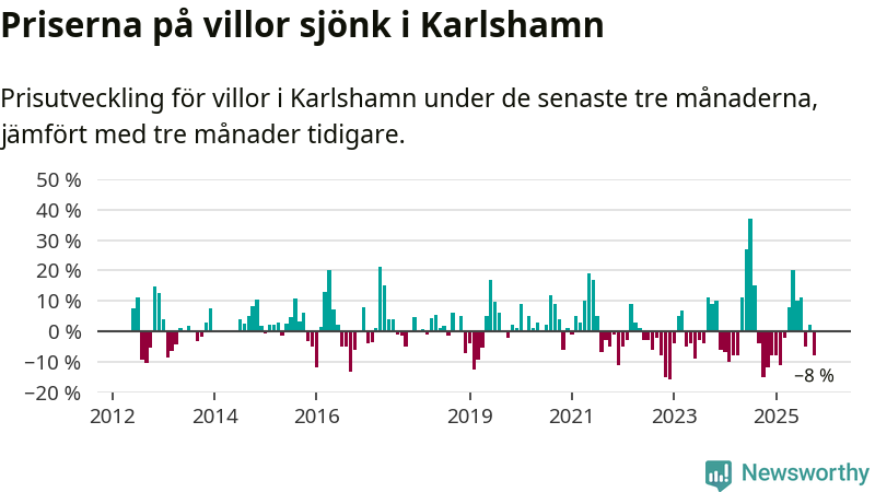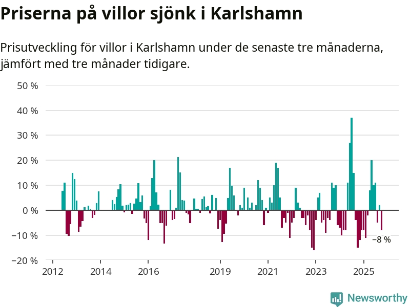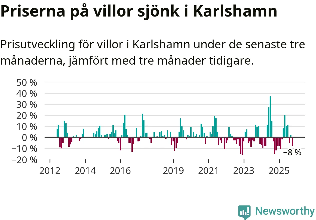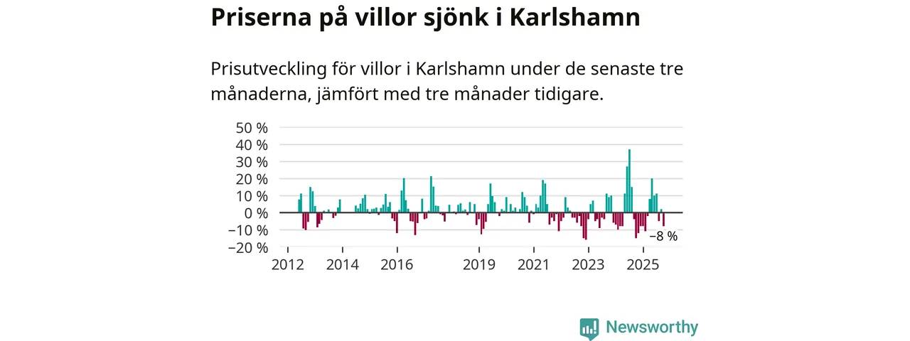 Villapriserna har gått ner i Karlshamns kommun. Medelpriset på försäljningarna under de senaste tre månaderna visar på en nedgång med 8 procent.