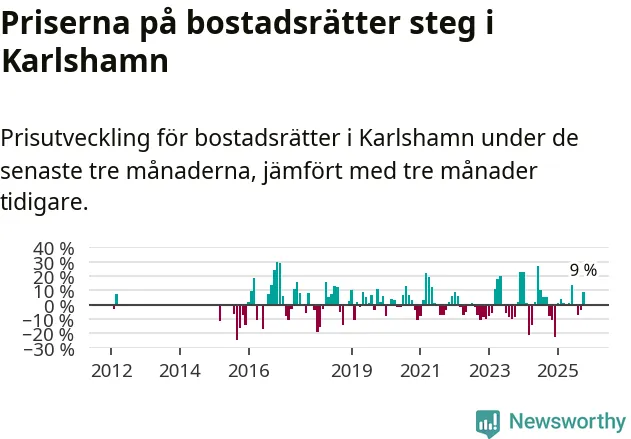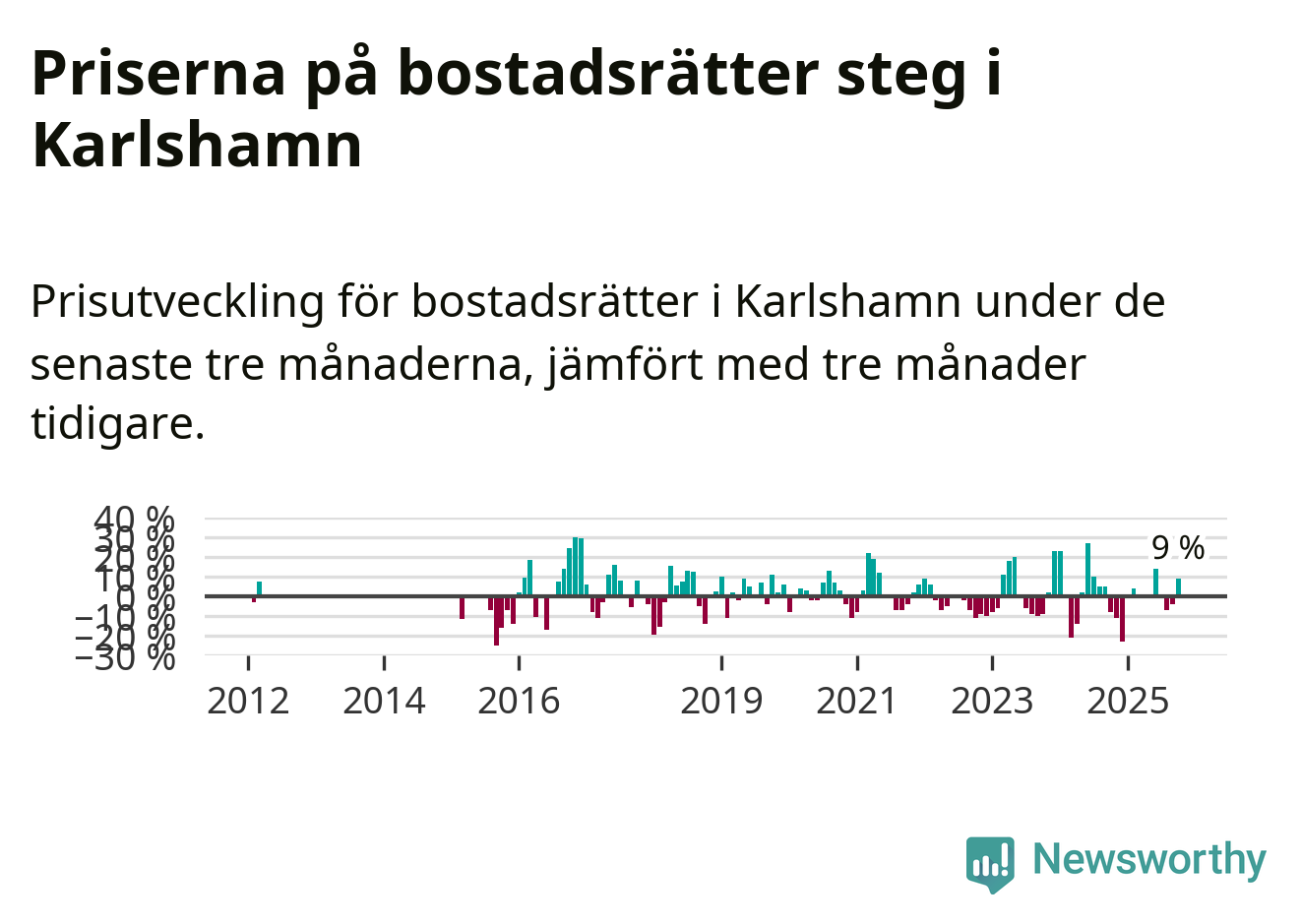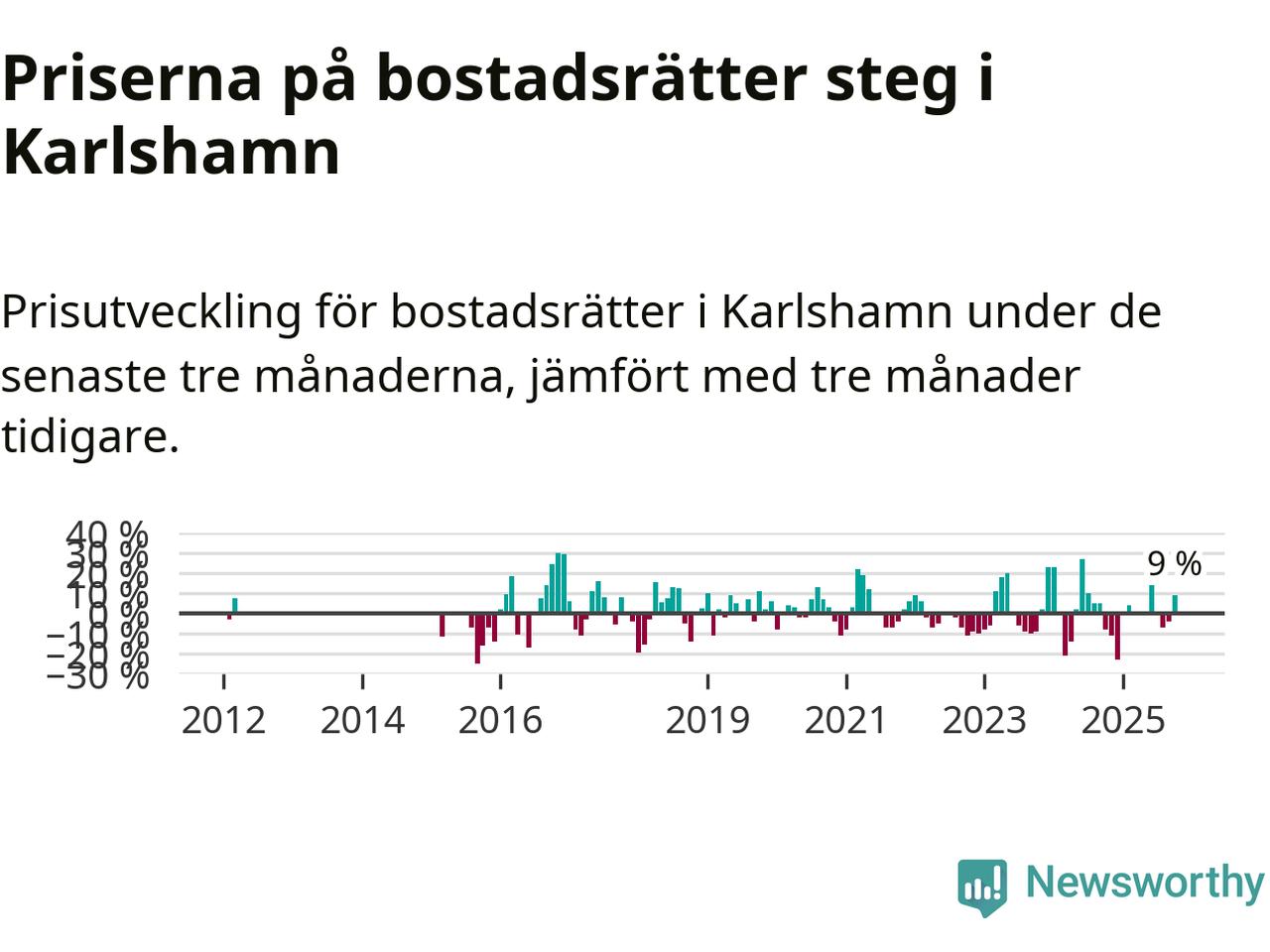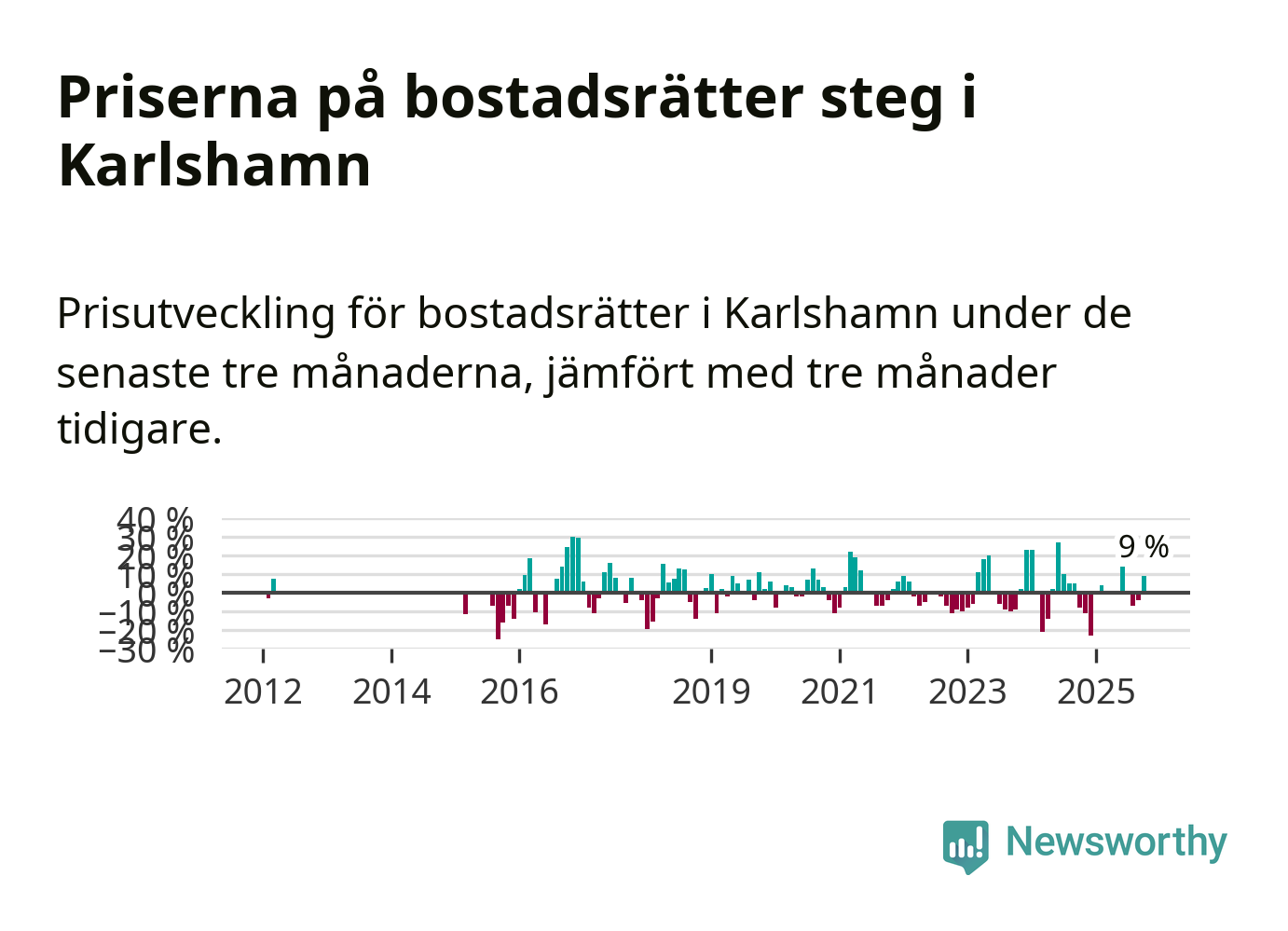 Priserna på bostadsrätter har gått upp i Karlshamns kommun. Medelpriset på försäljningarna under de senaste tre månaderna visar på en uppgång med 9 procent.