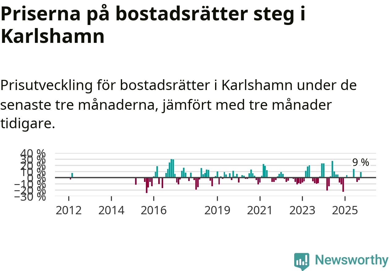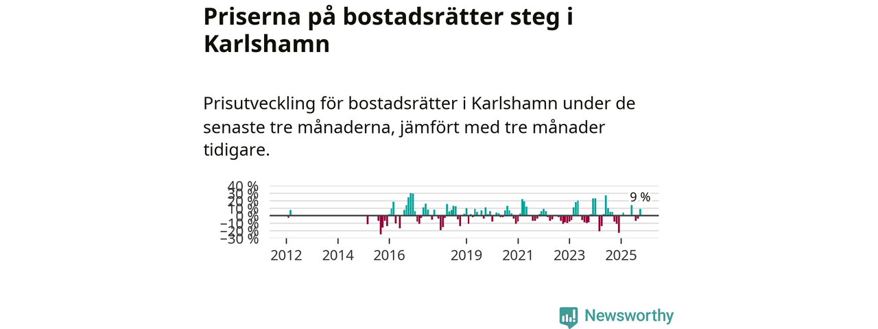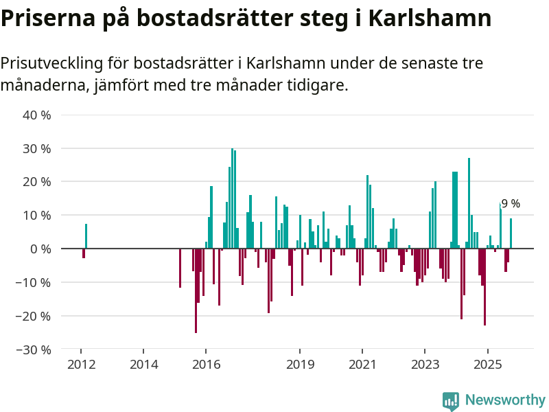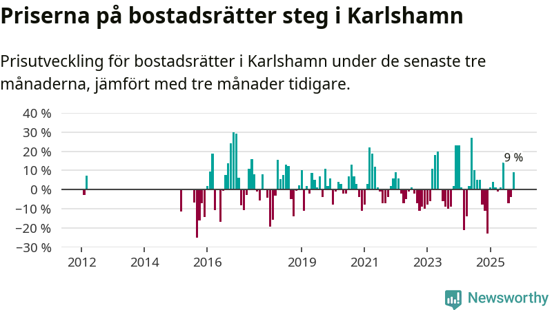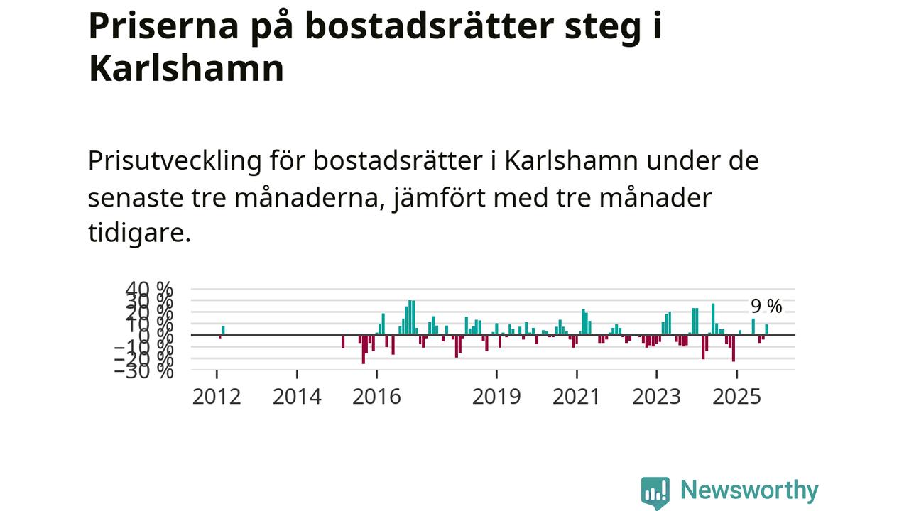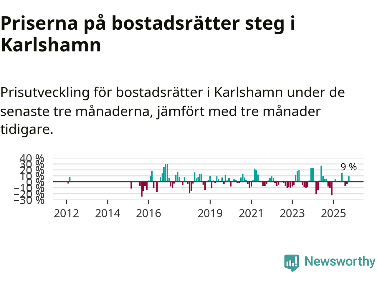 Priserna på bostadsrätter har gått upp i Karlshamns kommun. Medelpriset på försäljningarna under de senaste tre månaderna visar på en uppgång med 9 procent.