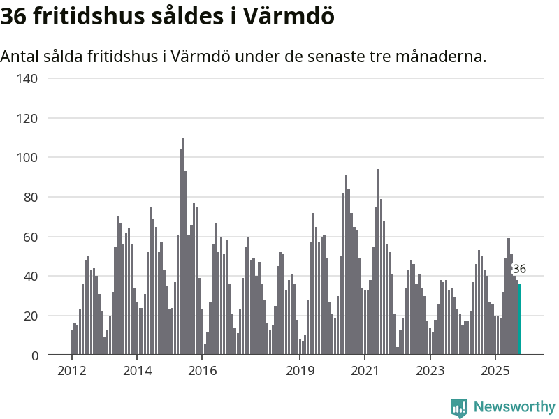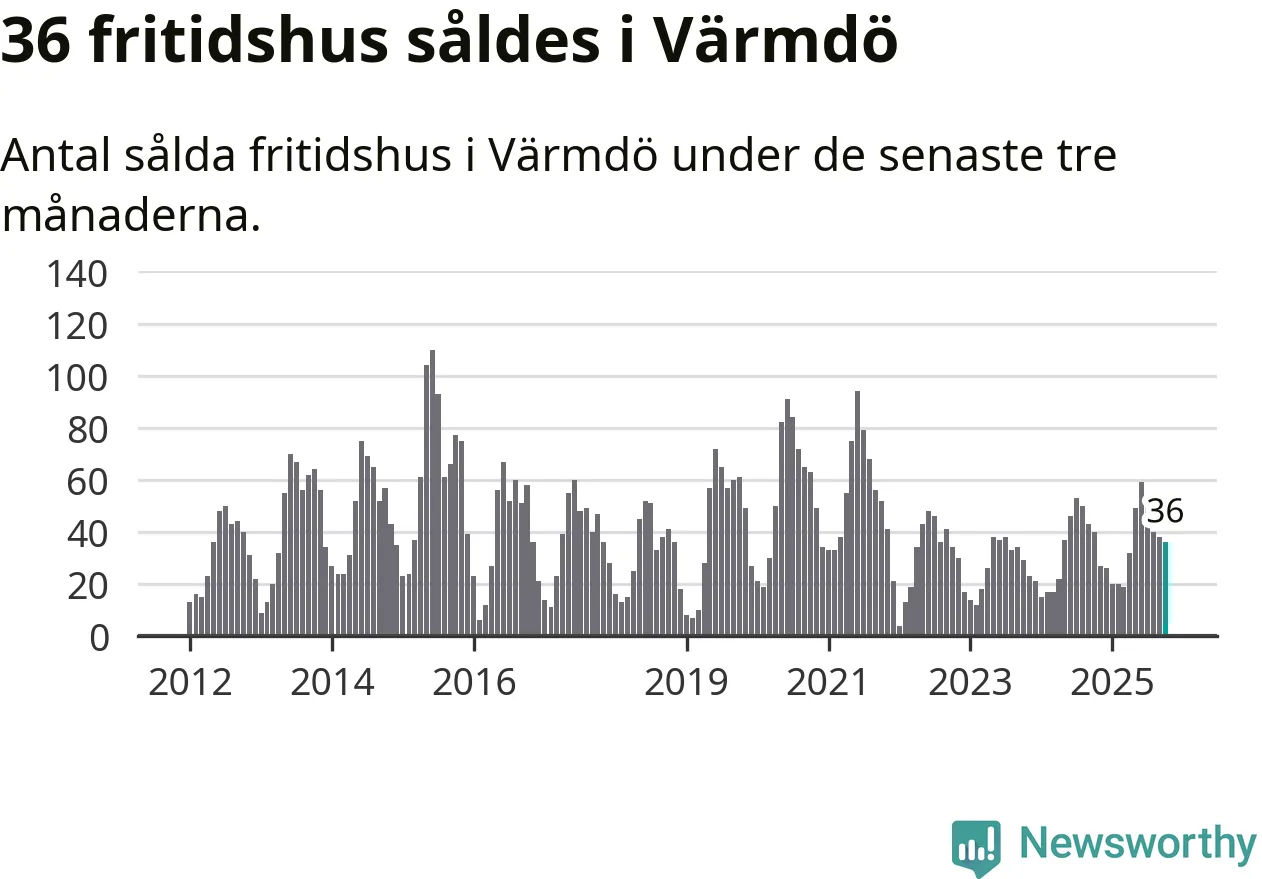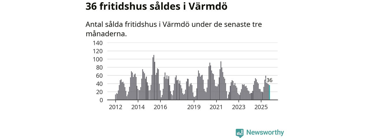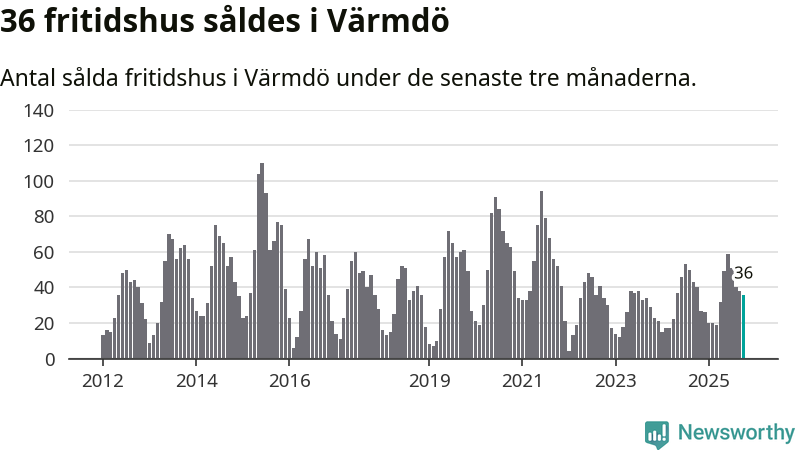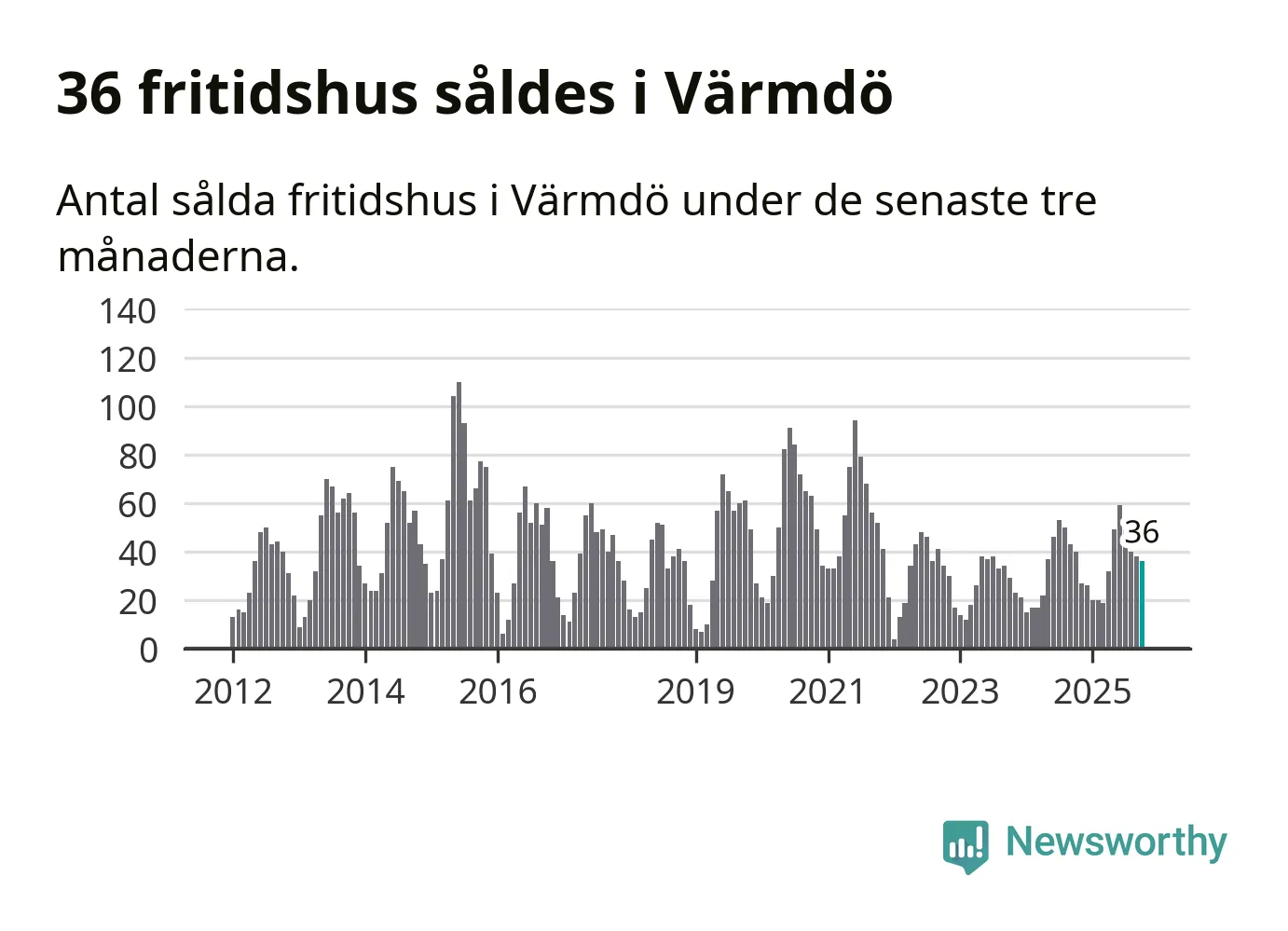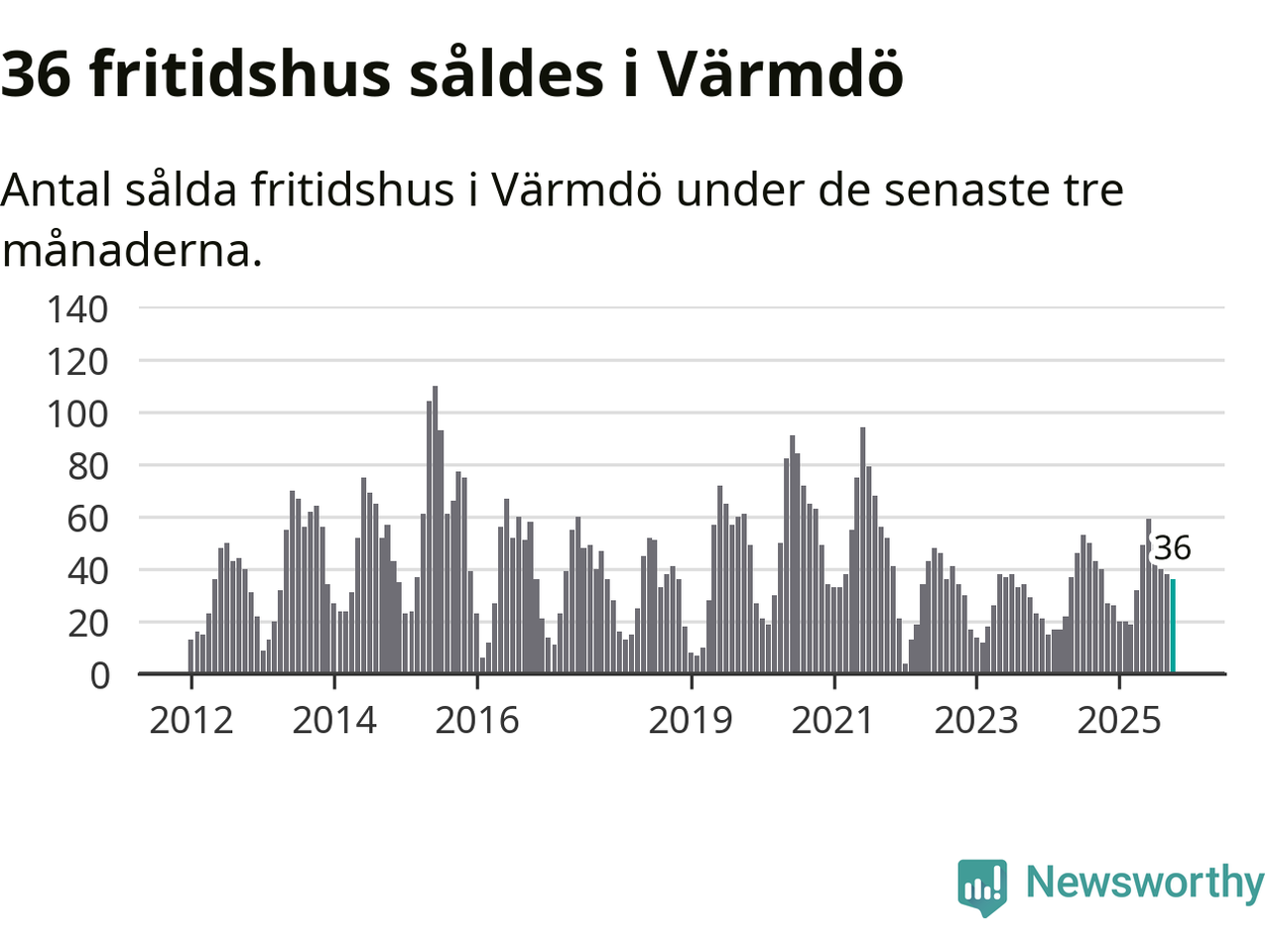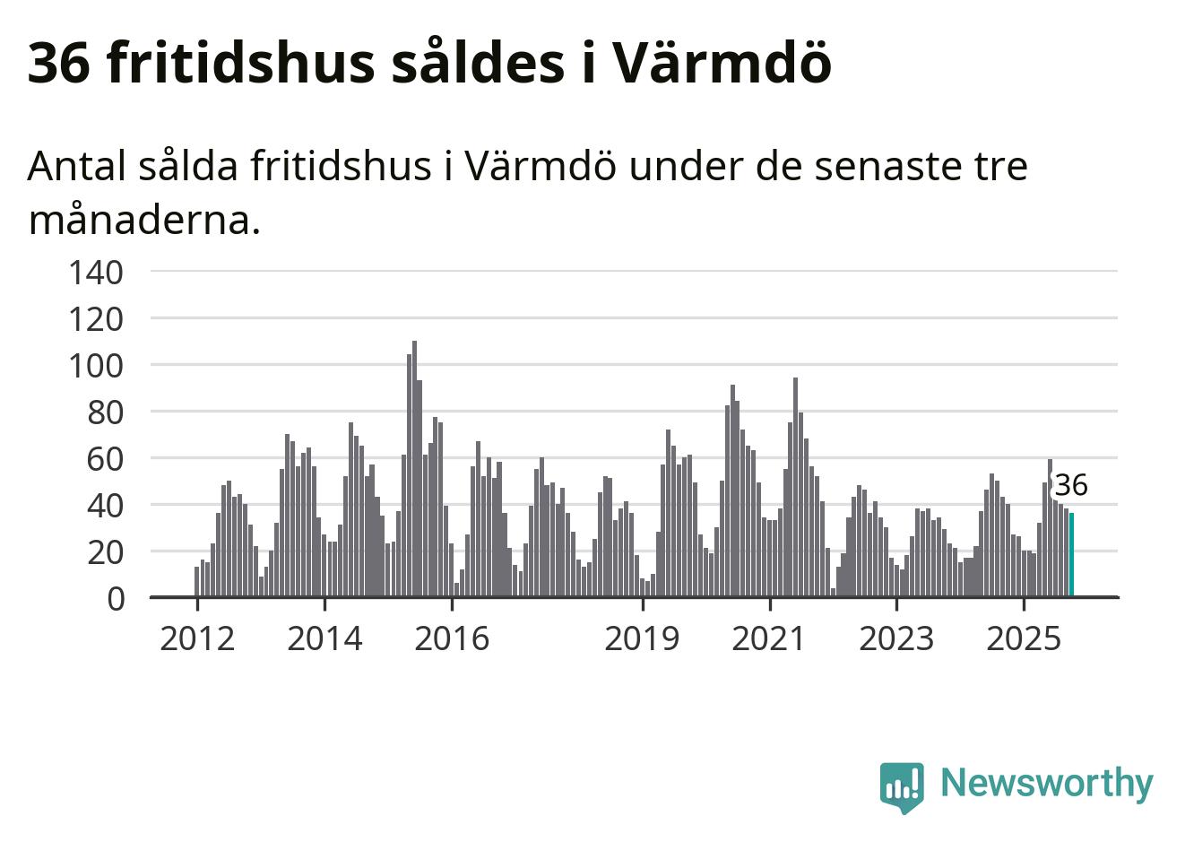 Sammanlagt såldes 36 fritidshus i Värmdö kommun mellan augusti och oktober till ett genomsnittligt pris på 6,0 miljoner kronor. I fjol gjordes 40 affärer vid den här tiden på året.