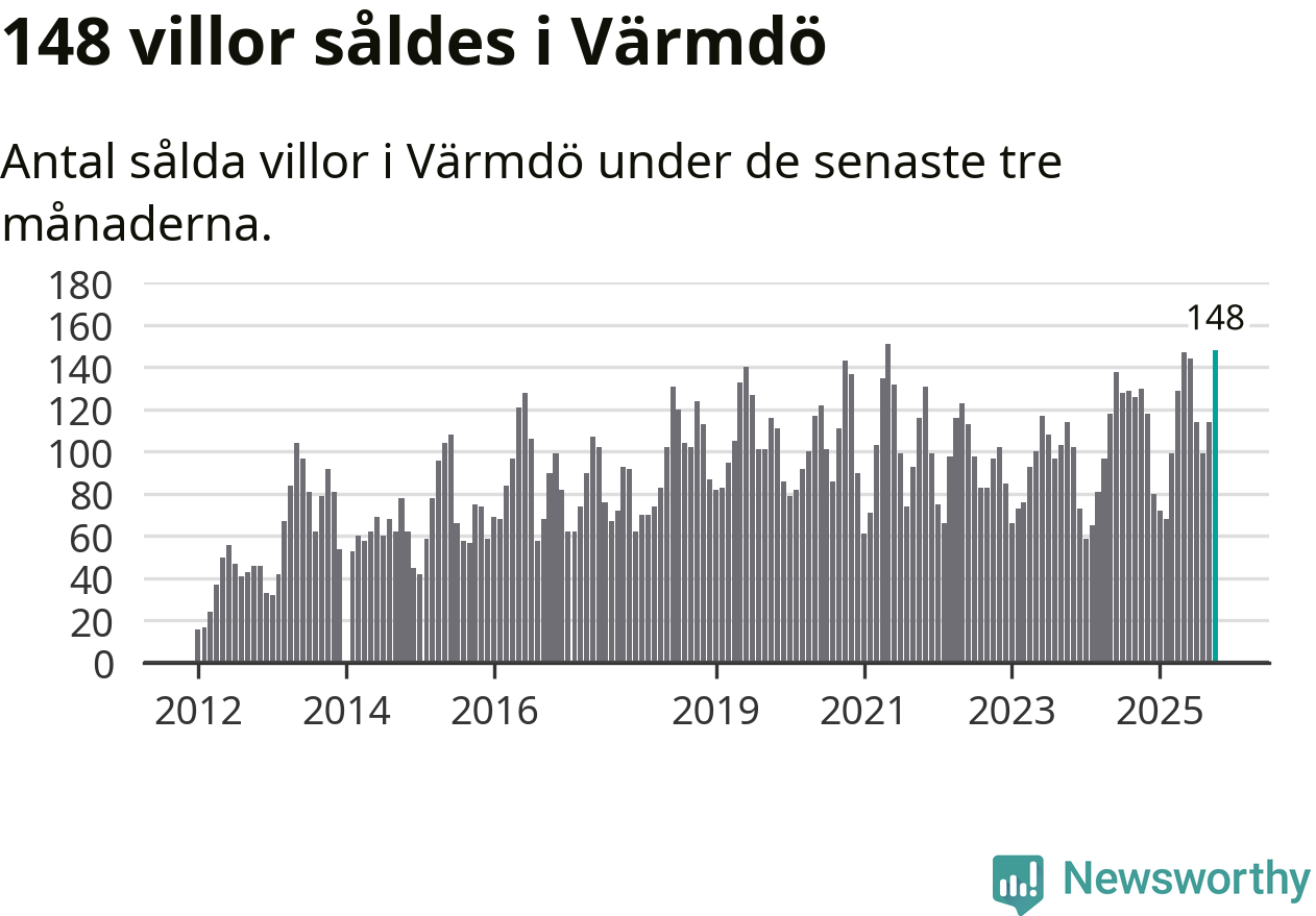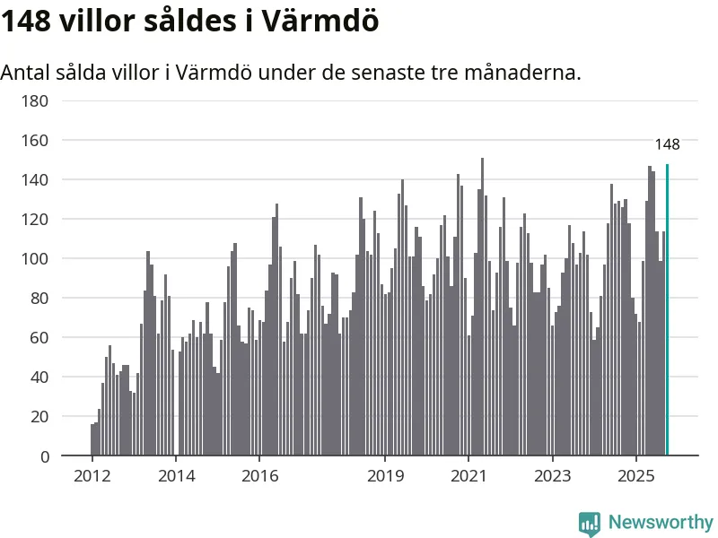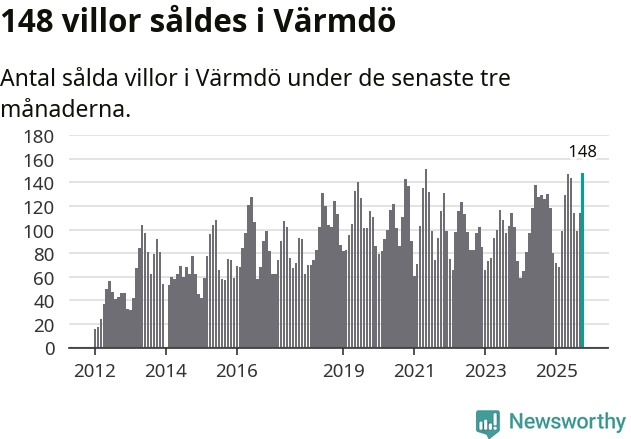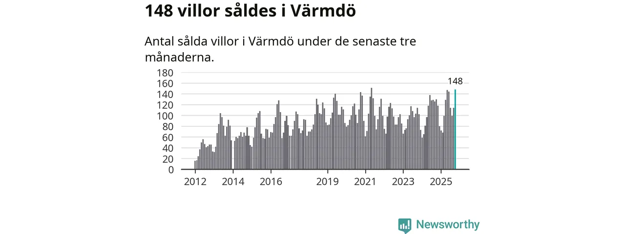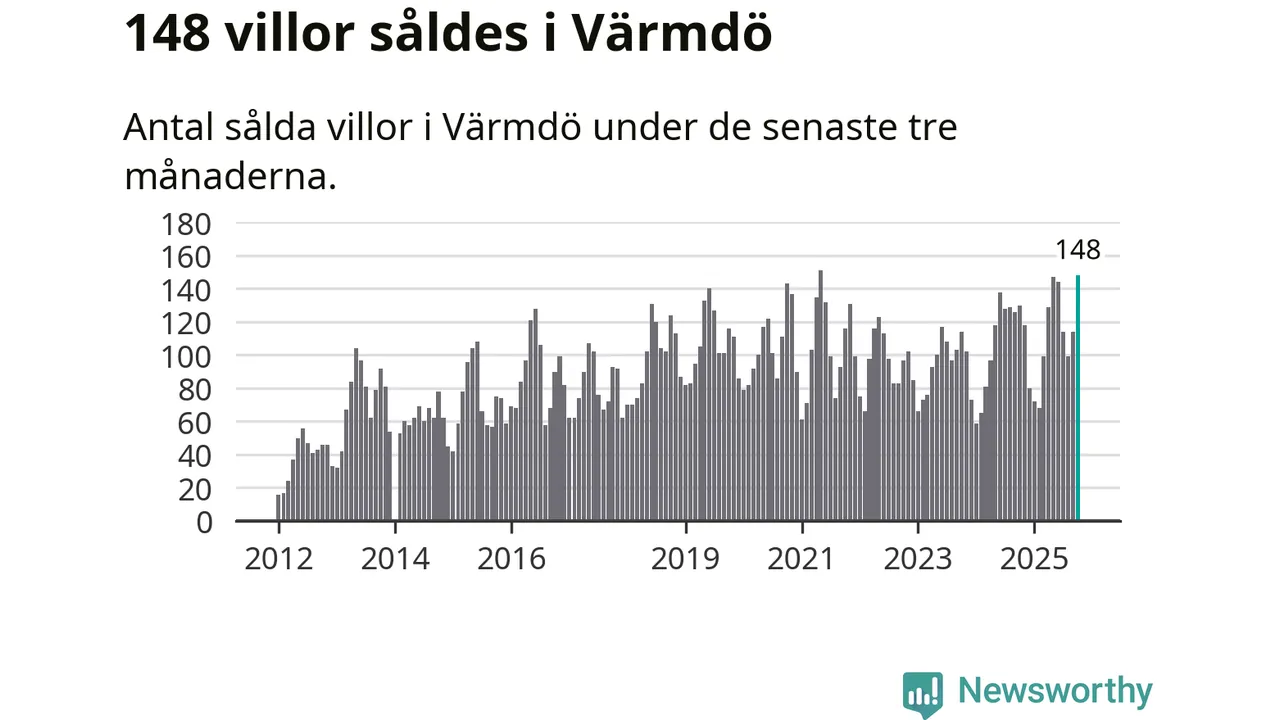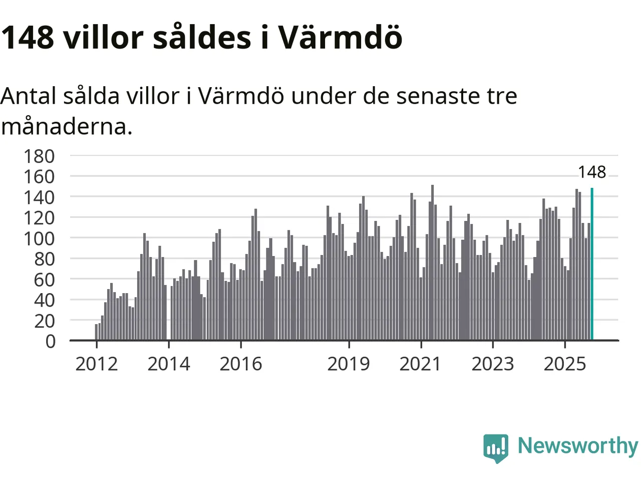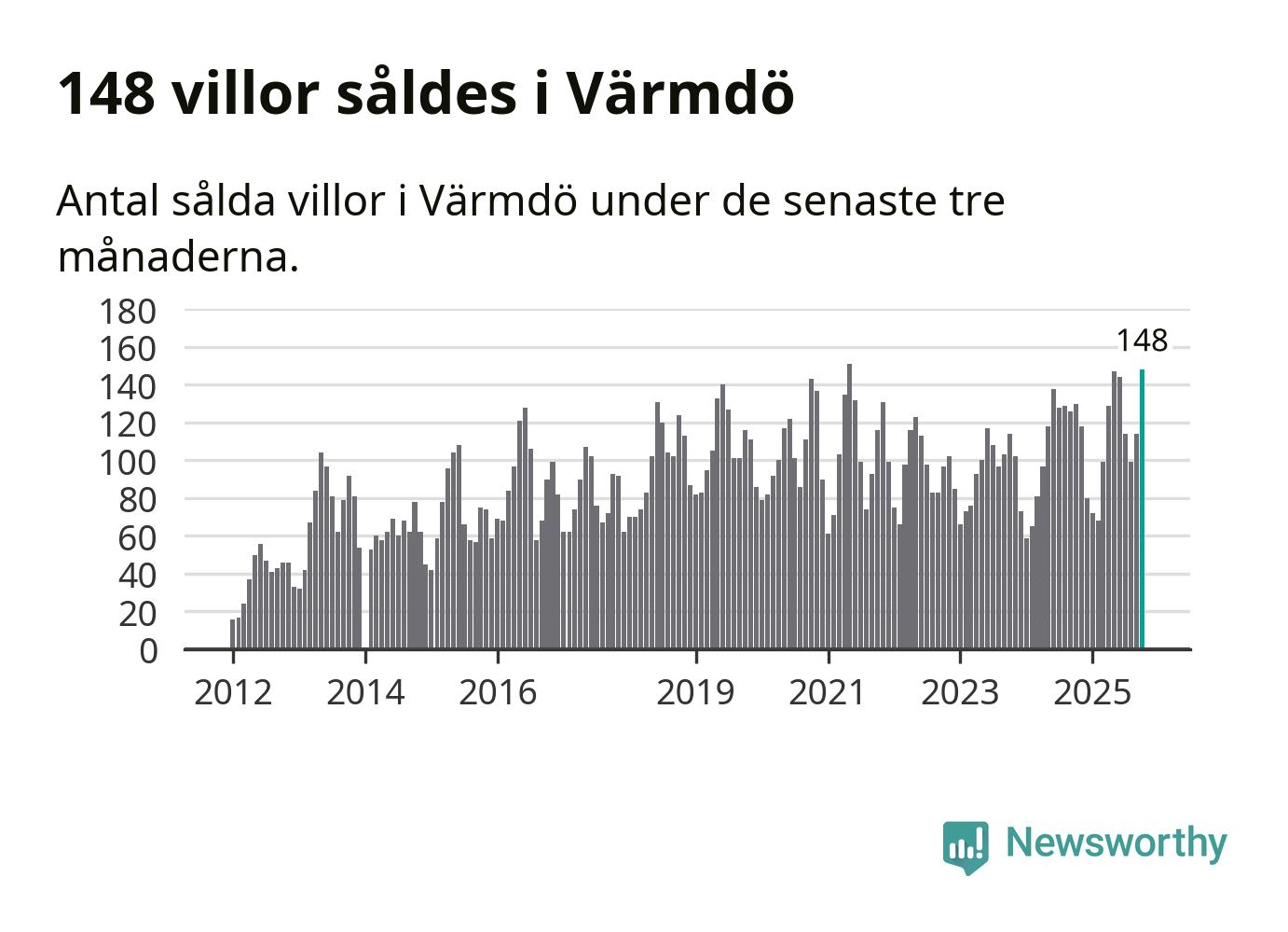 Sammanlagt såldes 148 villor i Värmdö kommun mellan augusti och oktober till ett genomsnittligt pris på 6,9 miljoner kronor. Det är fler försäljningar än på fyra år. I fjol gjordes 130 affärer vid den här tiden på året.