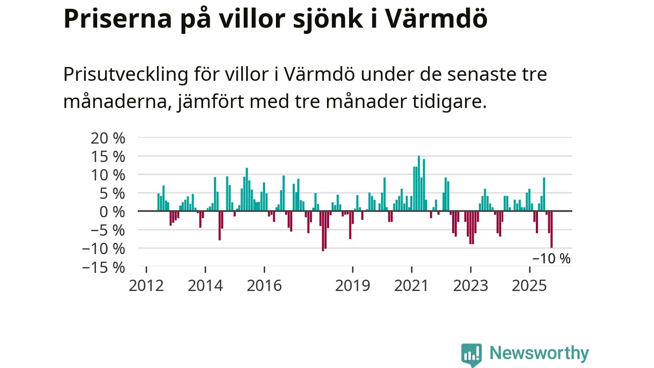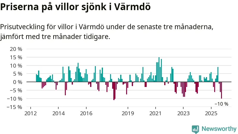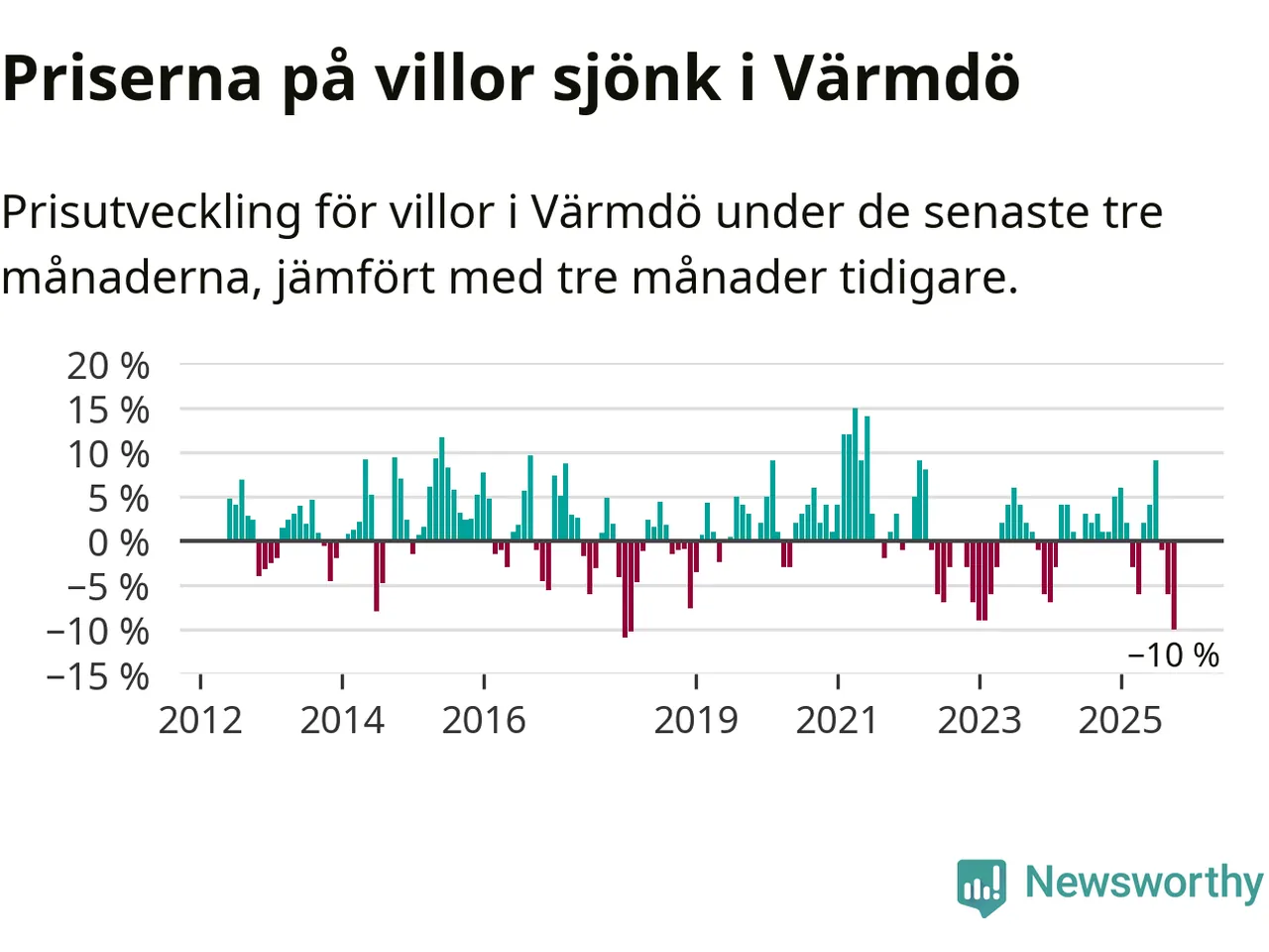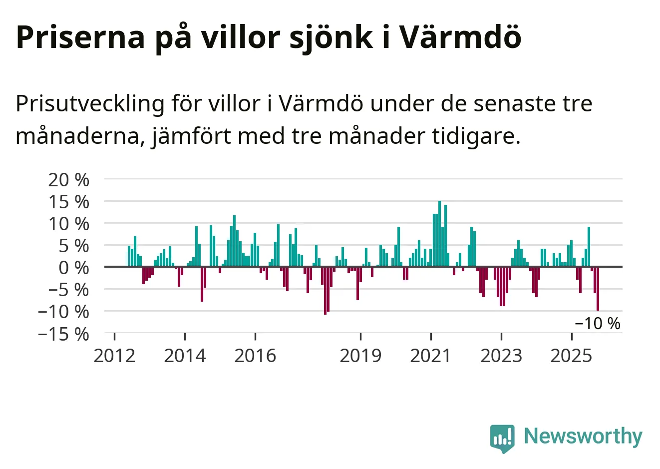 Villapriserna sjönk med tio procent i Värmdö kommun under de senaste tre månaderna. Det är den svagaste prisutvecklingen sedan 2018.