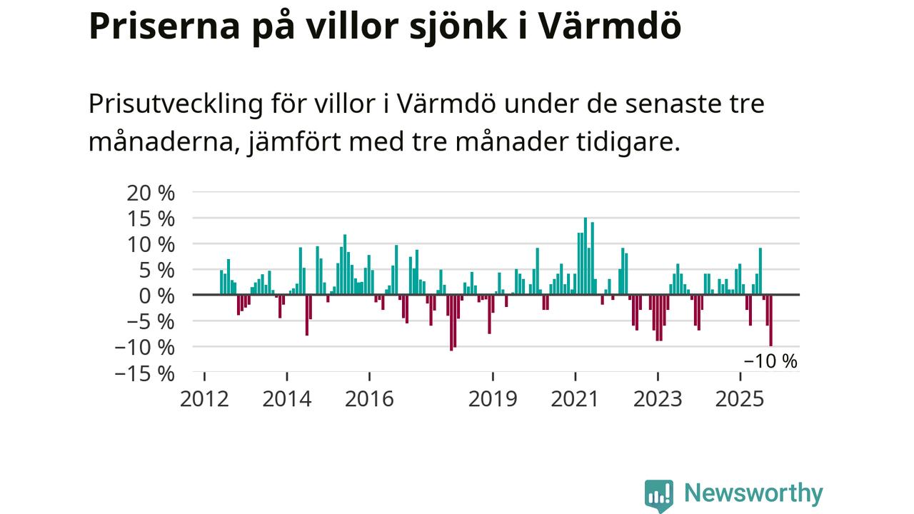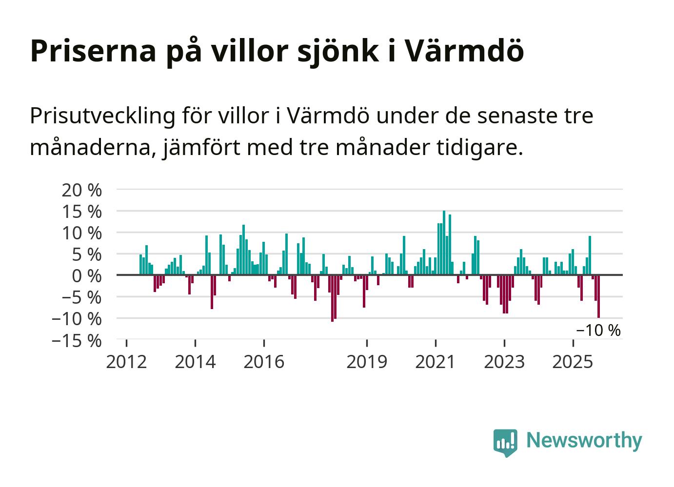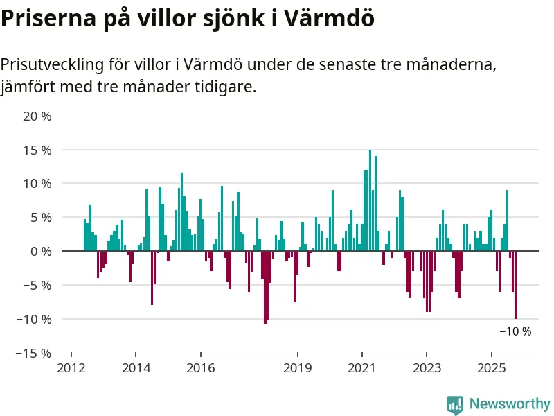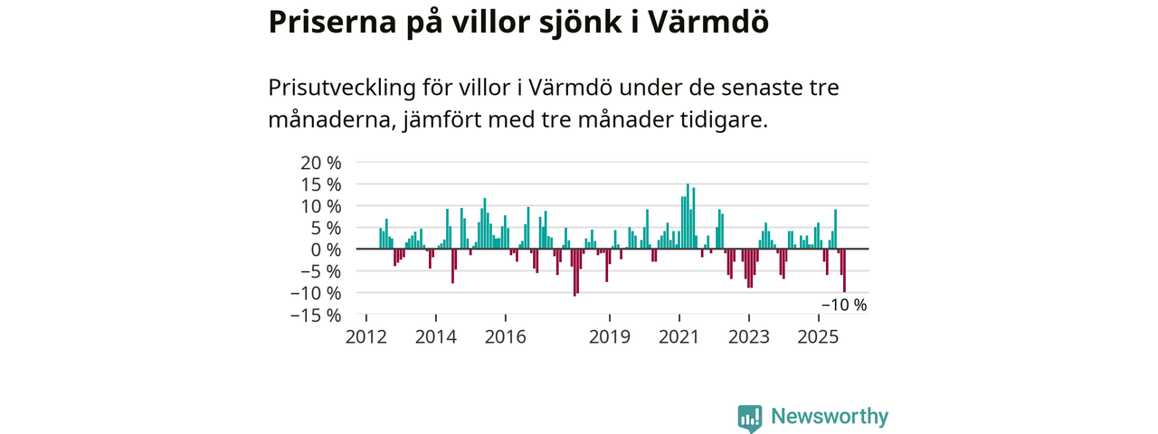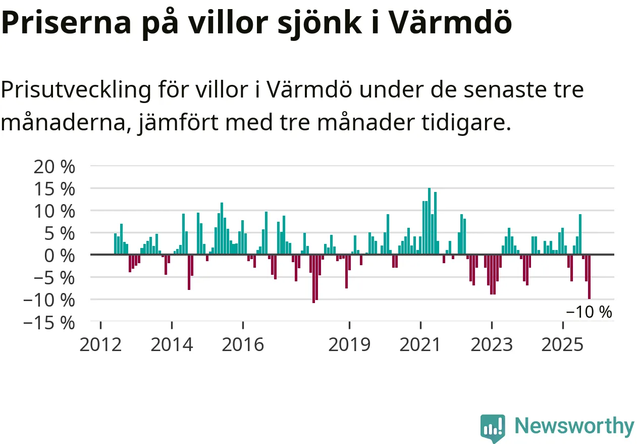 Villapriserna sjönk med tio procent i Värmdö kommun under de senaste tre månaderna. Det är den svagaste prisutvecklingen sedan 2018.