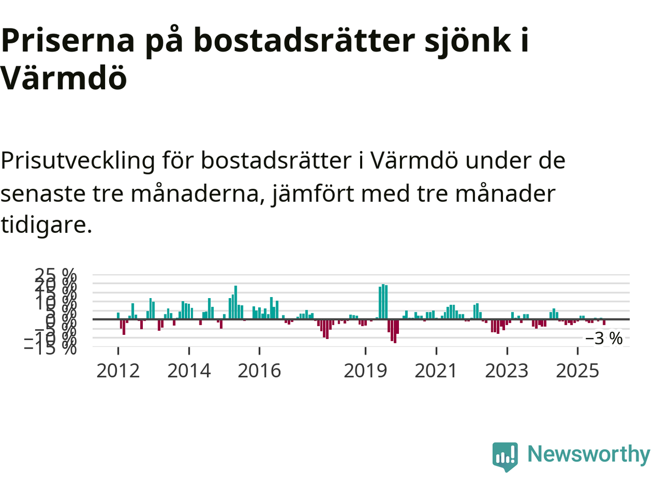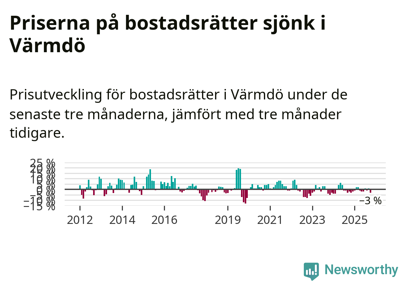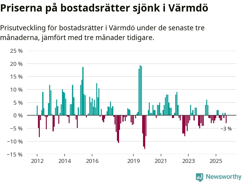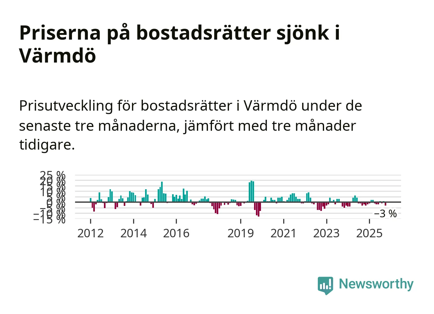 Priserna på bostadsrätter har gått ner i Värmdö kommun. Medelpriset på försäljningarna under de senaste tre månaderna visar på en nedgång med 3 procent.