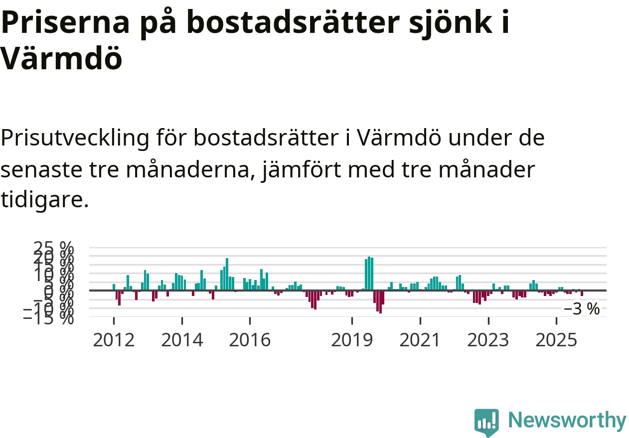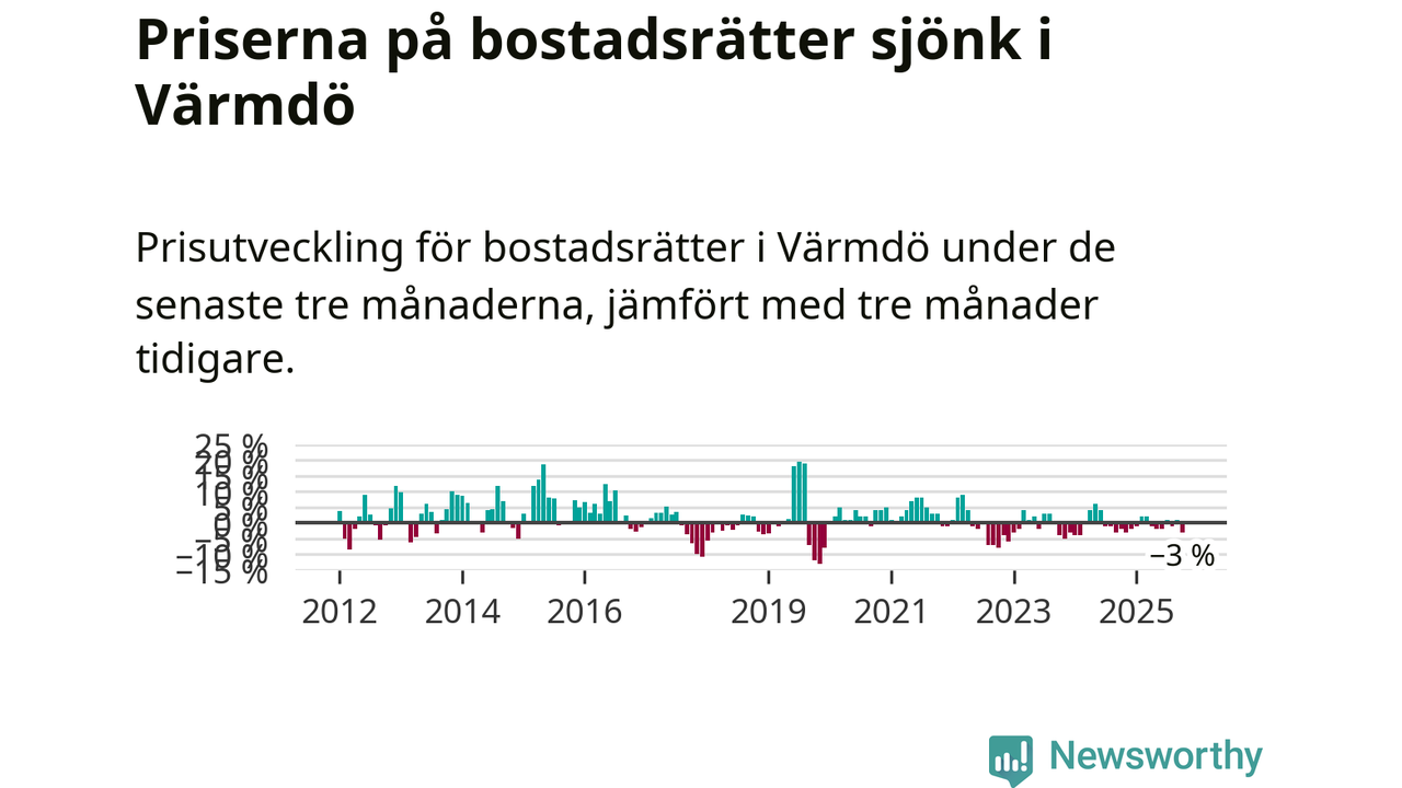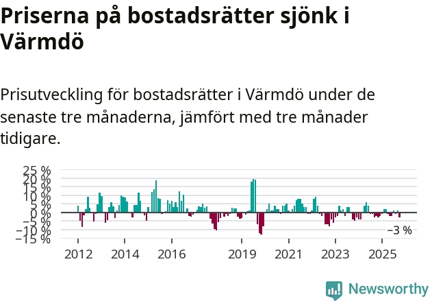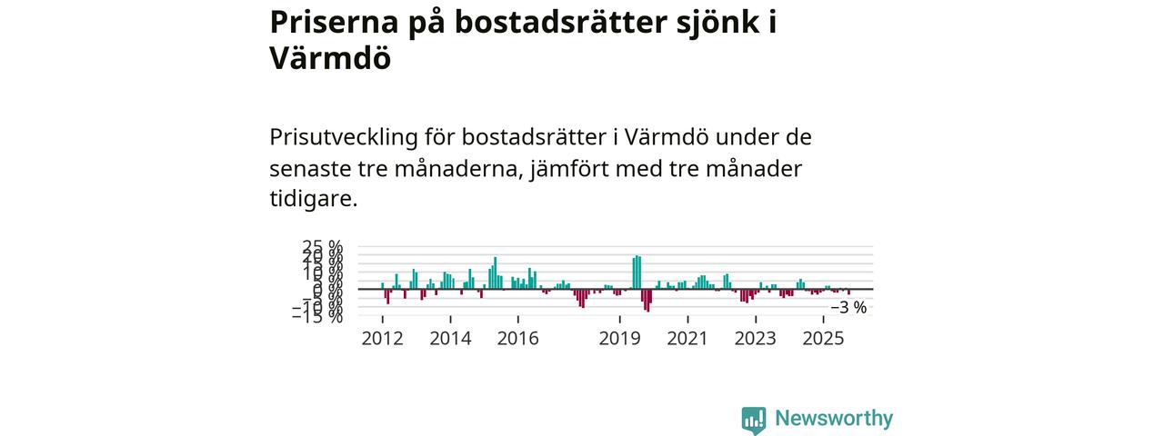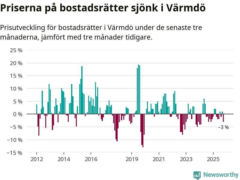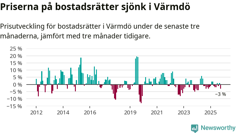 Priserna på bostadsrätter har gått ner i Värmdö kommun. Medelpriset på försäljningarna under de senaste tre månaderna visar på en nedgång med 3 procent.