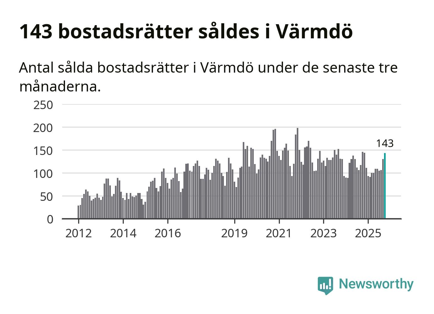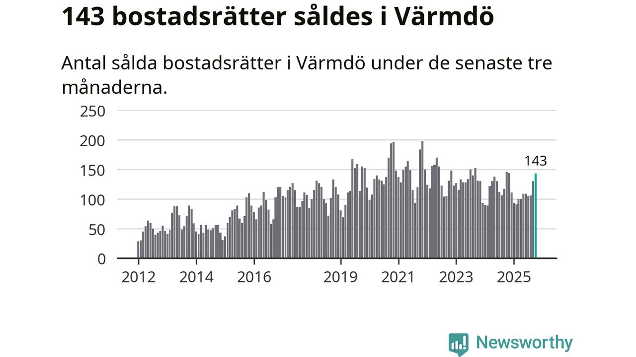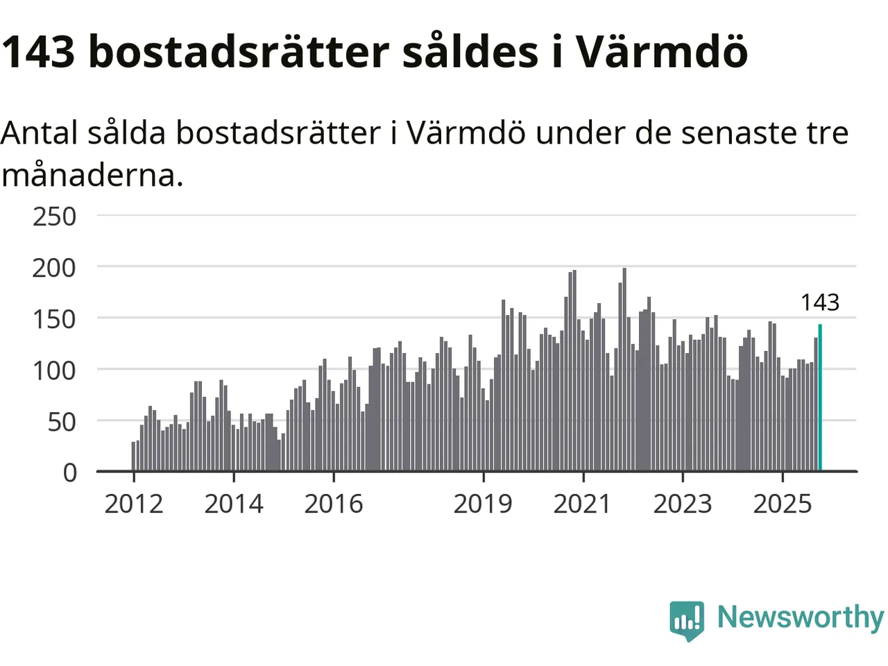 Sammanlagt såldes 143 bostadsrätter i Värmdö kommun mellan augusti och oktober till ett genomsnittligt pris på 3,4 miljoner kronor. I fjol gjordes 146 affärer vid den här tiden på året.