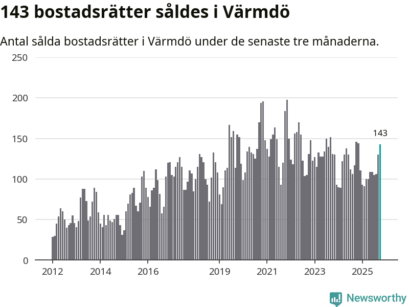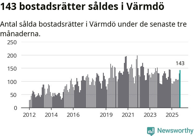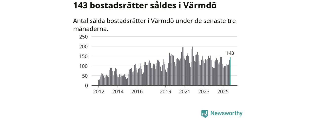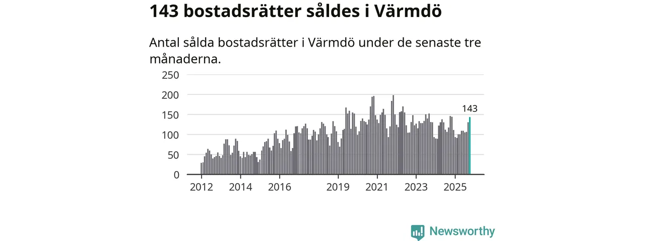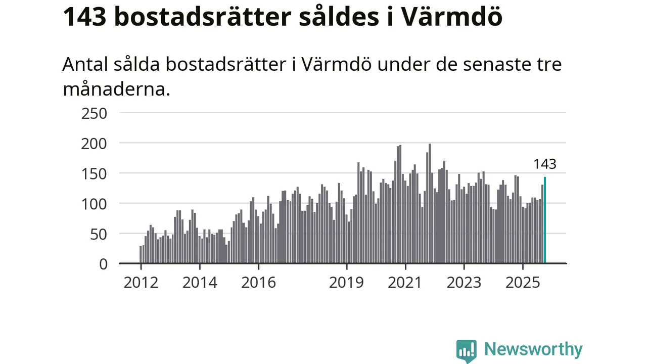 Sammanlagt såldes 143 bostadsrätter i Värmdö kommun mellan augusti och oktober till ett genomsnittligt pris på 3,4 miljoner kronor. I fjol gjordes 146 affärer vid den här tiden på året.