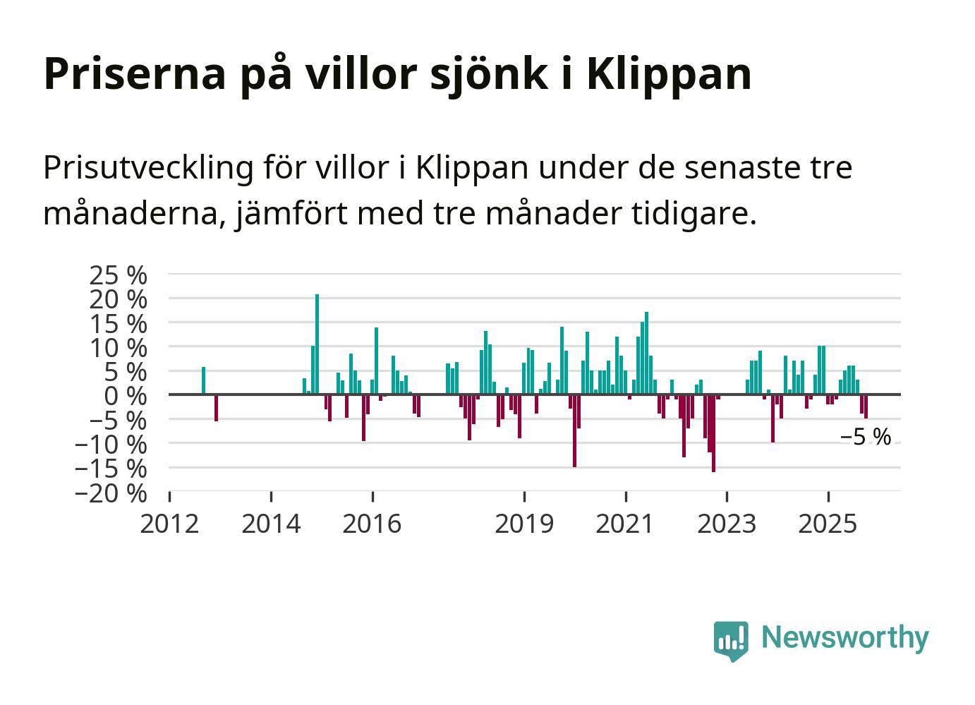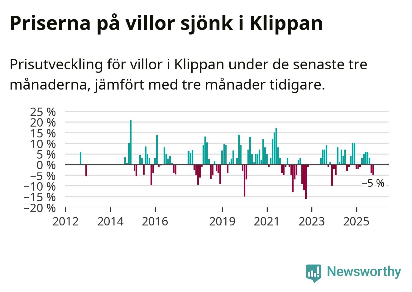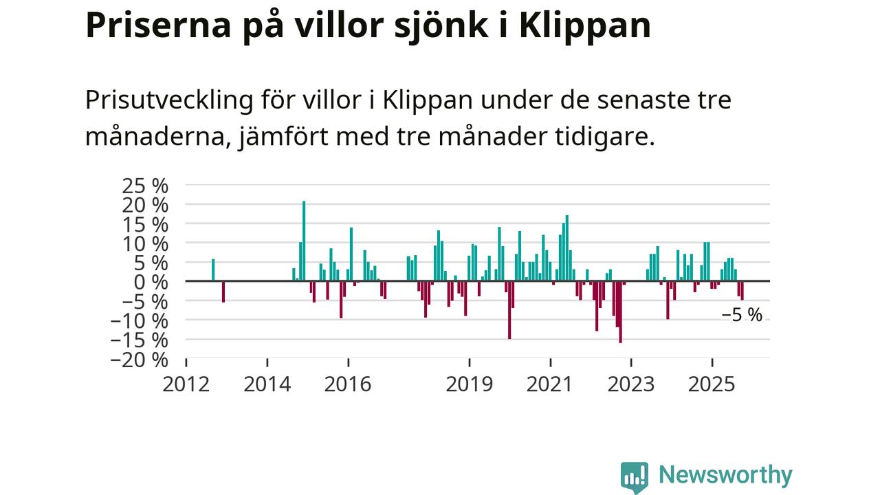 Villapriserna har gått ner i Klippans kommun. Medelpriset på försäljningarna under de senaste tre månaderna visar på en nedgång med 5 procent.