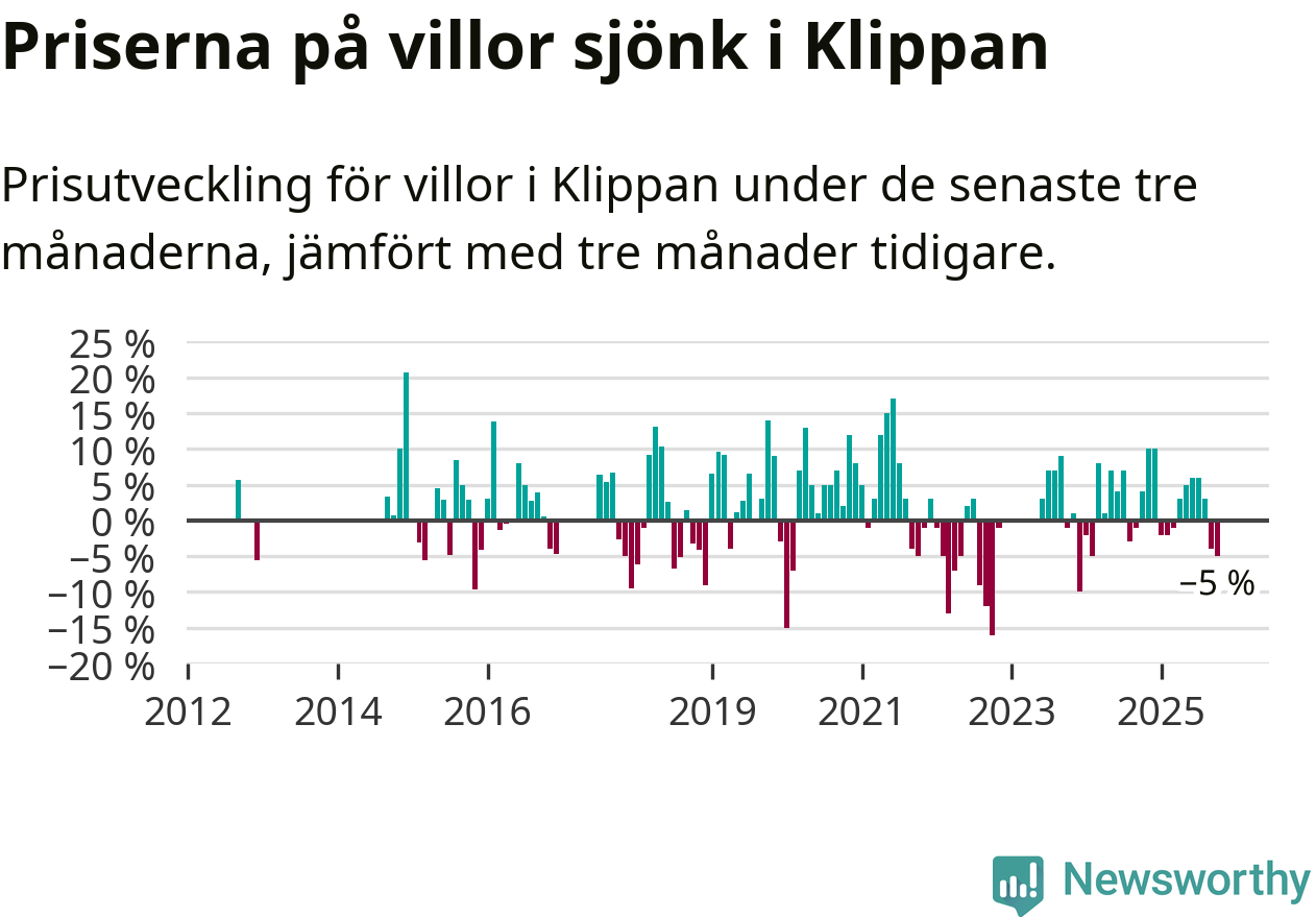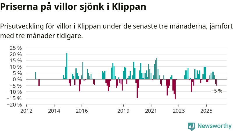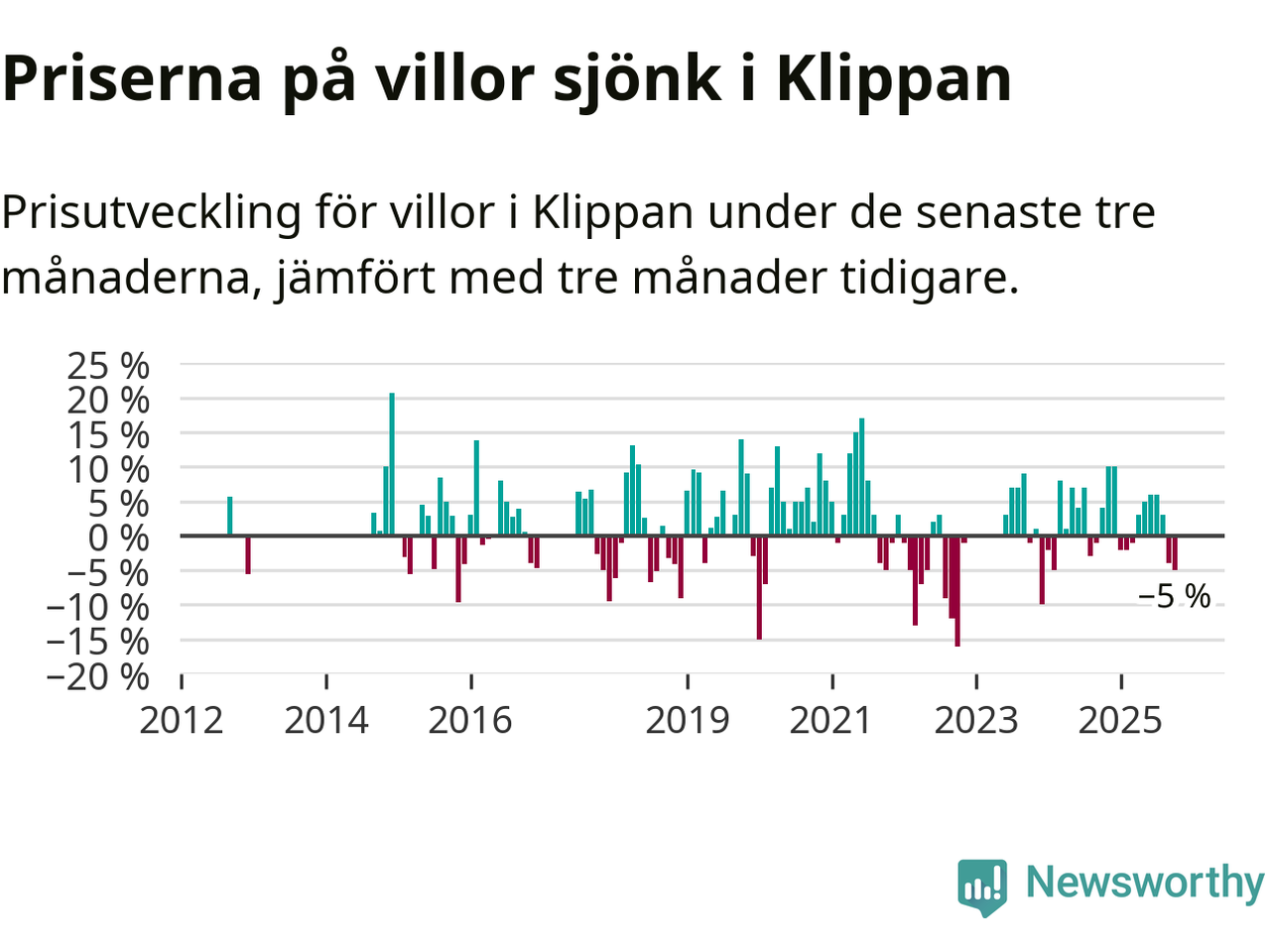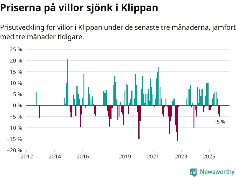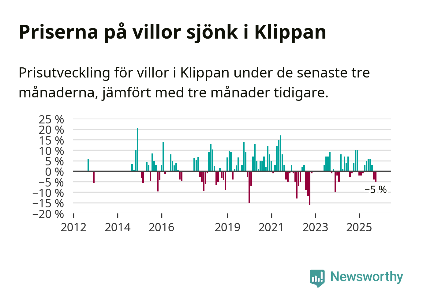 Villapriserna har gått ner i Klippans kommun. Medelpriset på försäljningarna under de senaste tre månaderna visar på en nedgång med 5 procent.