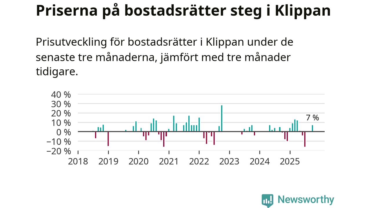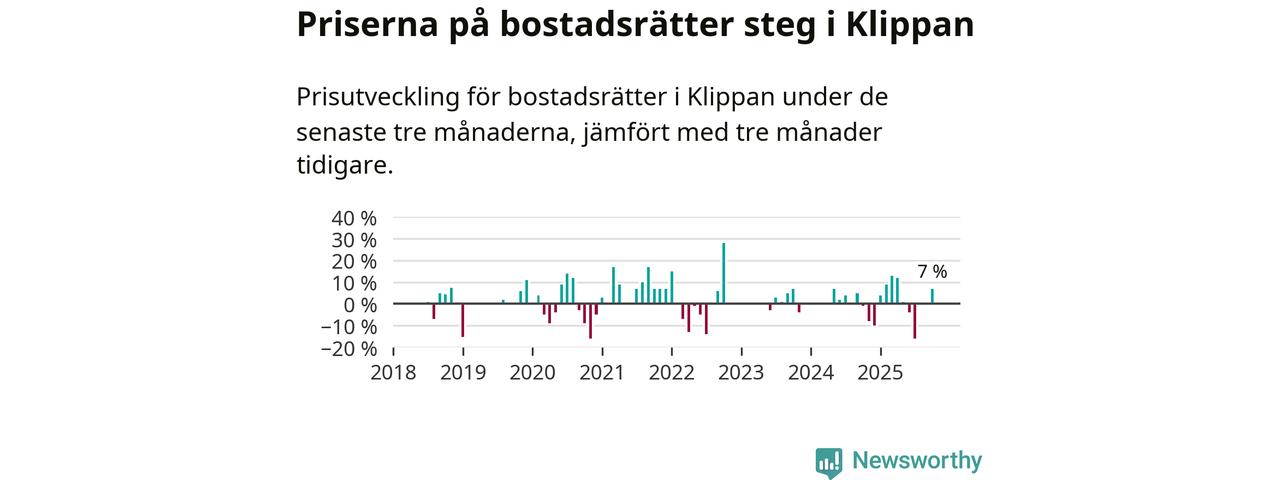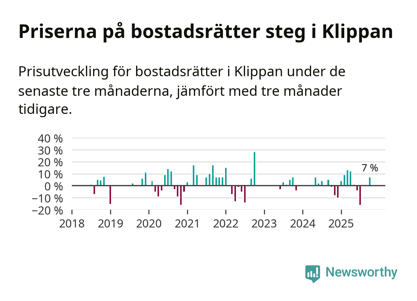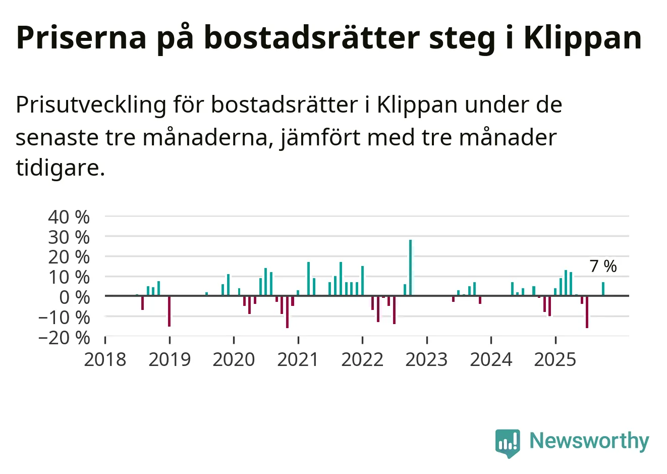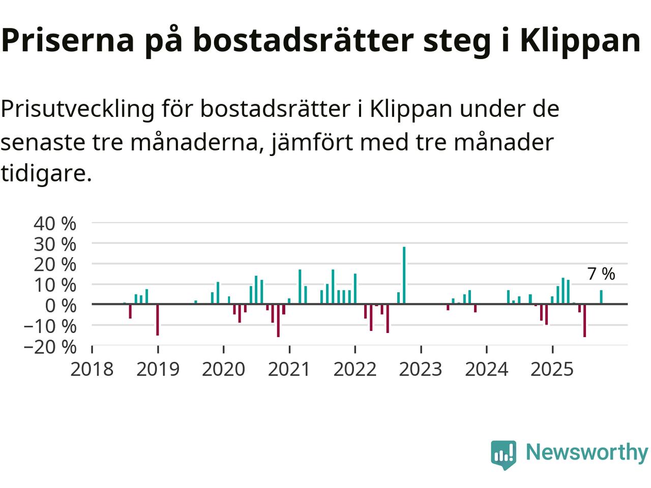 Priserna på bostadsrätter har gått upp i Klippans kommun. Medelpriset på försäljningarna under de senaste tre månaderna visar på en uppgång med 7 procent.