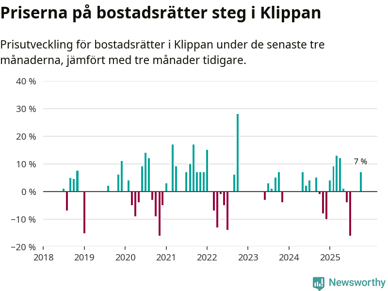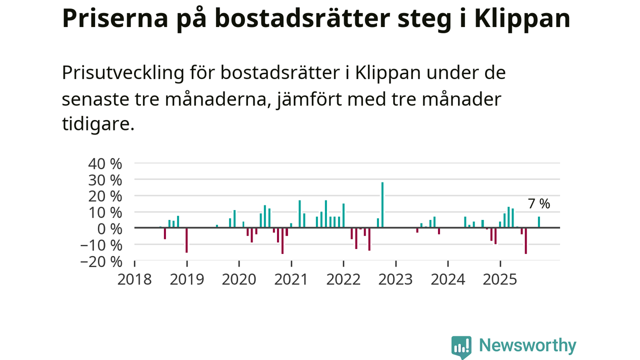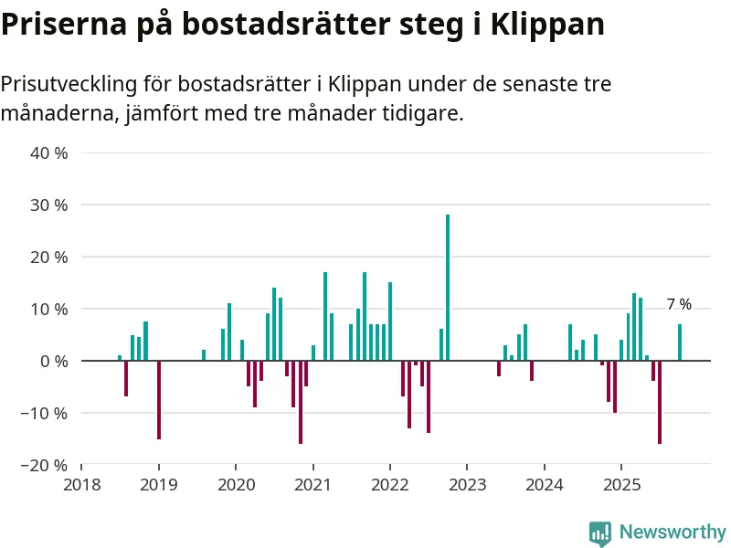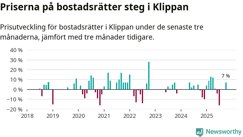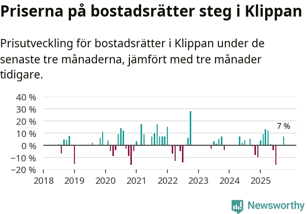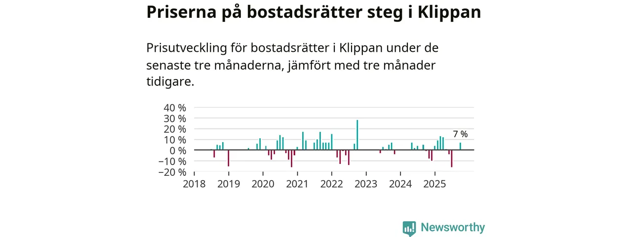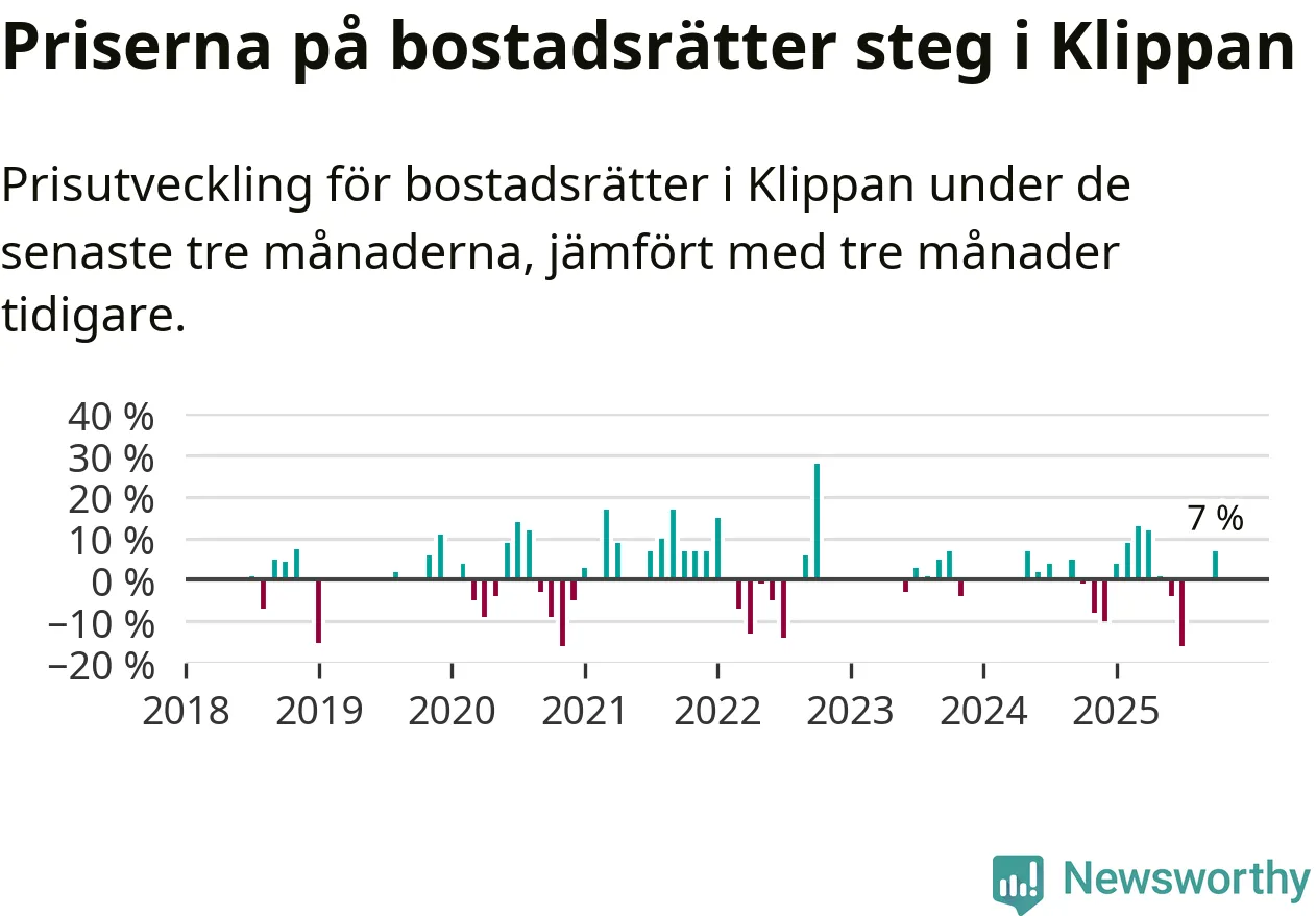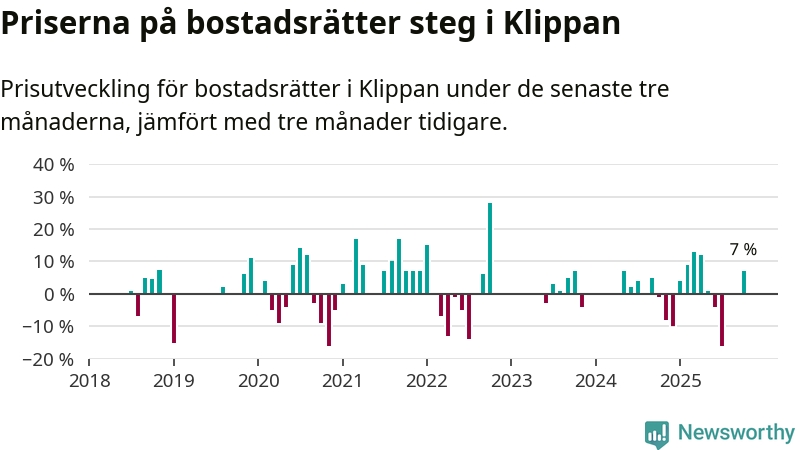 Priserna på bostadsrätter har gått upp i Klippans kommun. Medelpriset på försäljningarna under de senaste tre månaderna visar på en uppgång med 7 procent.