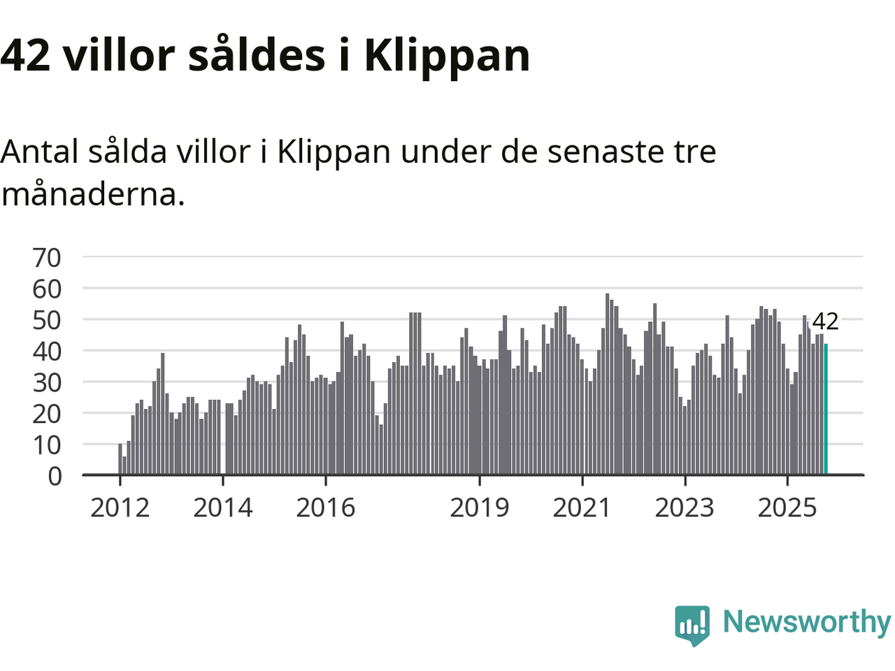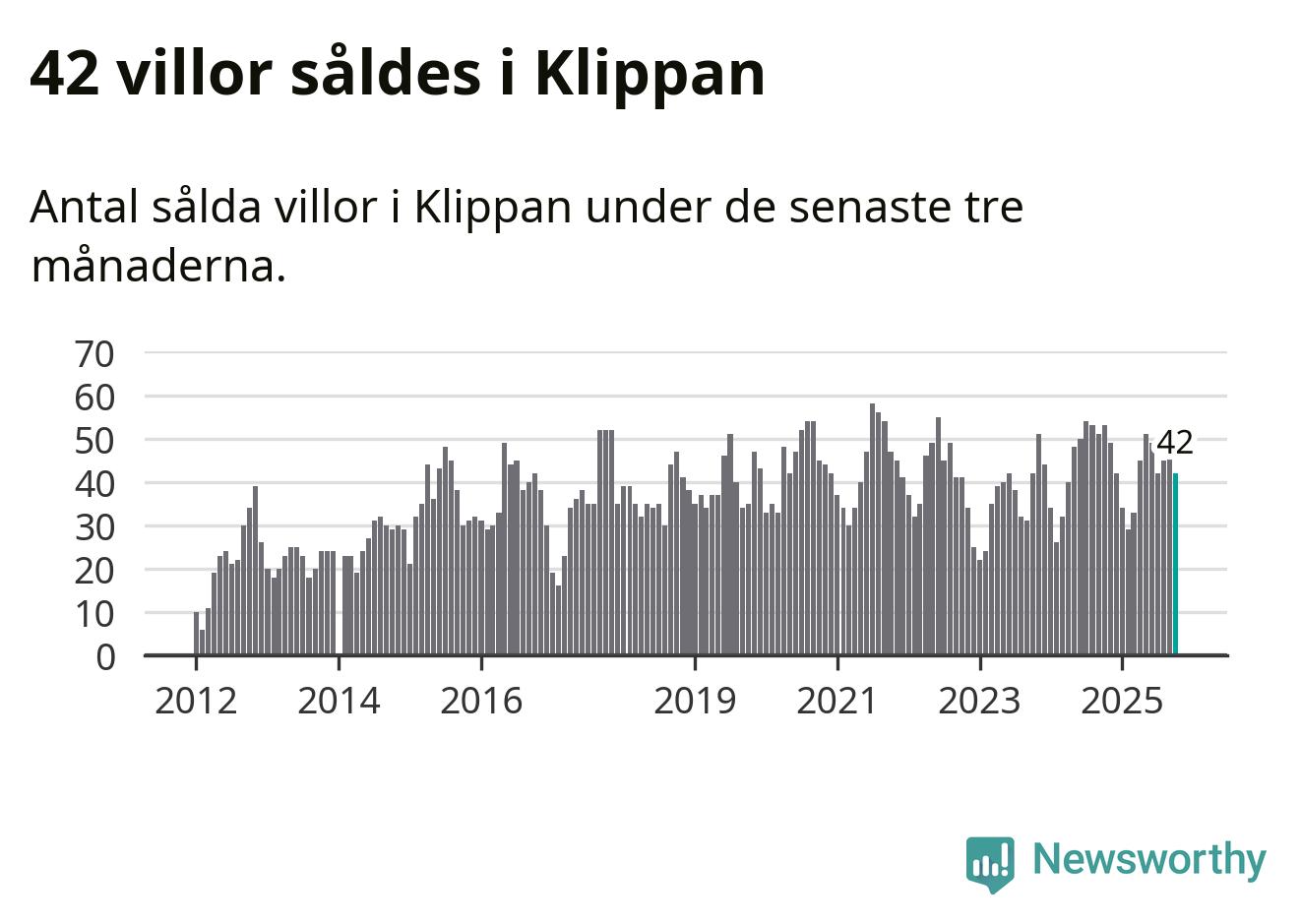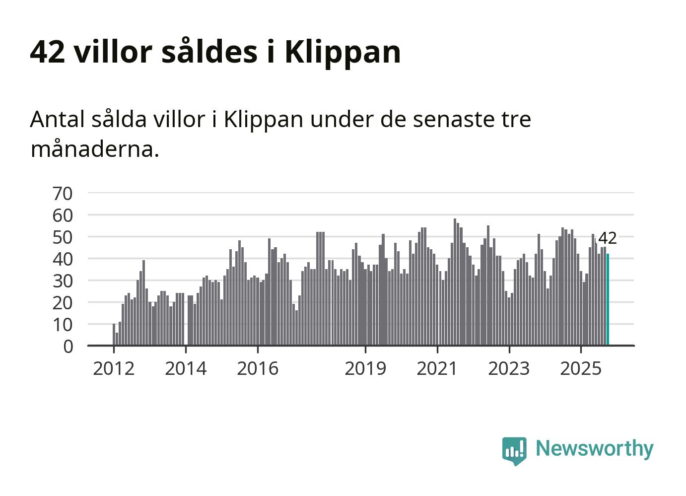 Sammanlagt såldes 42 villor i Klippans kommun mellan augusti och oktober till ett genomsnittligt pris på 1,8 miljoner kronor. I fjol gjordes 53 affärer vid den här tiden på året.