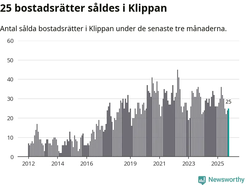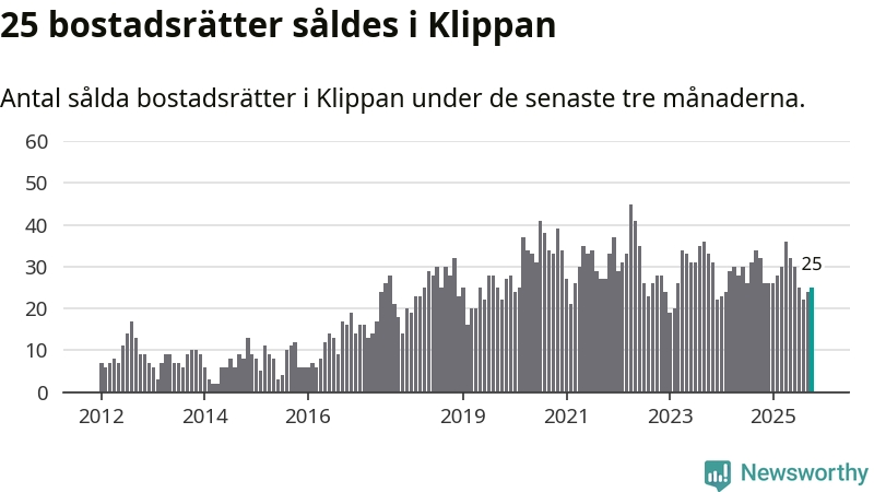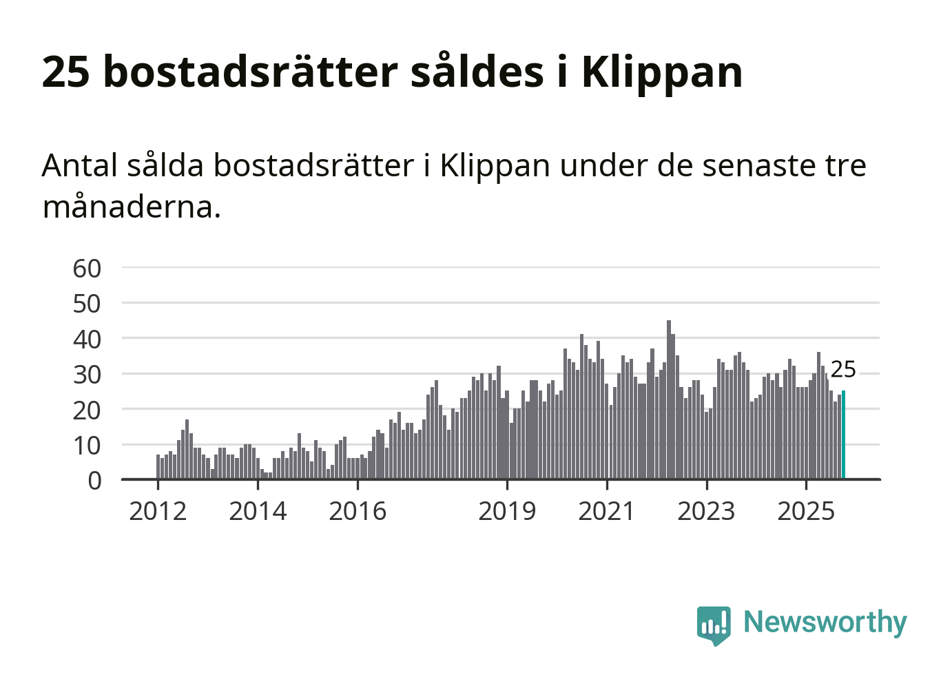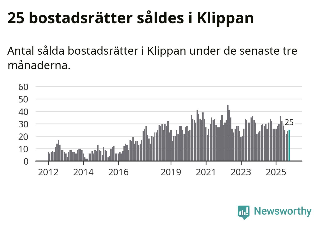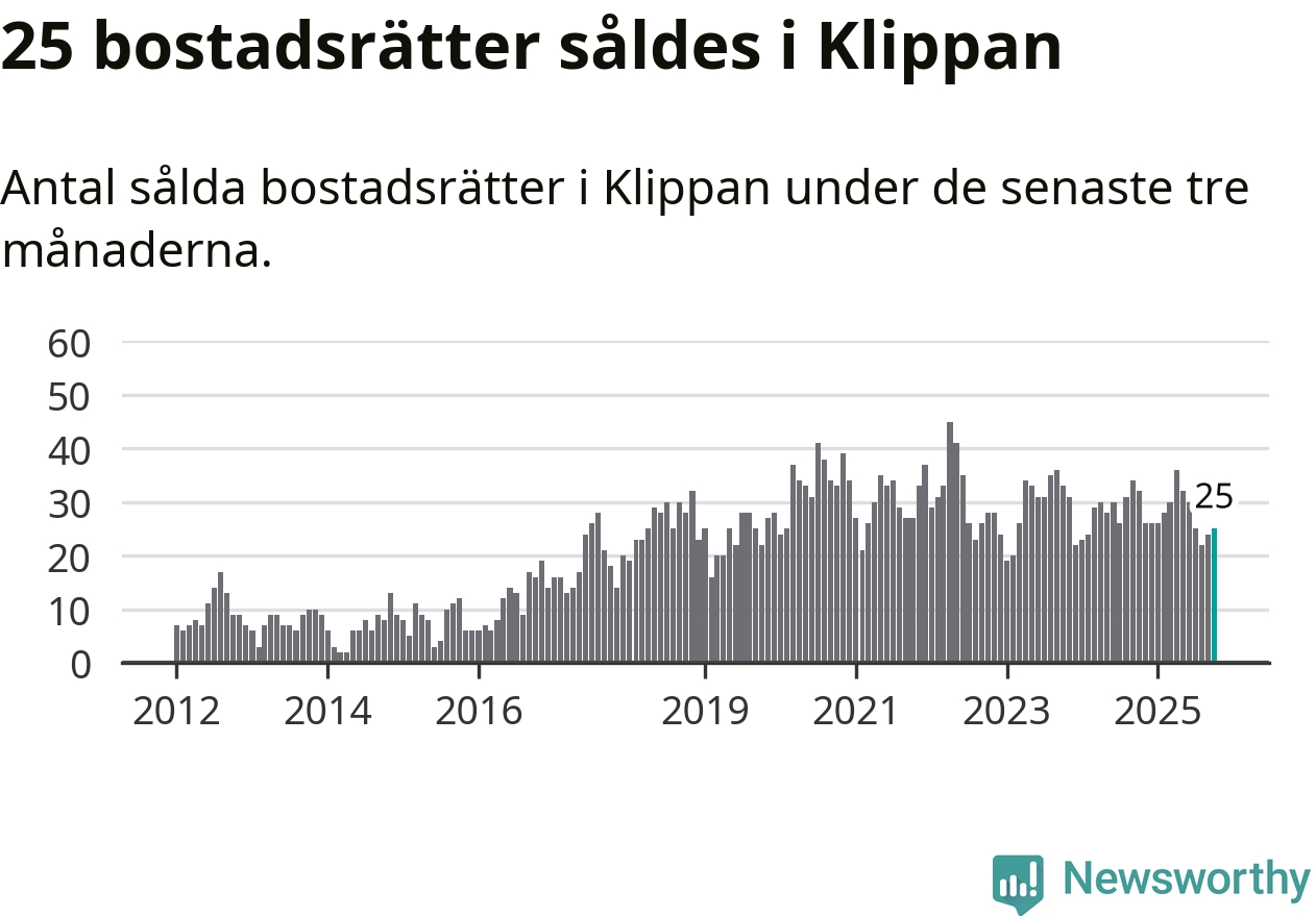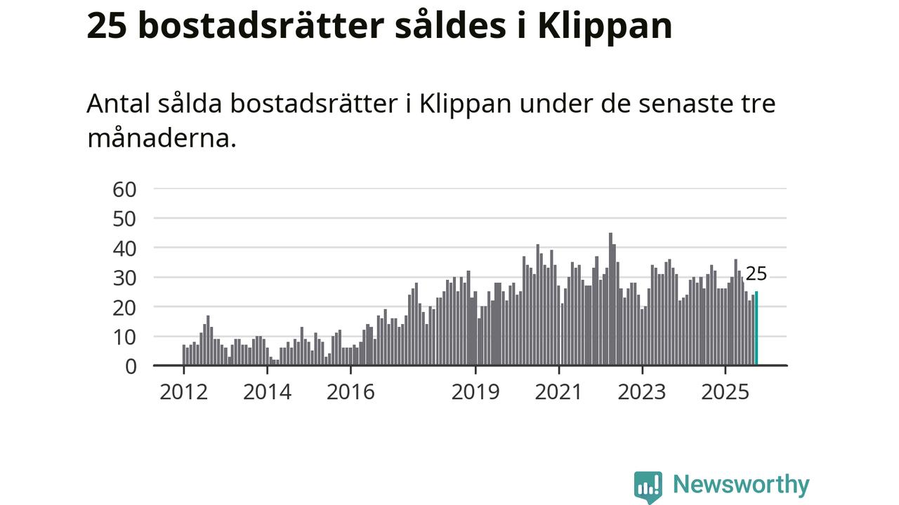 Sammanlagt såldes 25 bostadsrätter i Klippans kommun mellan augusti och oktober till ett genomsnittligt pris på 0,6 miljoner kronor. I fjol gjordes 32 affärer vid den här tiden på året.