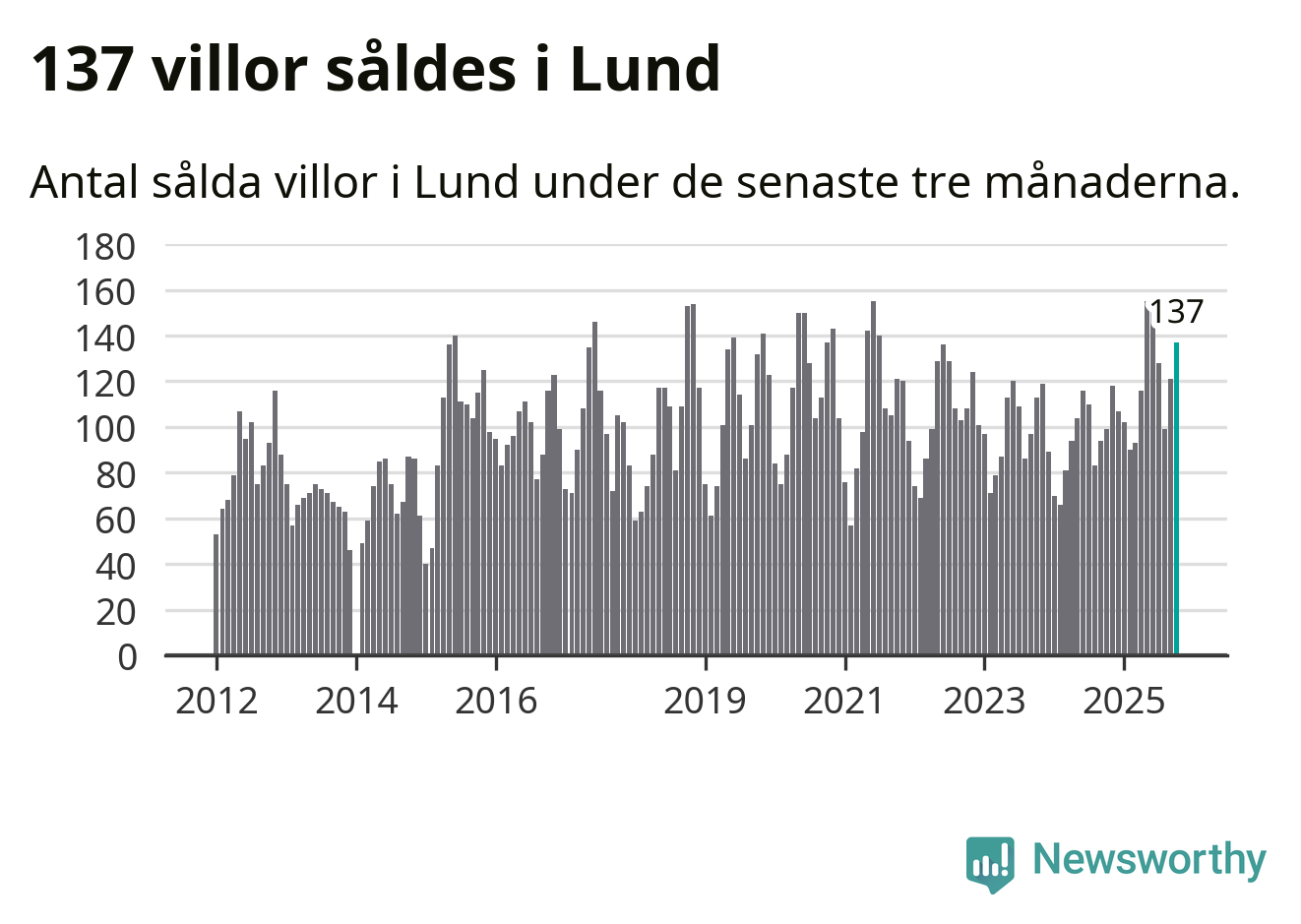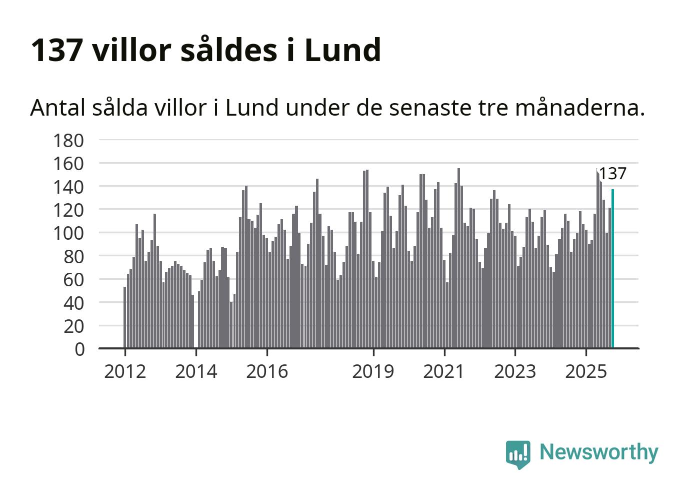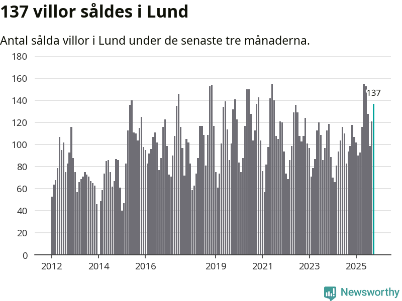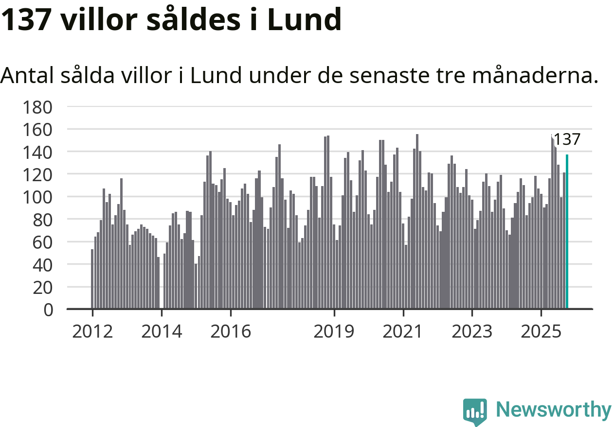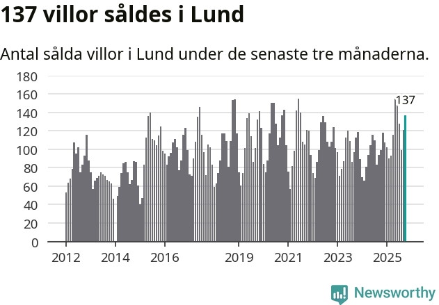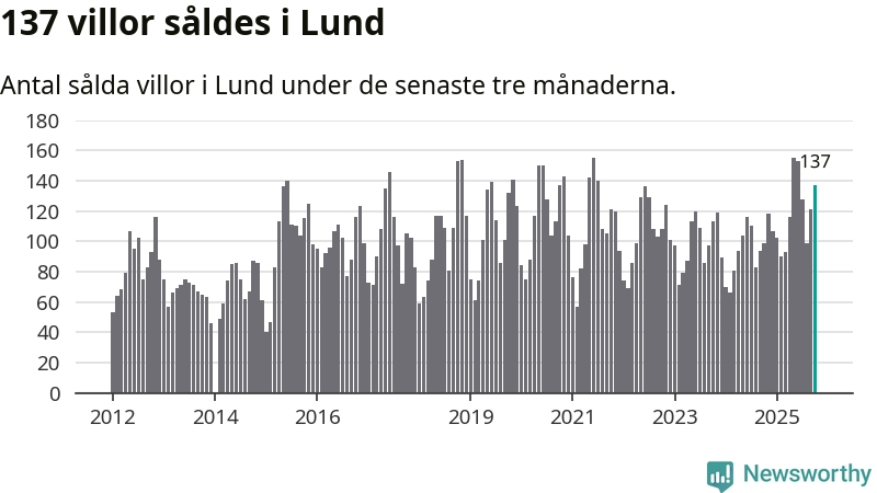 Sammanlagt såldes 137 villor i Lunds kommun mellan augusti och oktober till ett genomsnittligt pris på 5,7 miljoner kronor. I fjol gjordes 99 affärer vid den här tiden på året.