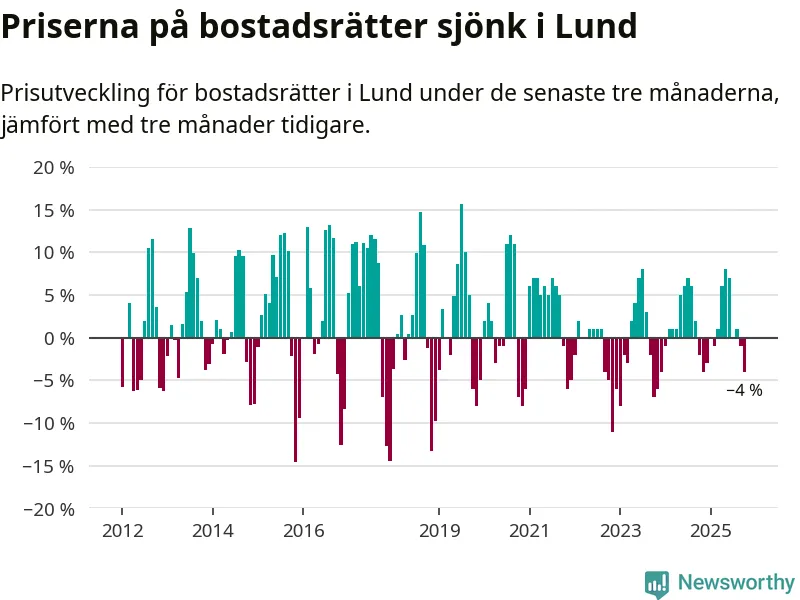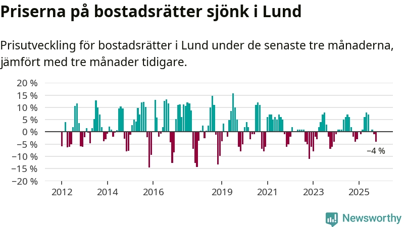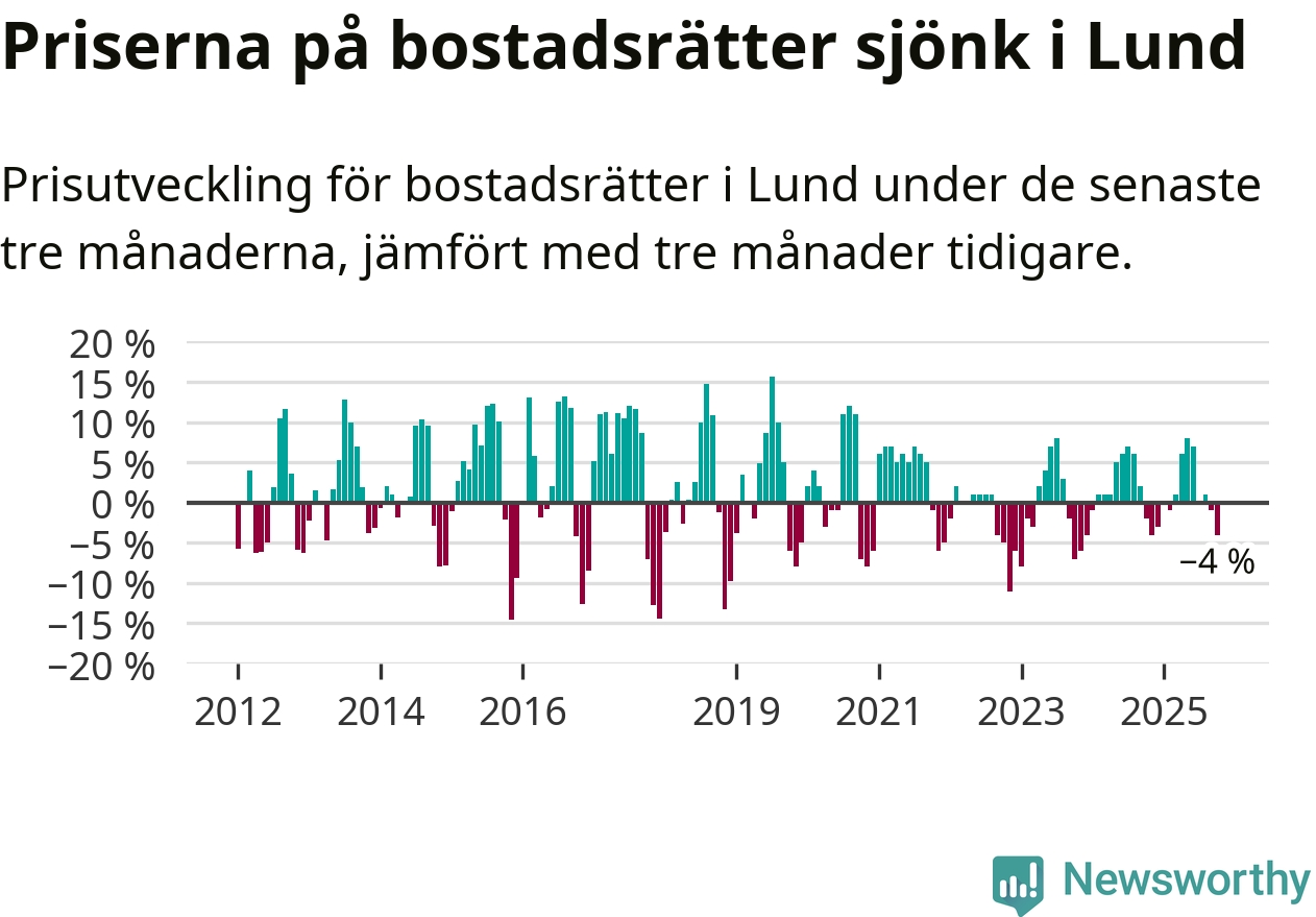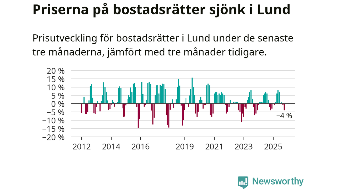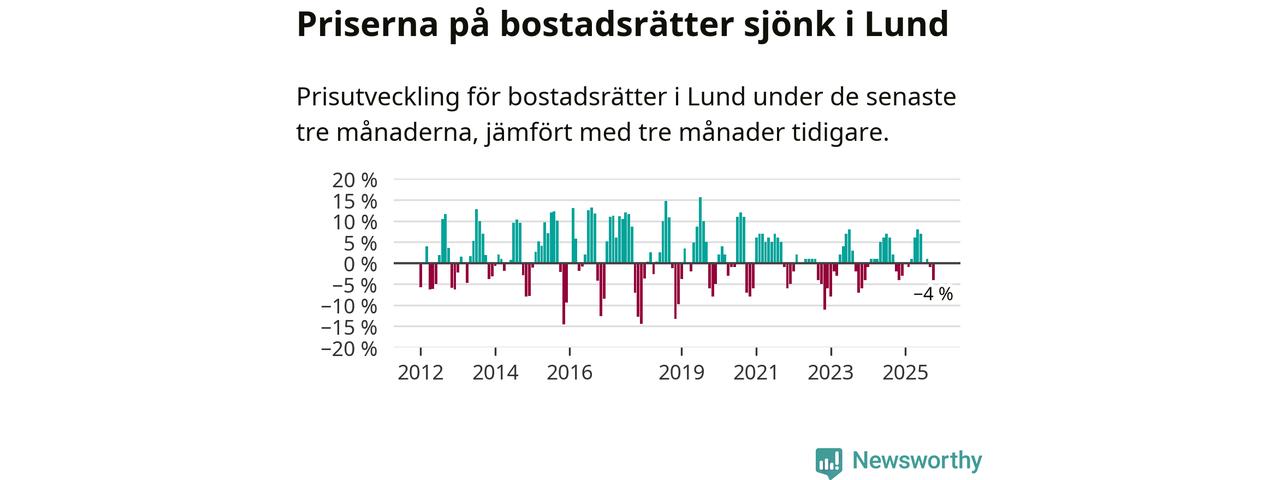 Statistiken visar även på en kännbar prisnedgång i Lunds kommun. Medelpriset på försäljningarna av bostadsrätter i kommunen var 4 procent lägre än för tre månader sedan. Även i hela Skåne sjunker priserna på bostadsrätter. I hela länet noterades en prisnedgång på 1 procent.