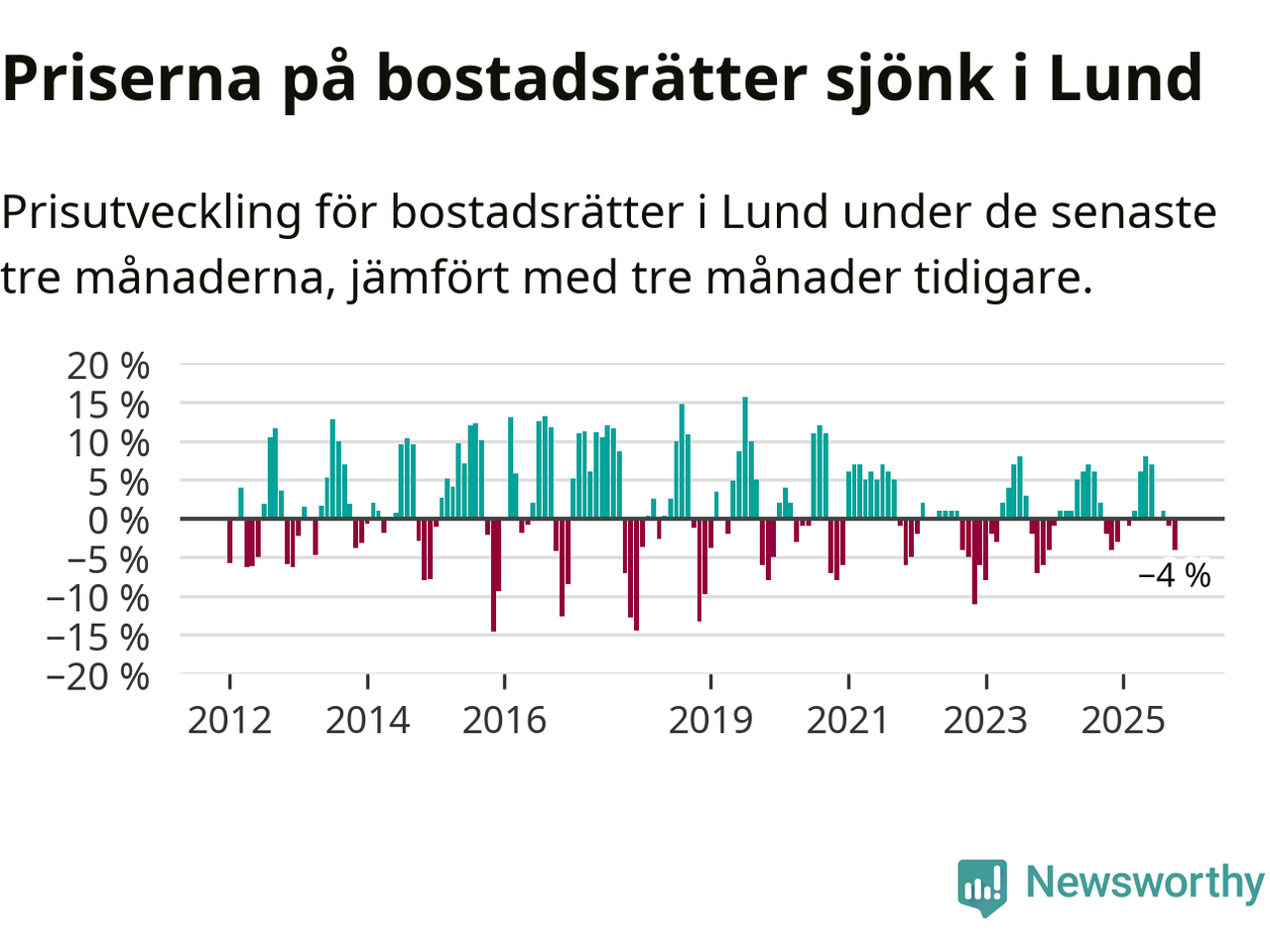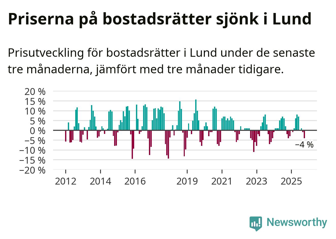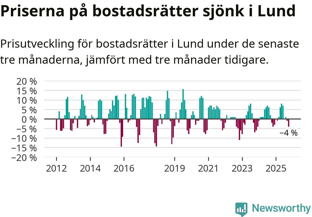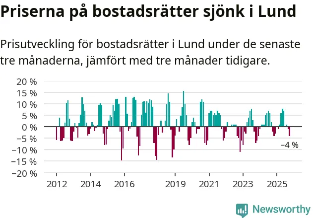 Statistiken visar även på en kännbar prisnedgång i Lunds kommun. Medelpriset på försäljningarna av bostadsrätter i kommunen var 4 procent lägre än för tre månader sedan. Även i hela Skåne sjunker priserna på bostadsrätter. I hela länet noterades en prisnedgång på 1 procent.