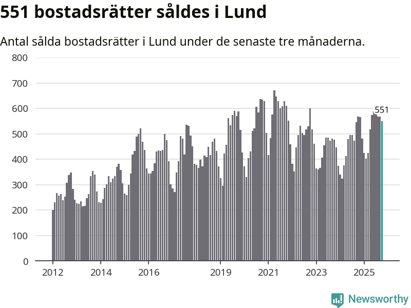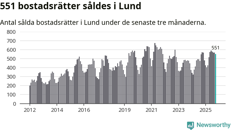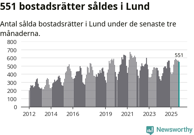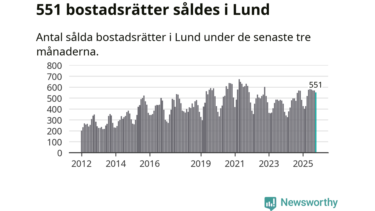 Mellan augusti och oktober såldes 551 bostadsrätter i Lunds kommun. Det är relativt få sett till aktiviteten på bostadsmarknaden i kommunen under de senaste tolv månaderna, samt det historiska snittet för den här tiden på året.