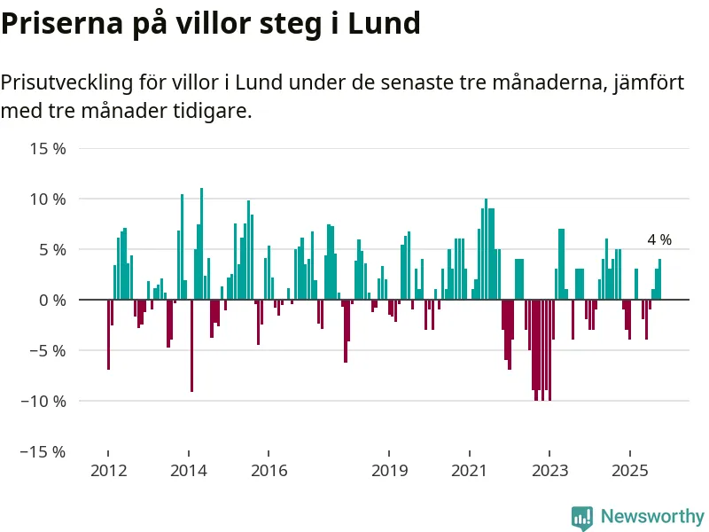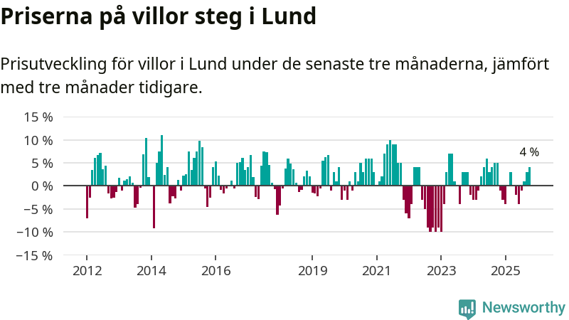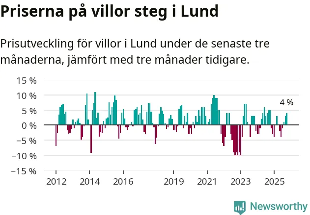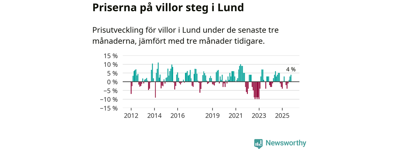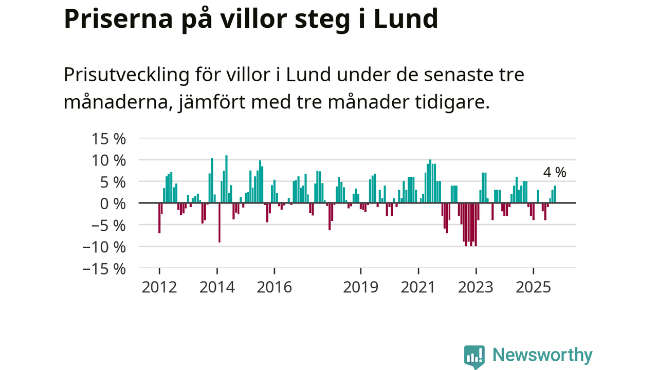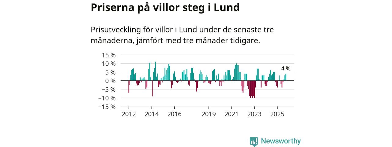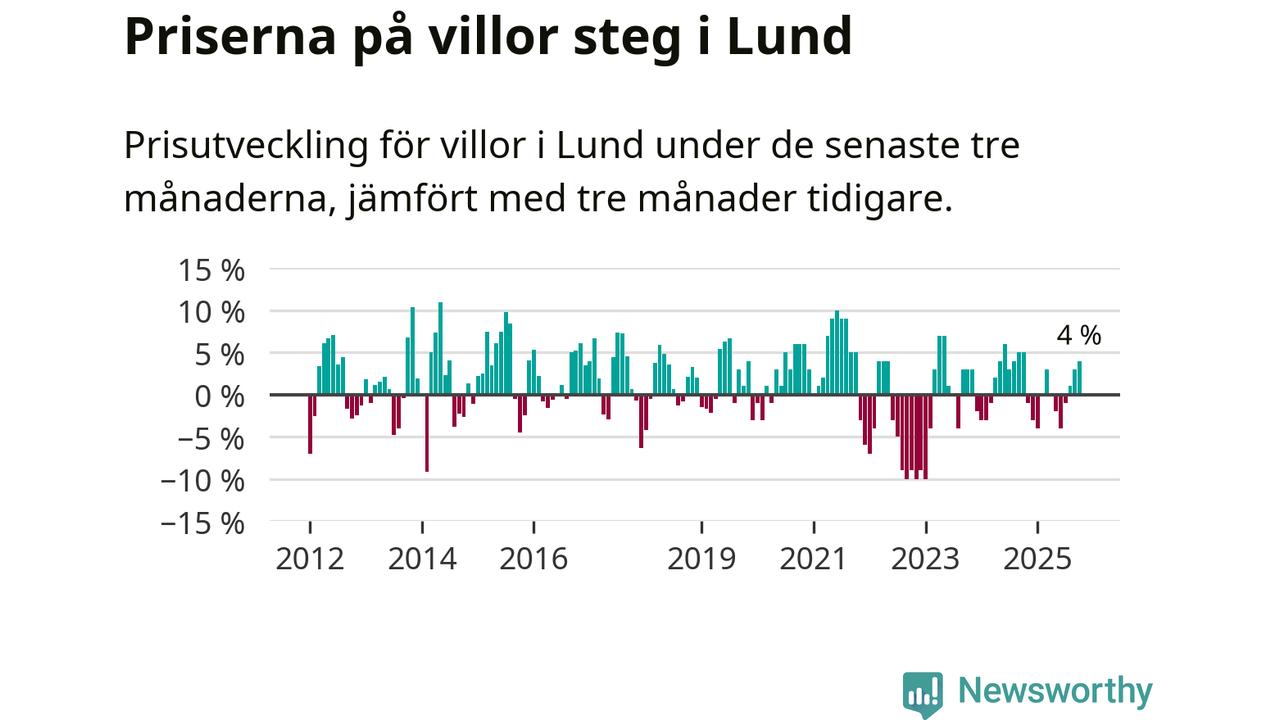 Villapriserna har gått upp i Lunds kommun. Medelpriset på försäljningarna under de senaste tre månaderna visar på en uppgång med 4 procent.
