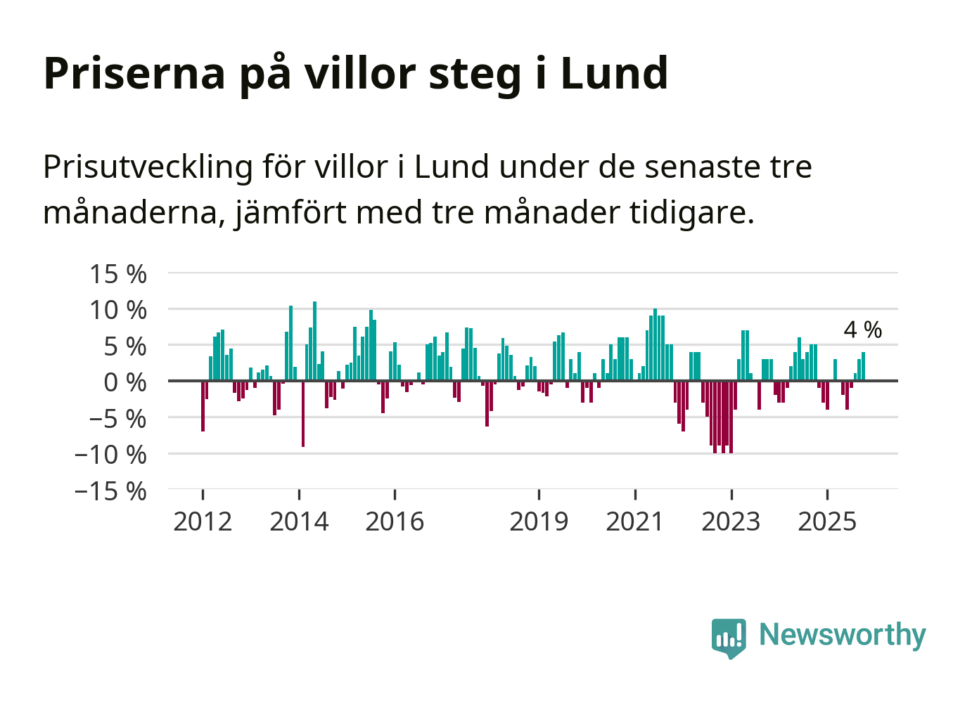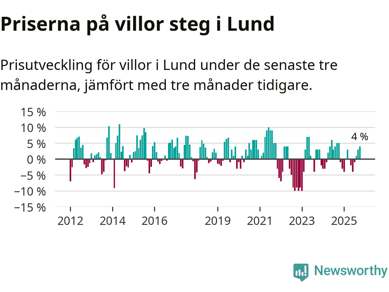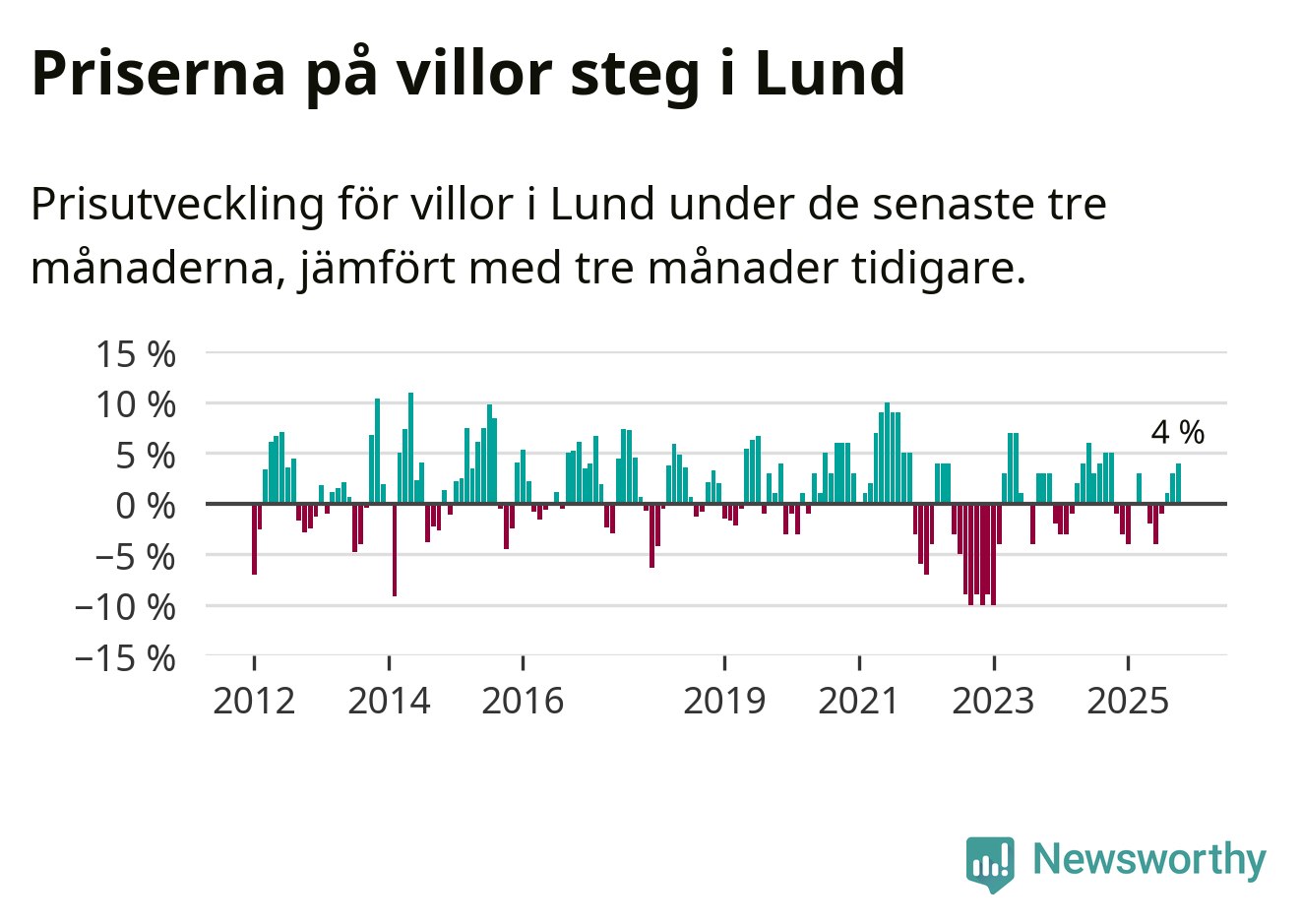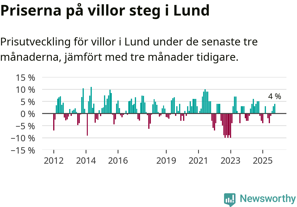 Villapriserna har gått upp i Lunds kommun. Medelpriset på försäljningarna under de senaste tre månaderna visar på en uppgång med 4 procent.
