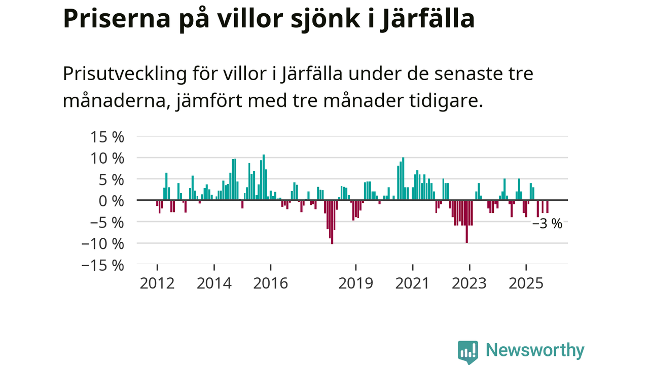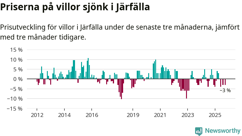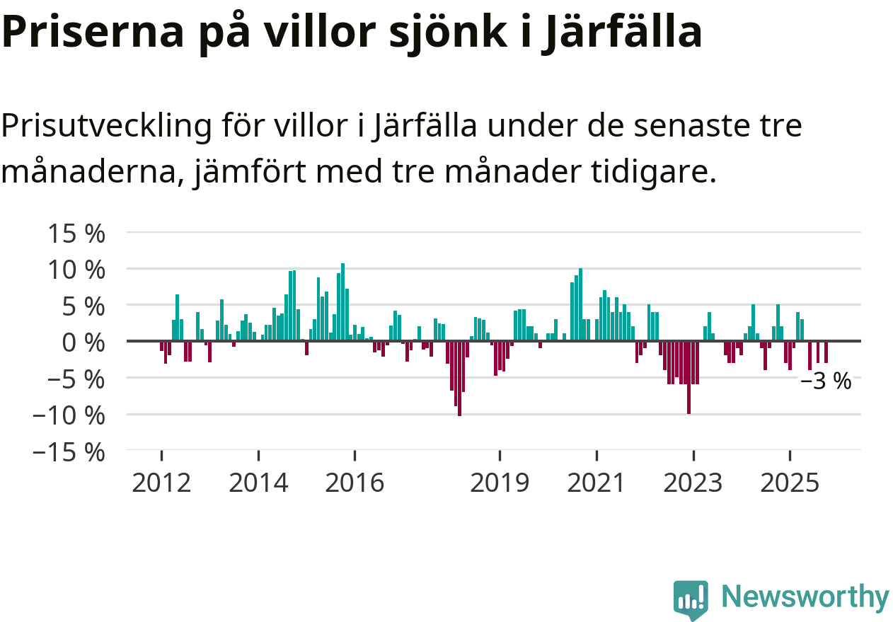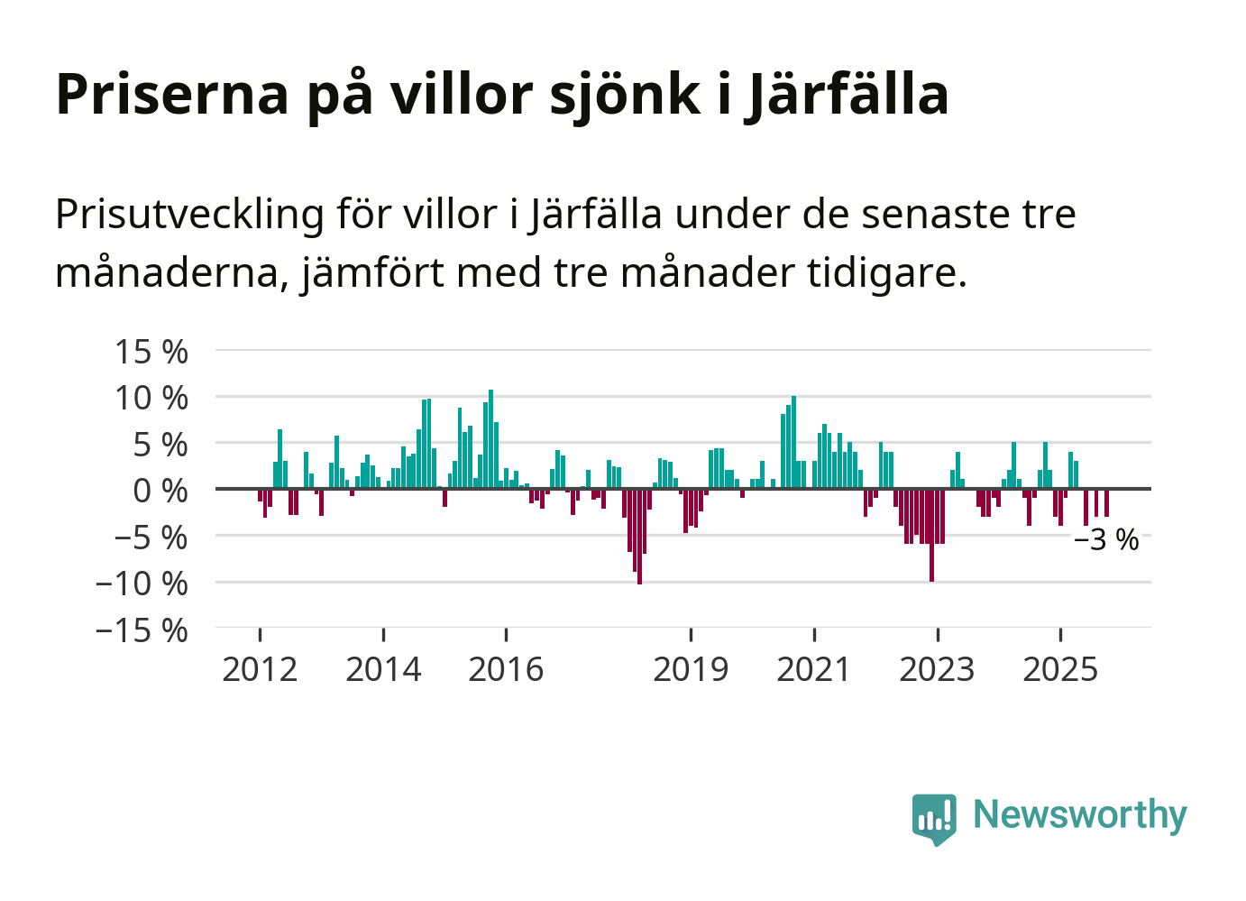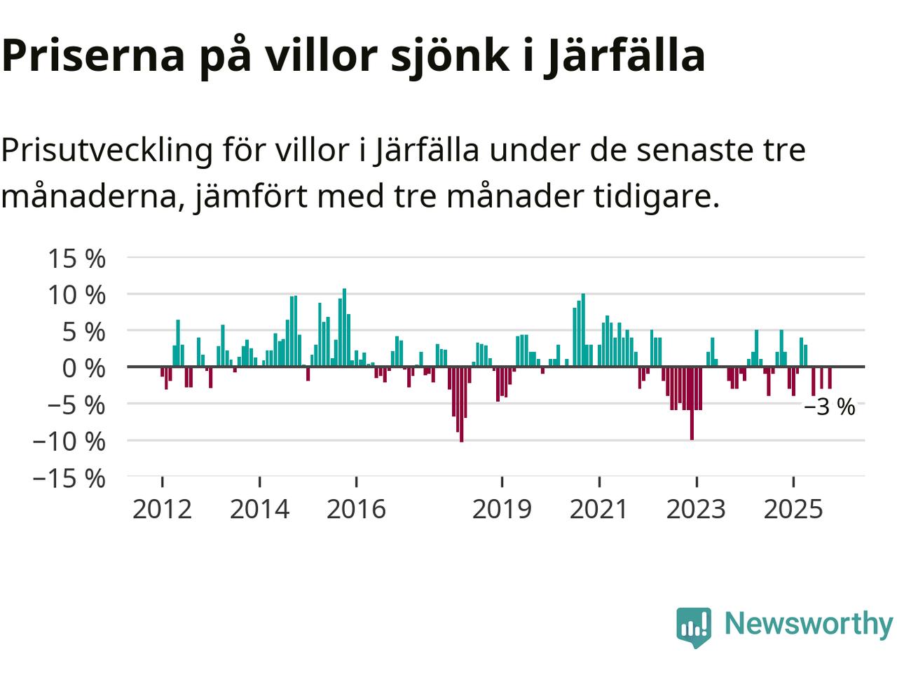 Villapriserna har gått ner i Järfälla kommun. Medelpriset på försäljningarna under de senaste tre månaderna visar på en nedgång med 3 procent.