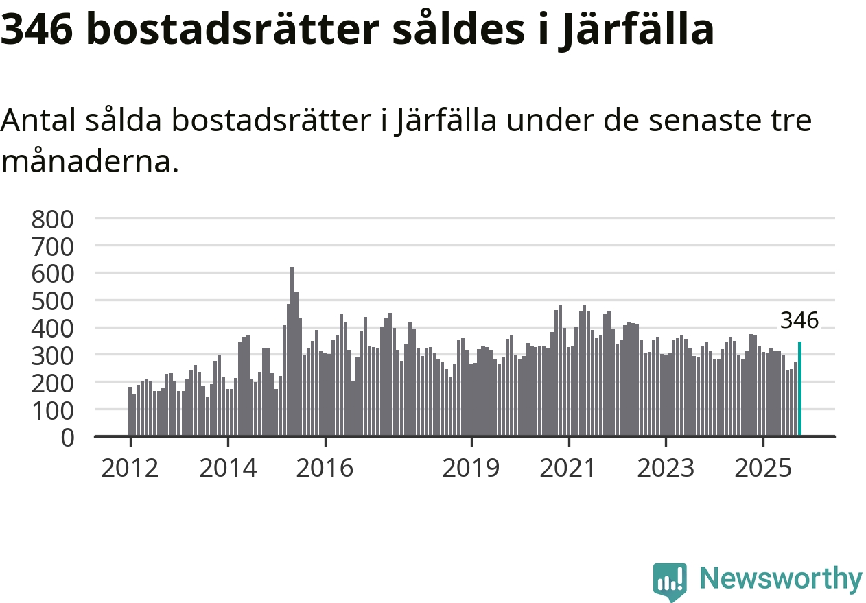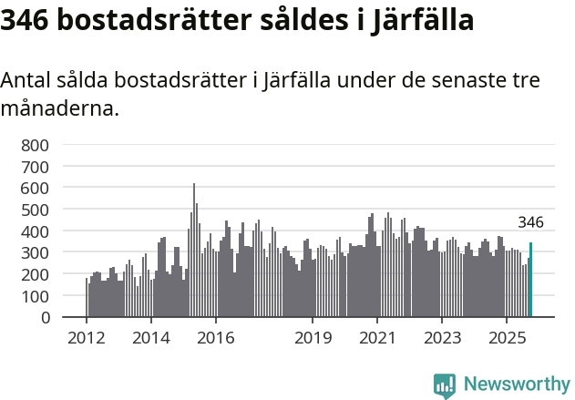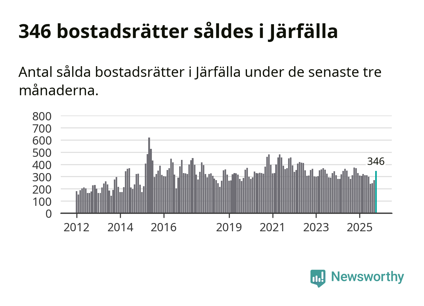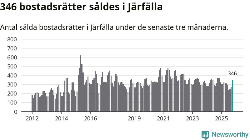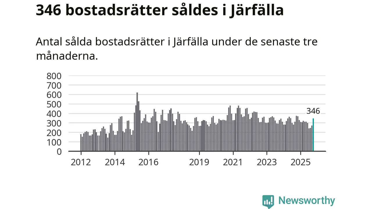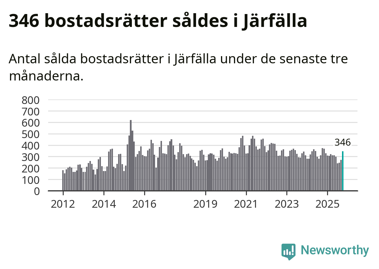 Sammanlagt såldes 346 bostadsrätter i Järfälla kommun mellan augusti och oktober till ett genomsnittligt pris på 2,3 miljoner kronor. I fjol gjordes 374 affärer vid den här tiden på året.