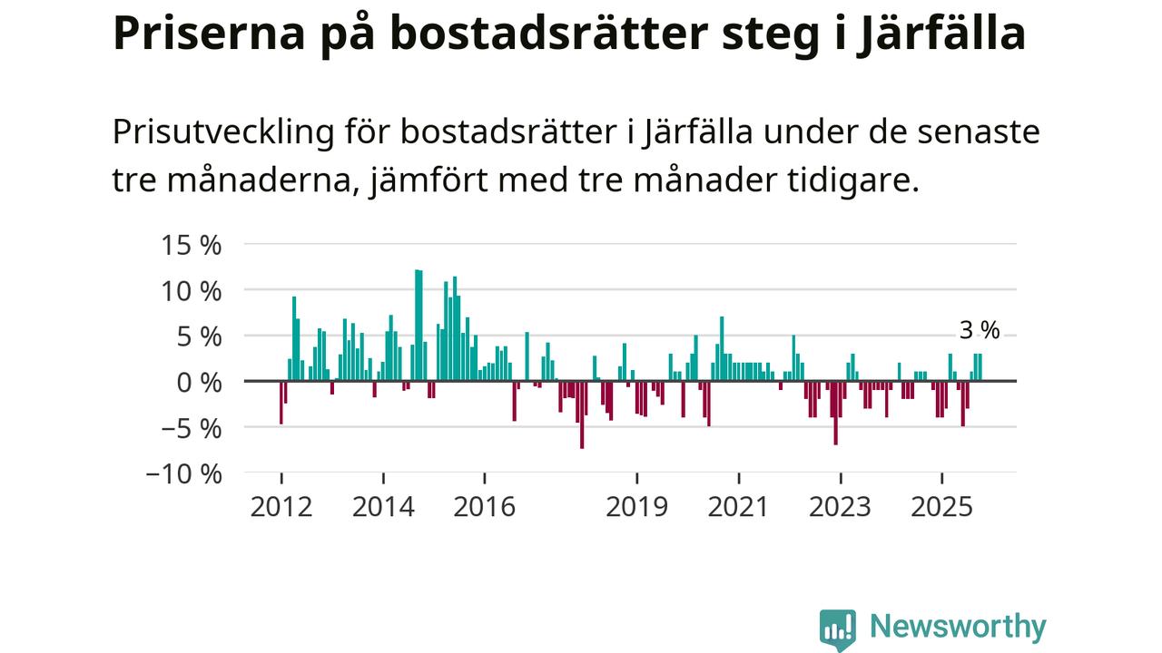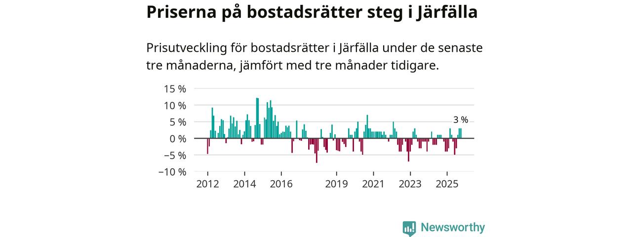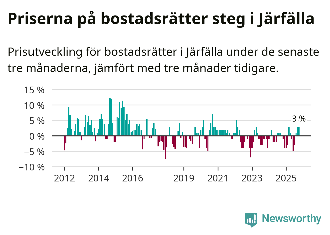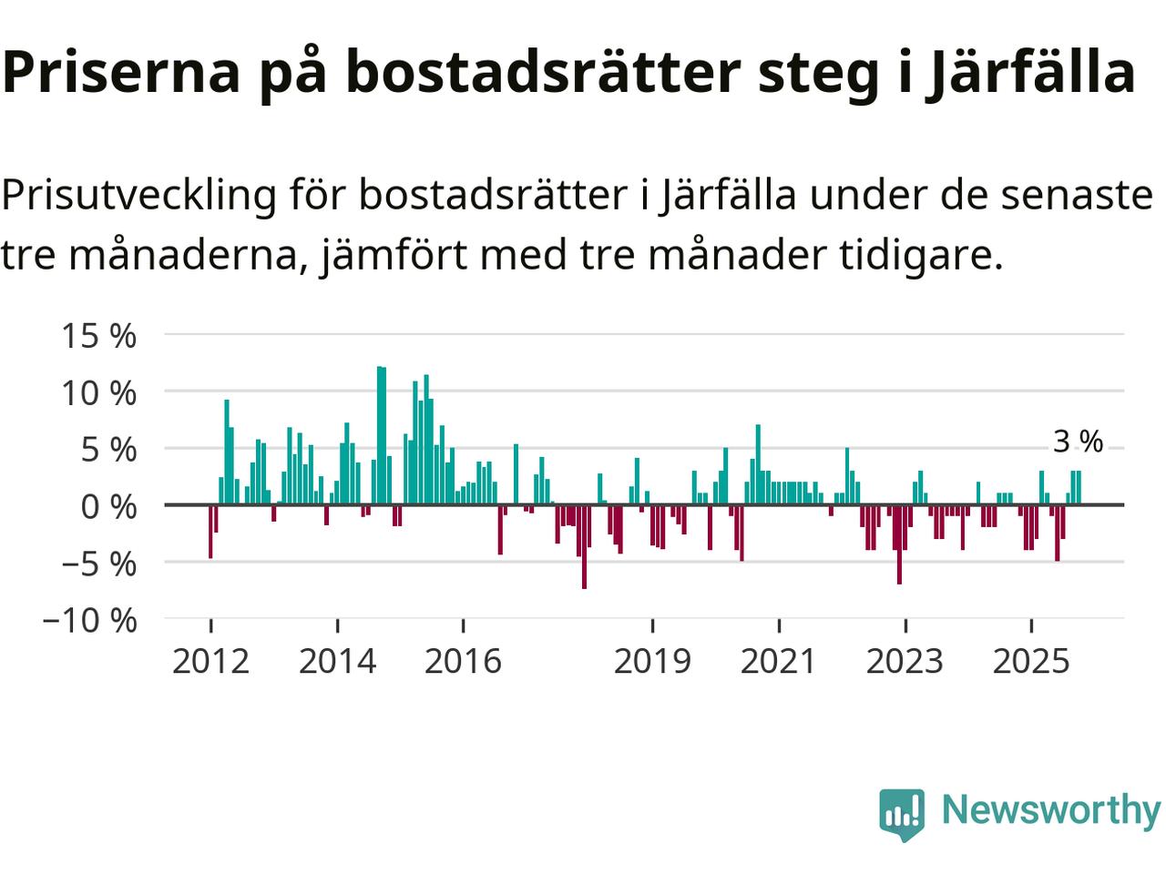 Priserna på bostadsrätter har gått upp i Järfälla kommun. Medelpriset på försäljningarna under de senaste tre månaderna visar på en uppgång med 3 procent.