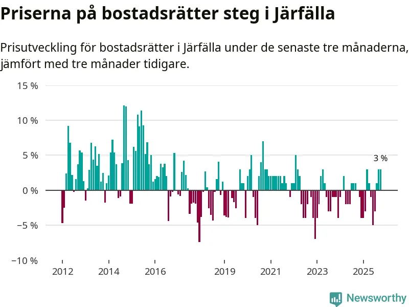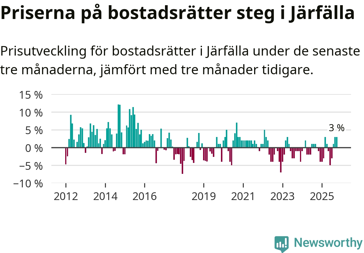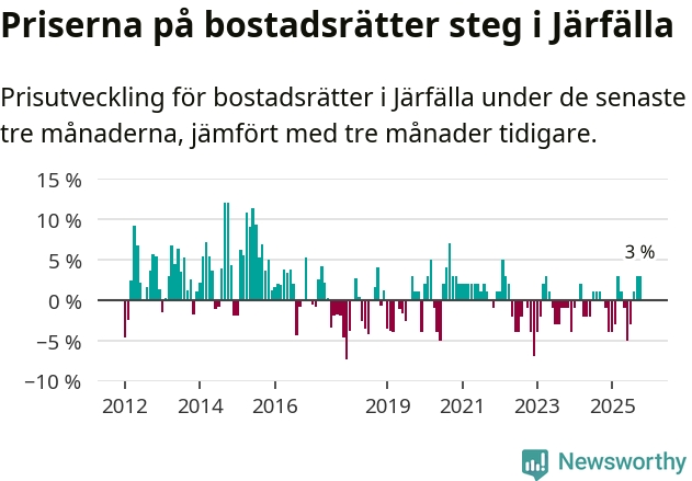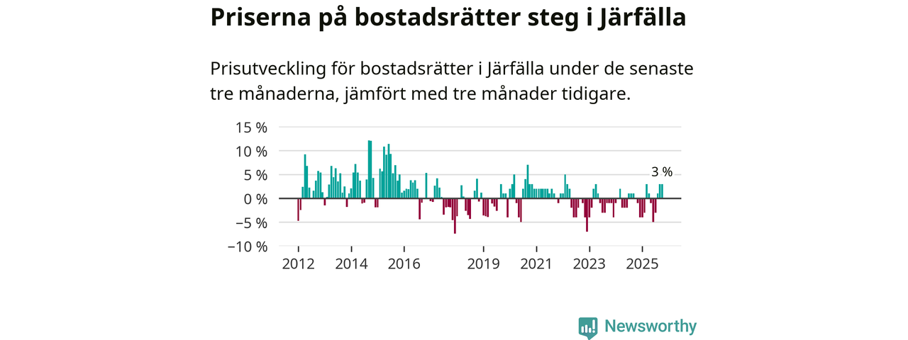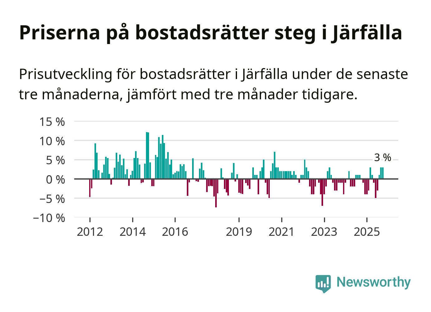 Priserna på bostadsrätter har gått upp i Järfälla kommun. Medelpriset på försäljningarna under de senaste tre månaderna visar på en uppgång med 3 procent.