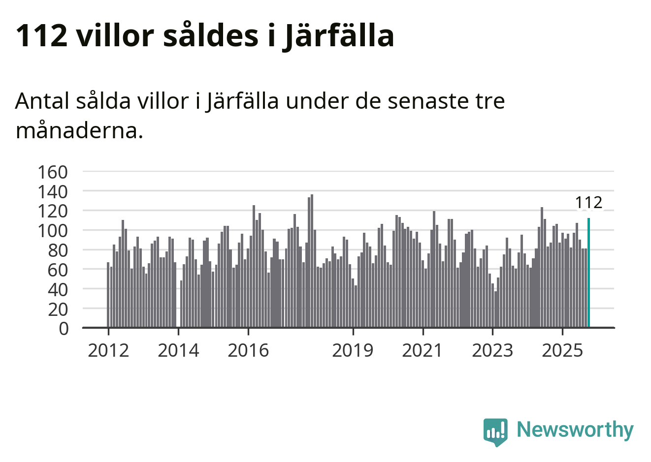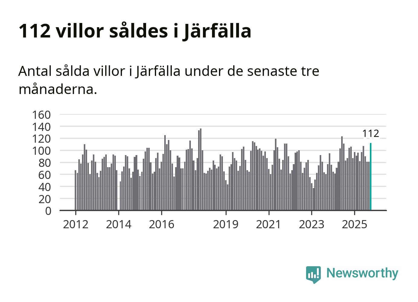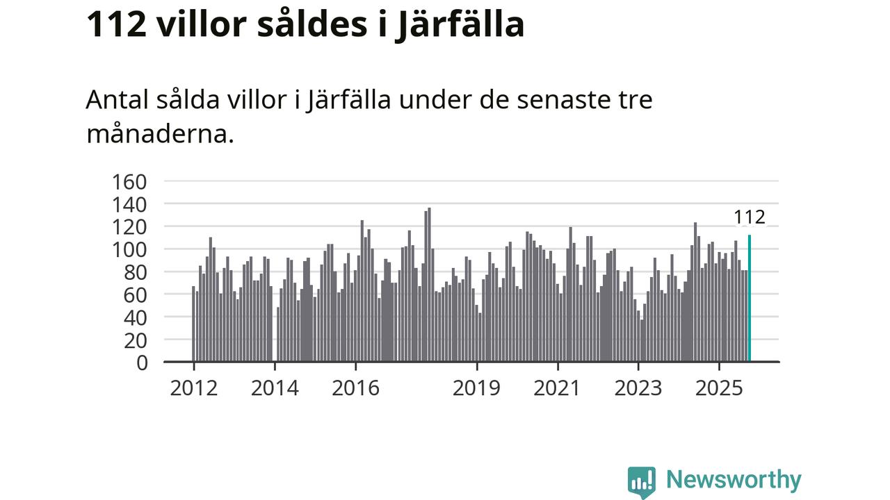 Sammanlagt såldes 112 villor i Järfälla kommun mellan augusti och oktober till ett genomsnittligt pris på 5,6 miljoner kronor. I fjol gjordes 104 affärer vid den här tiden på året.