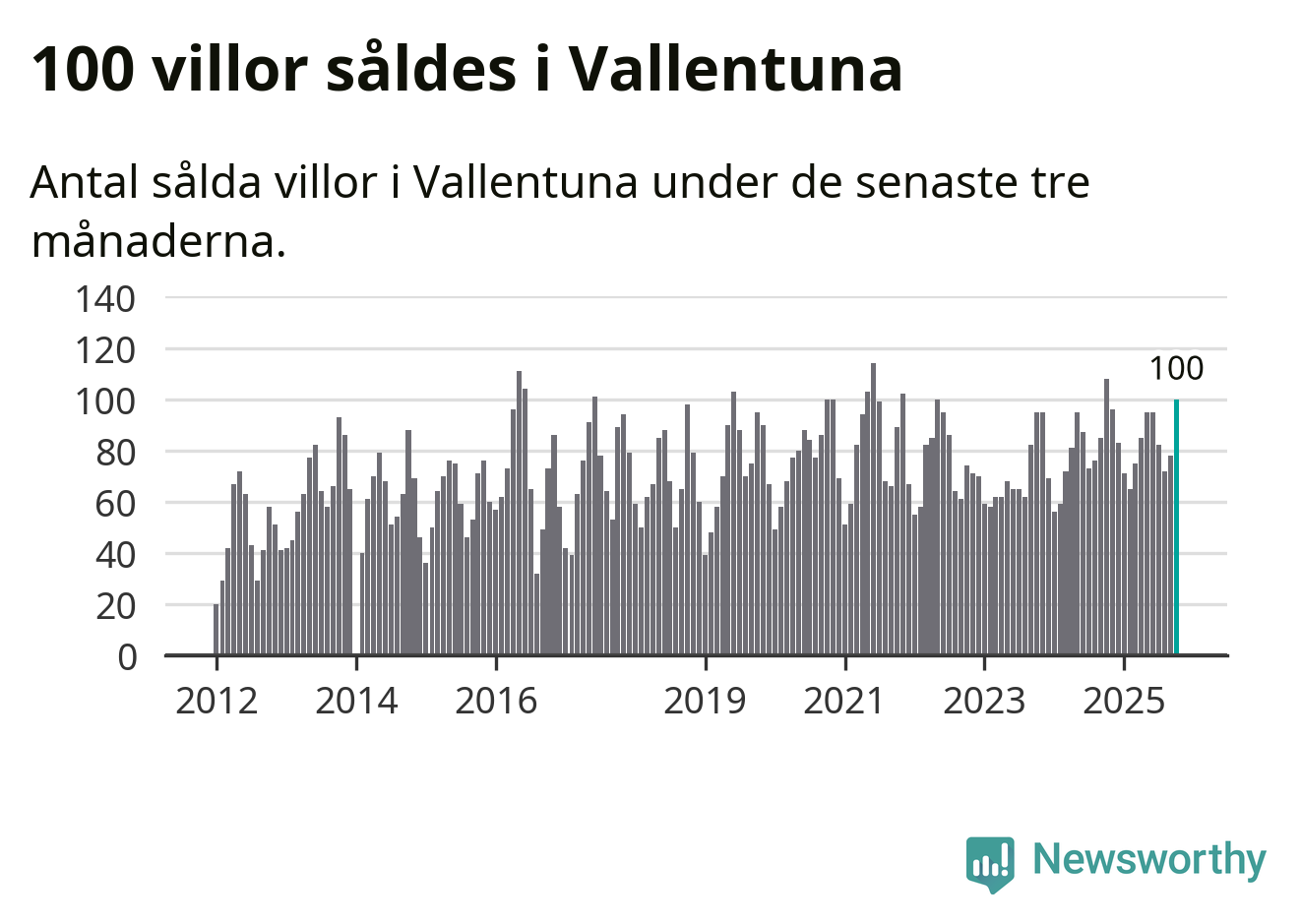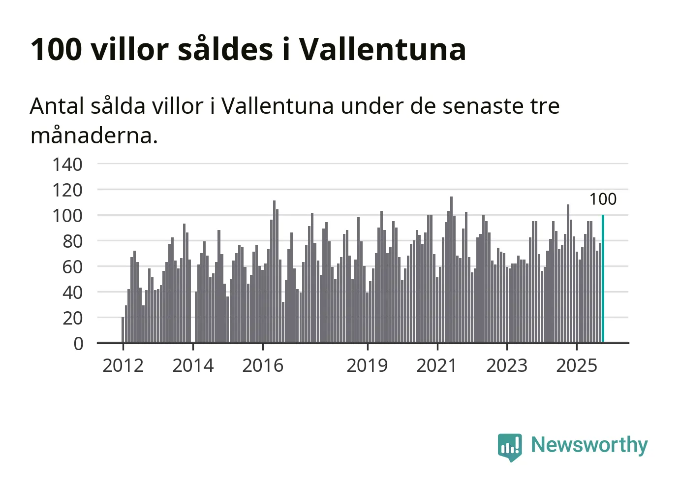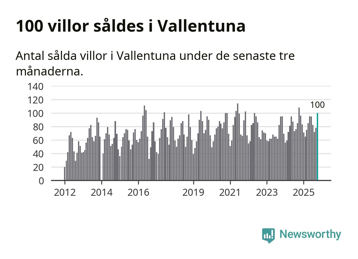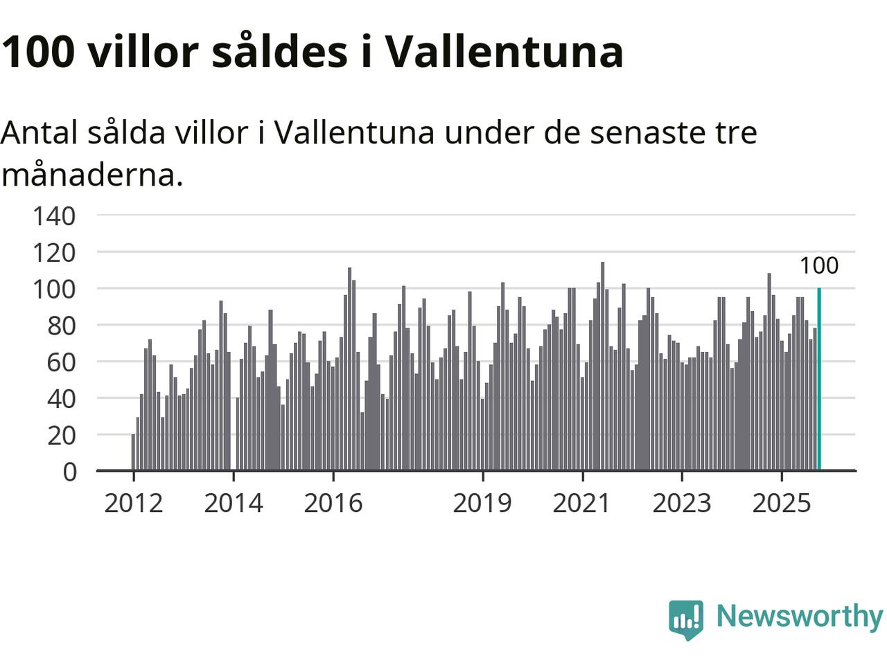 Sammanlagt såldes 100 villor i Vallentuna kommun mellan augusti och oktober till ett genomsnittligt pris på 5,3 miljoner kronor. I fjol gjordes 108 affärer vid den här tiden på året.