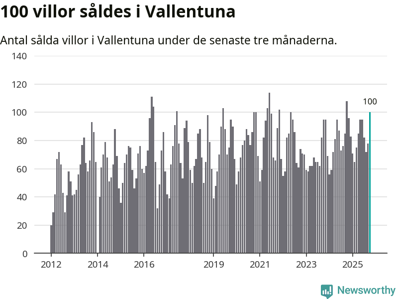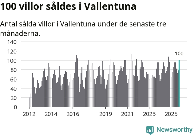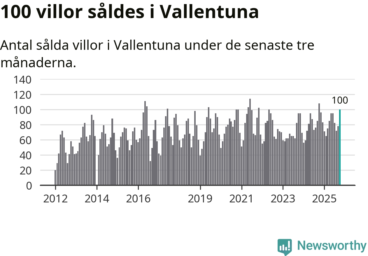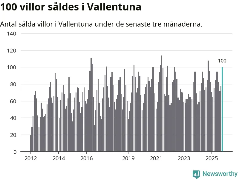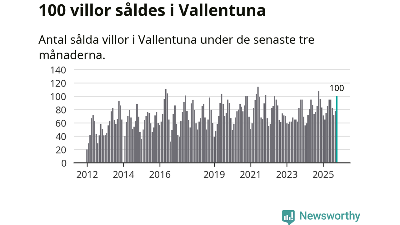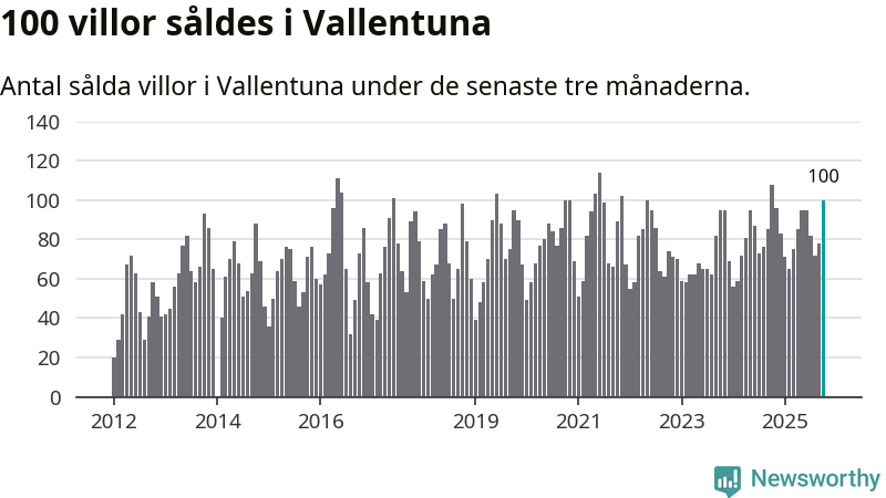 Sammanlagt såldes 100 villor i Vallentuna kommun mellan augusti och oktober till ett genomsnittligt pris på 5,3 miljoner kronor. I fjol gjordes 108 affärer vid den här tiden på året.
