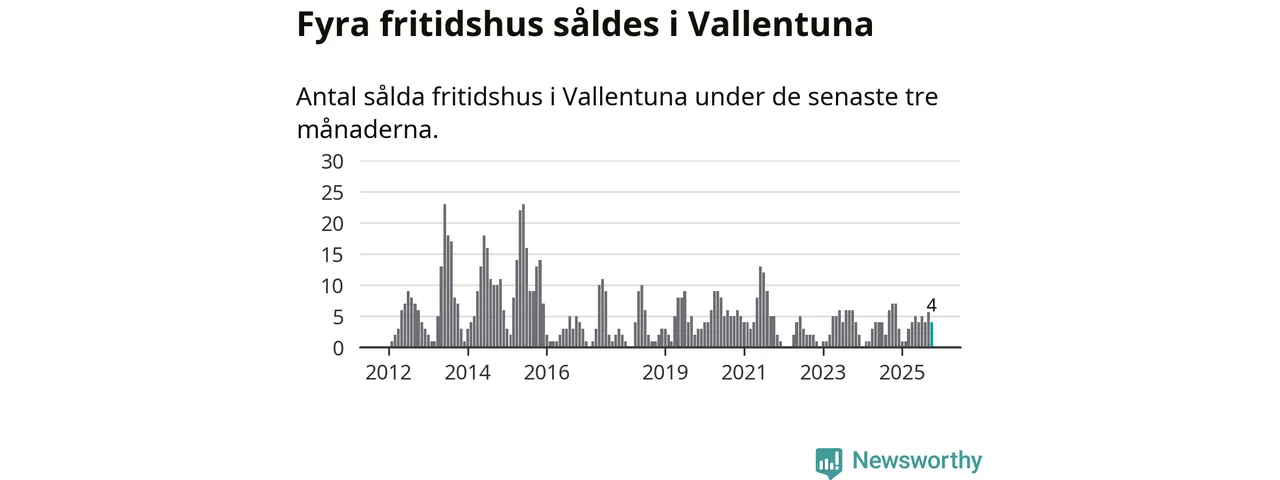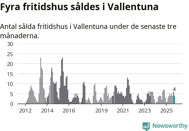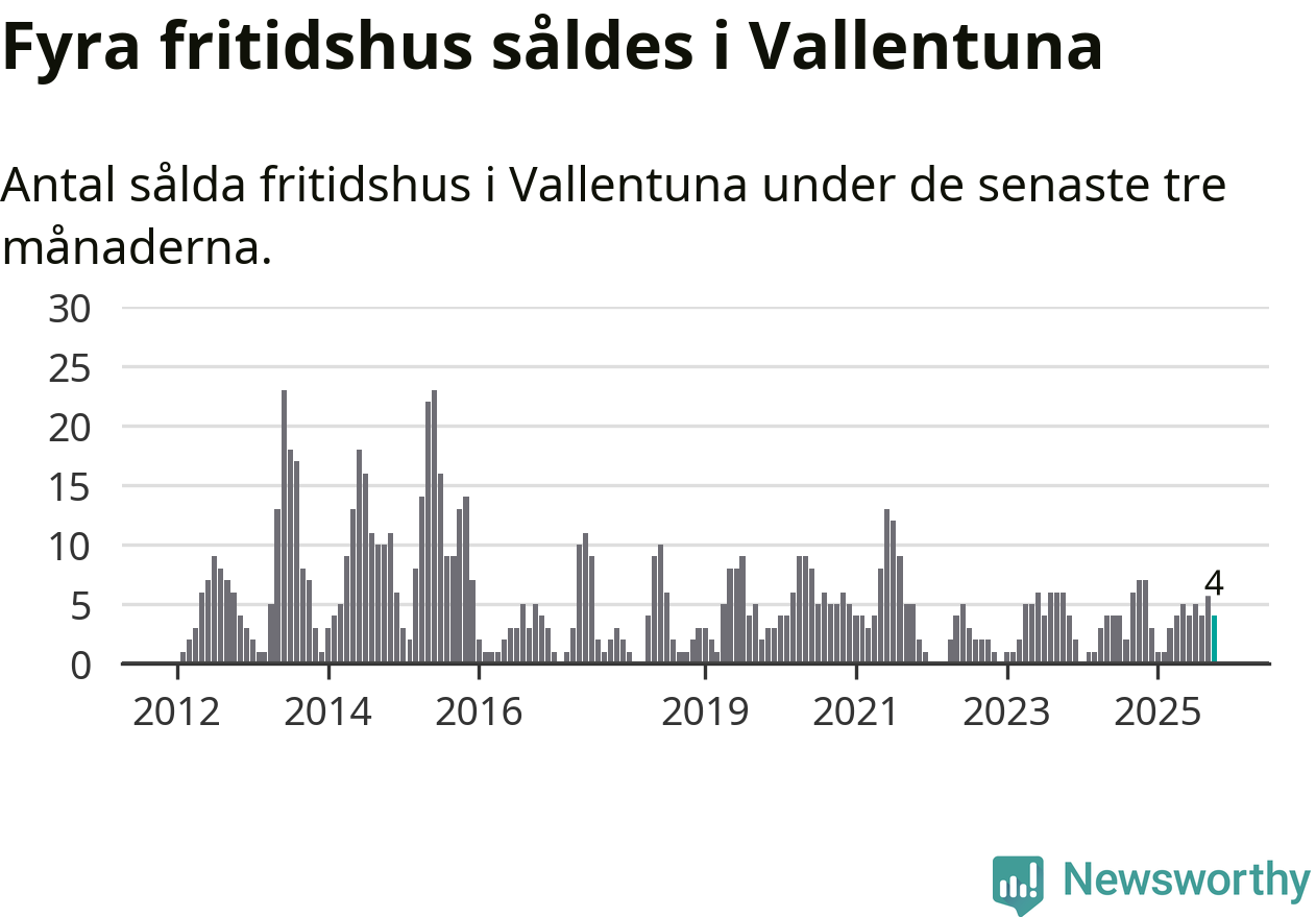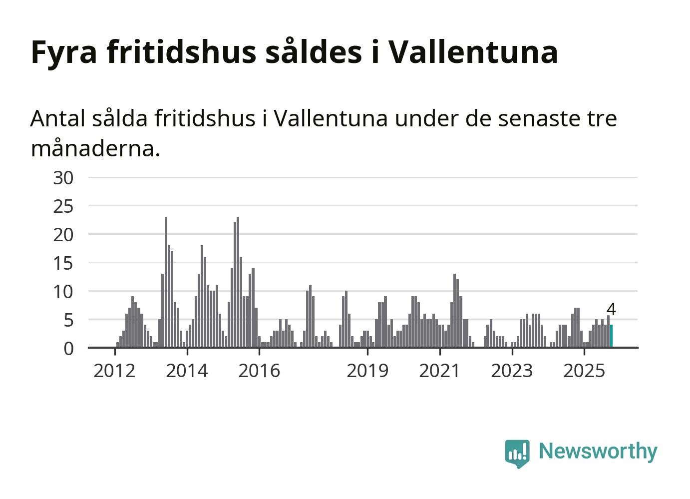 Mellan augusti och oktober gjordes sammanlagt fyra affärer med fritidshus i Vallentuna kommun. Det kan jämföras med sju vid motsvarande tid i fjol.