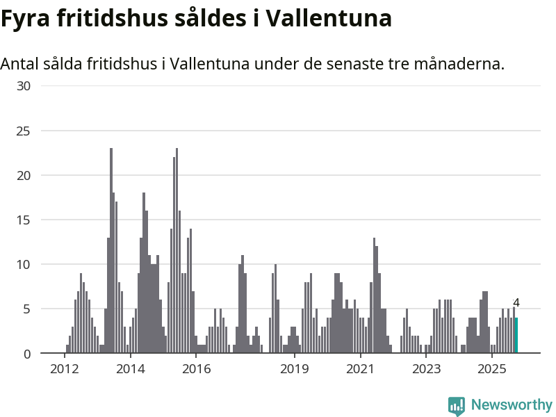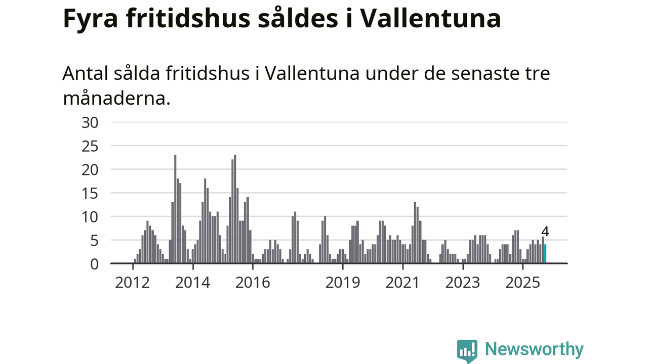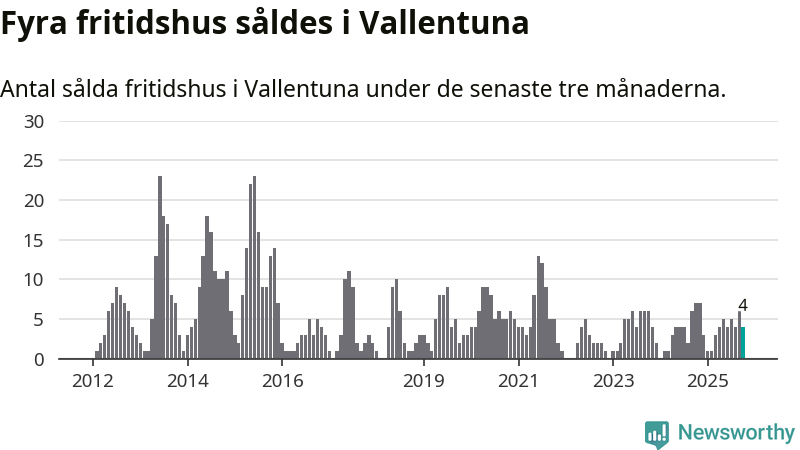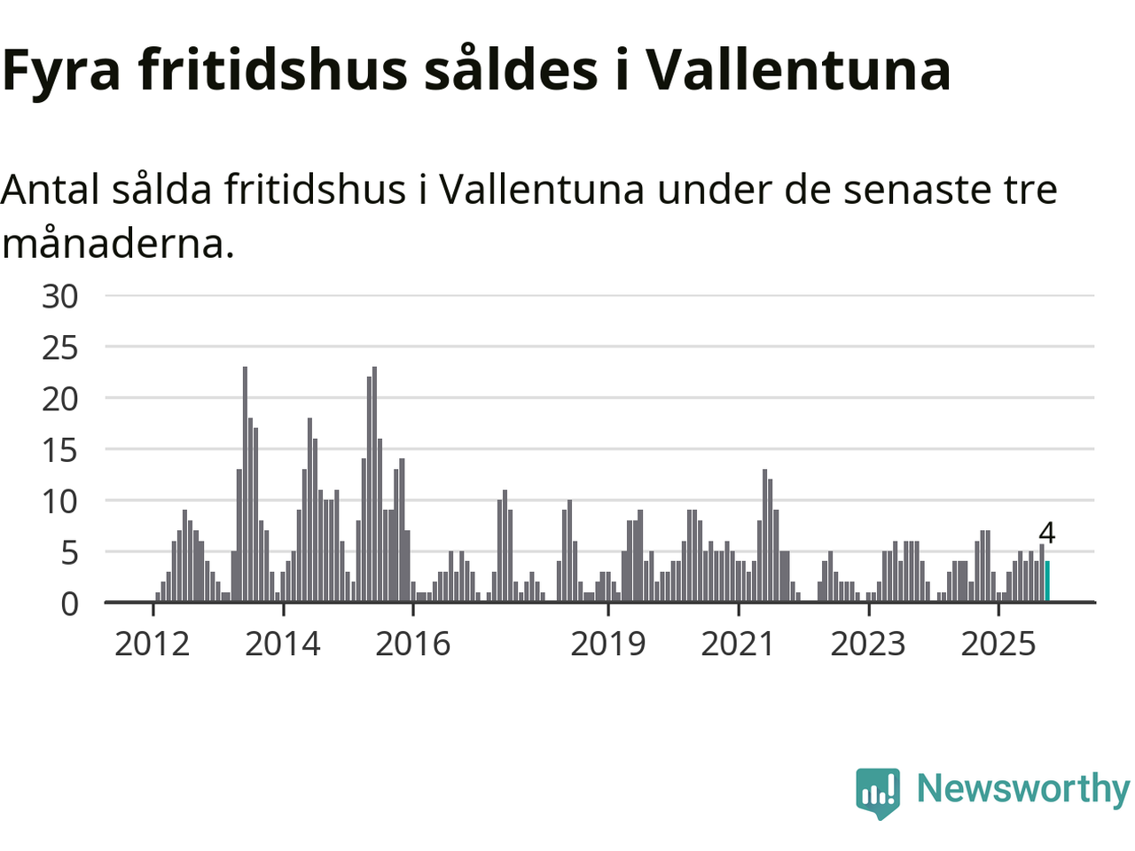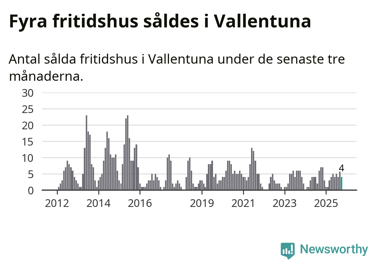 Mellan augusti och oktober gjordes sammanlagt fyra affärer med fritidshus i Vallentuna kommun. Det kan jämföras med sju vid motsvarande tid i fjol.