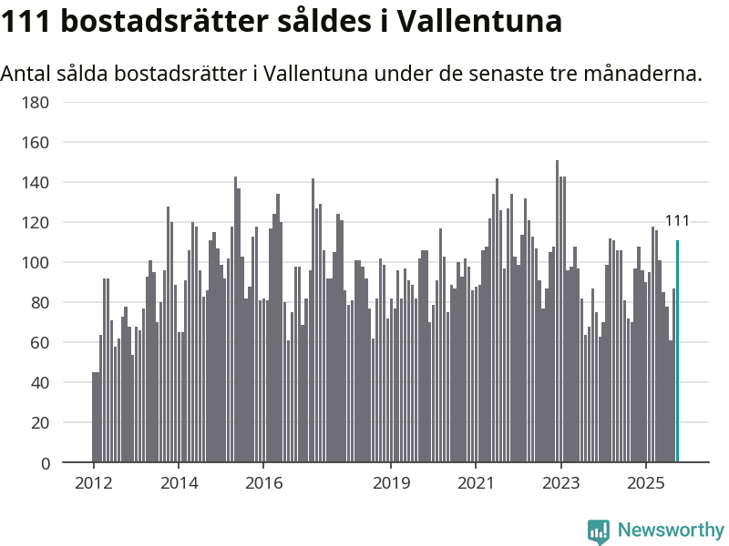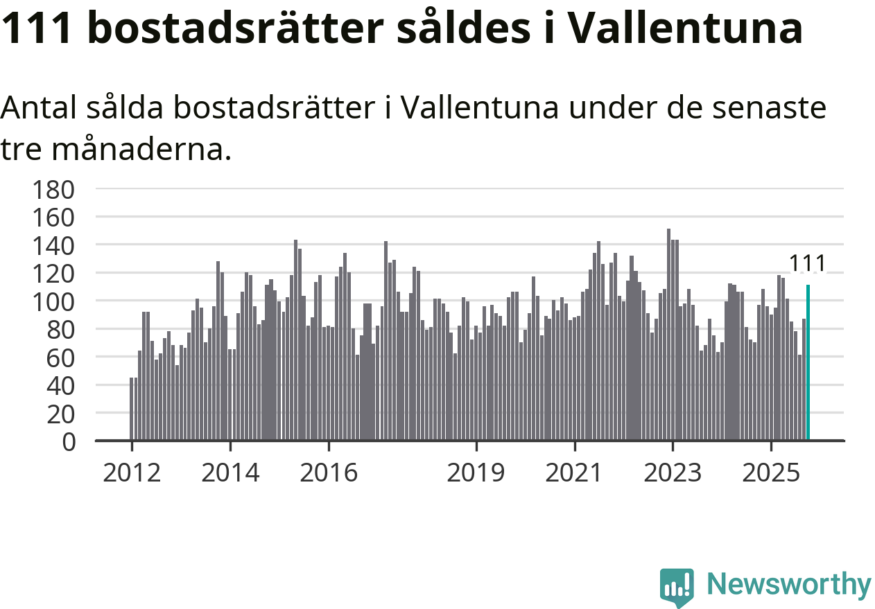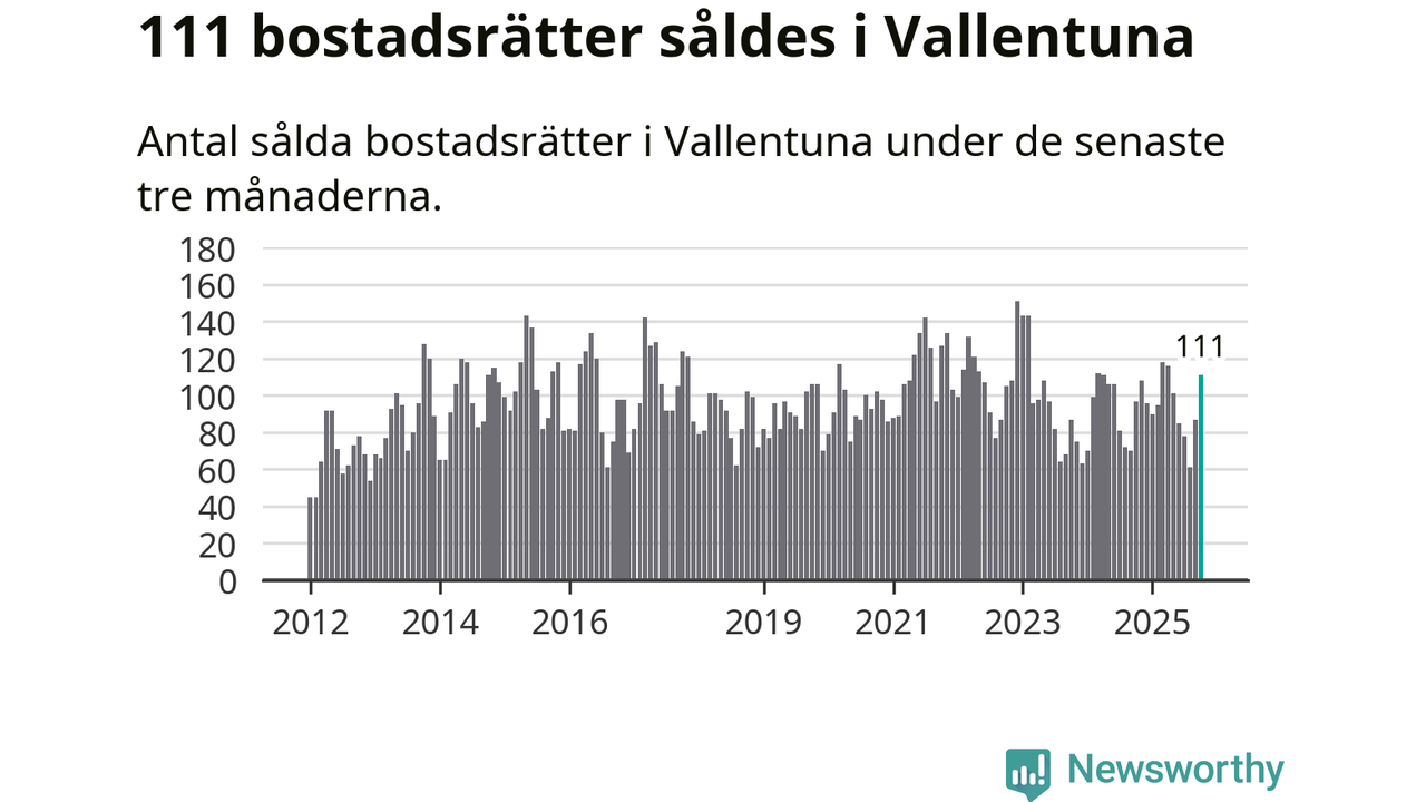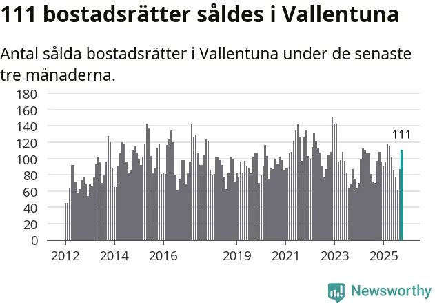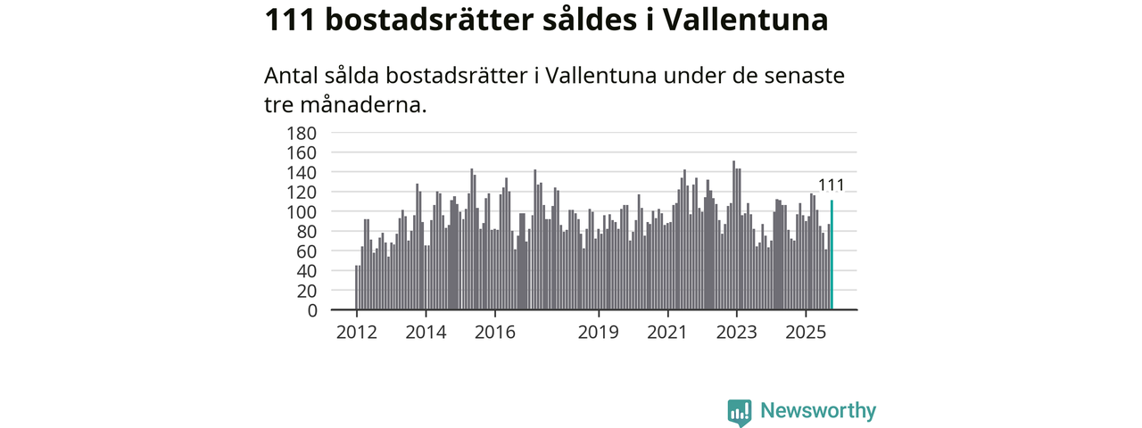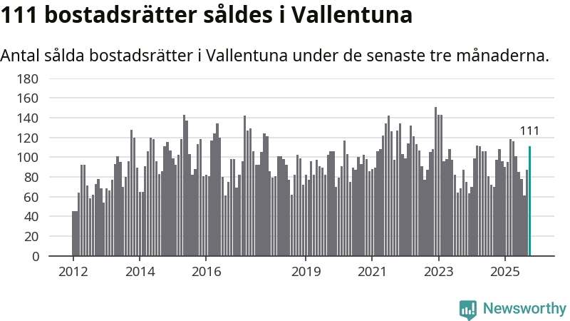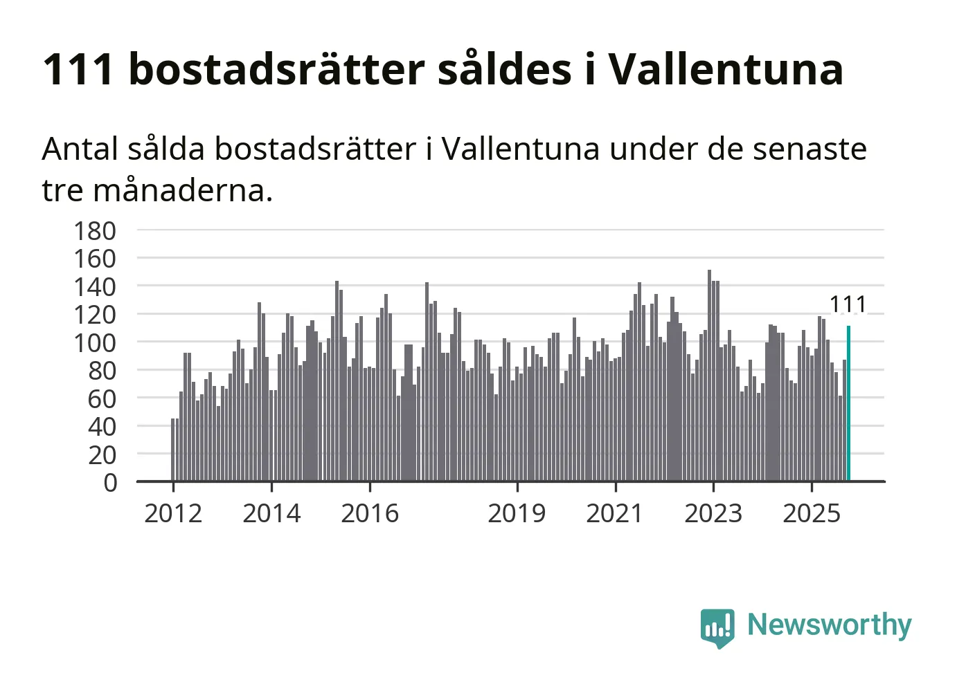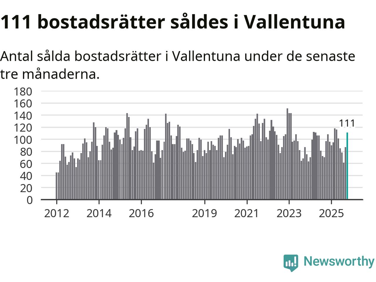 Sammanlagt såldes 111 bostadsrätter i Vallentuna kommun mellan augusti och oktober till ett genomsnittligt pris på 2,3 miljoner kronor. I fjol gjordes 97 affärer vid den här tiden på året.