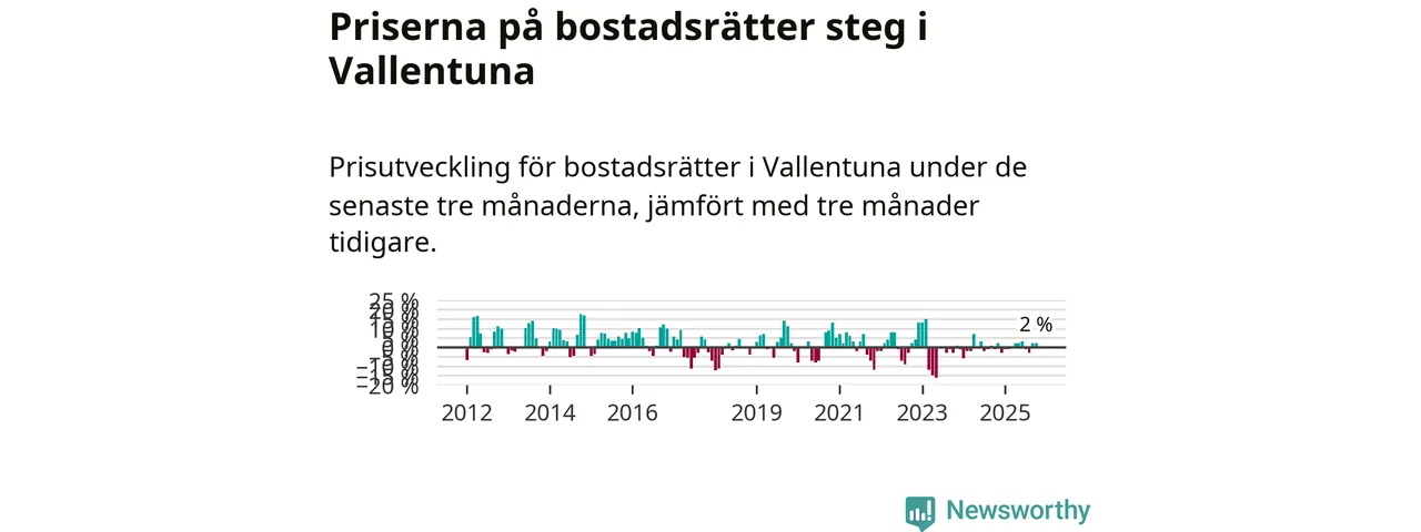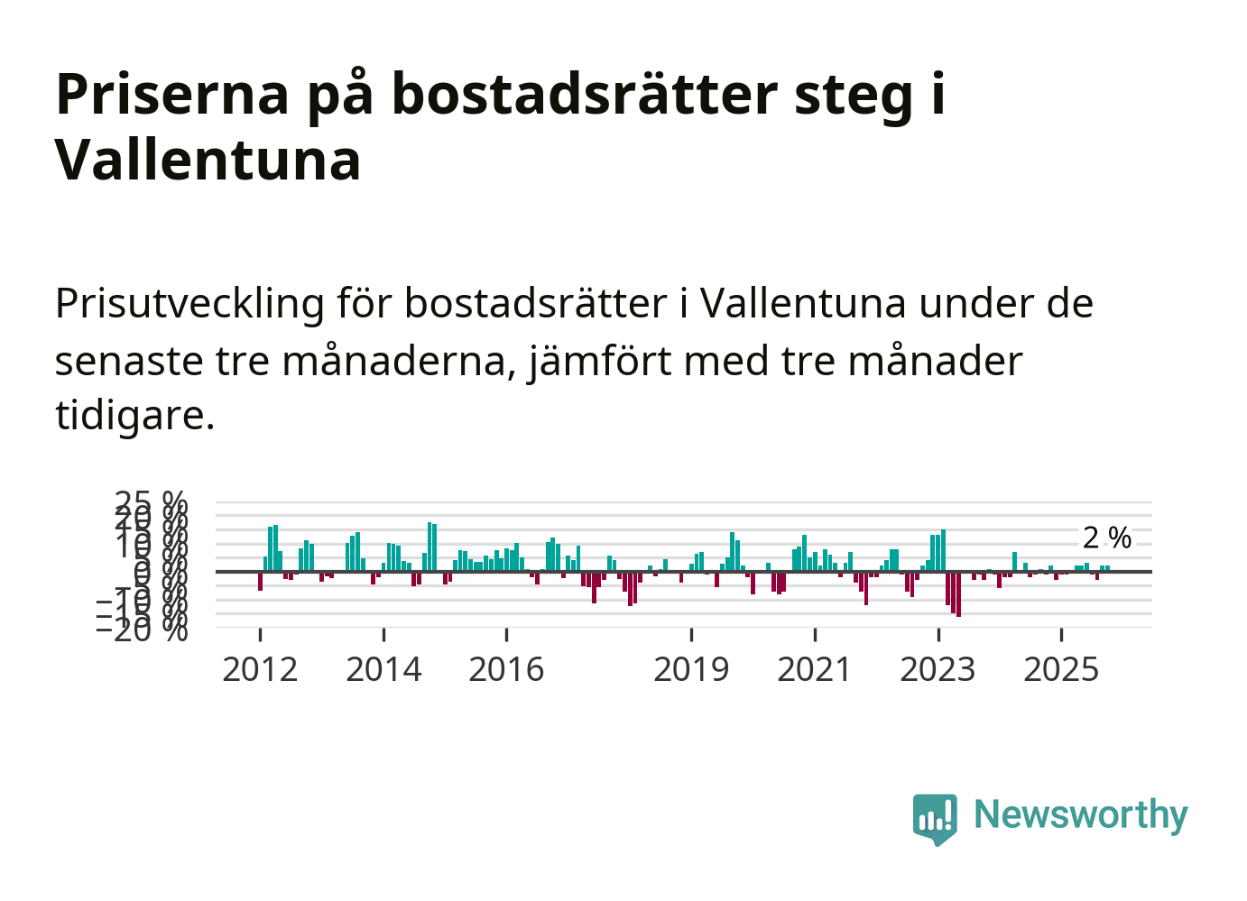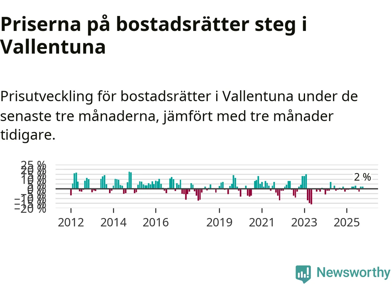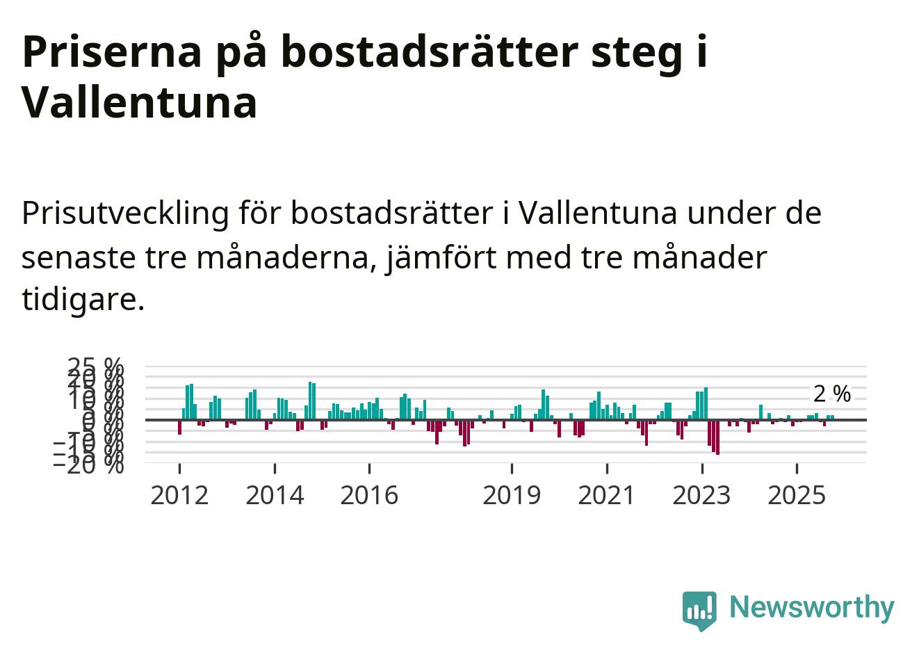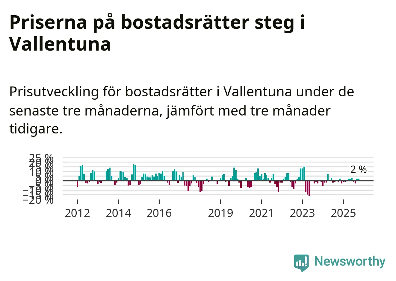 Priserna på bostadsrätter har gått upp i Vallentuna kommun. Medelpriset på försäljningarna under de senaste tre månaderna visar på en uppgång med 2 procent.
