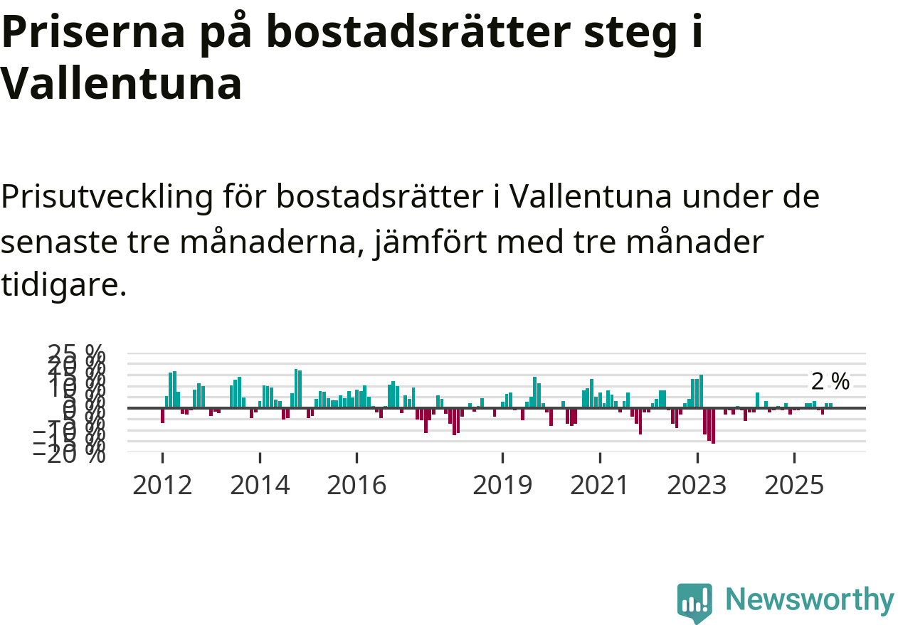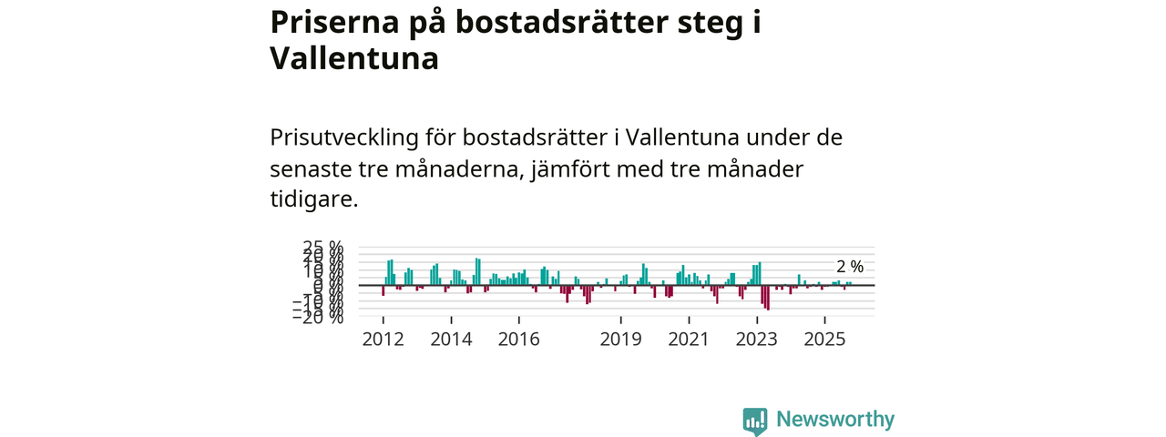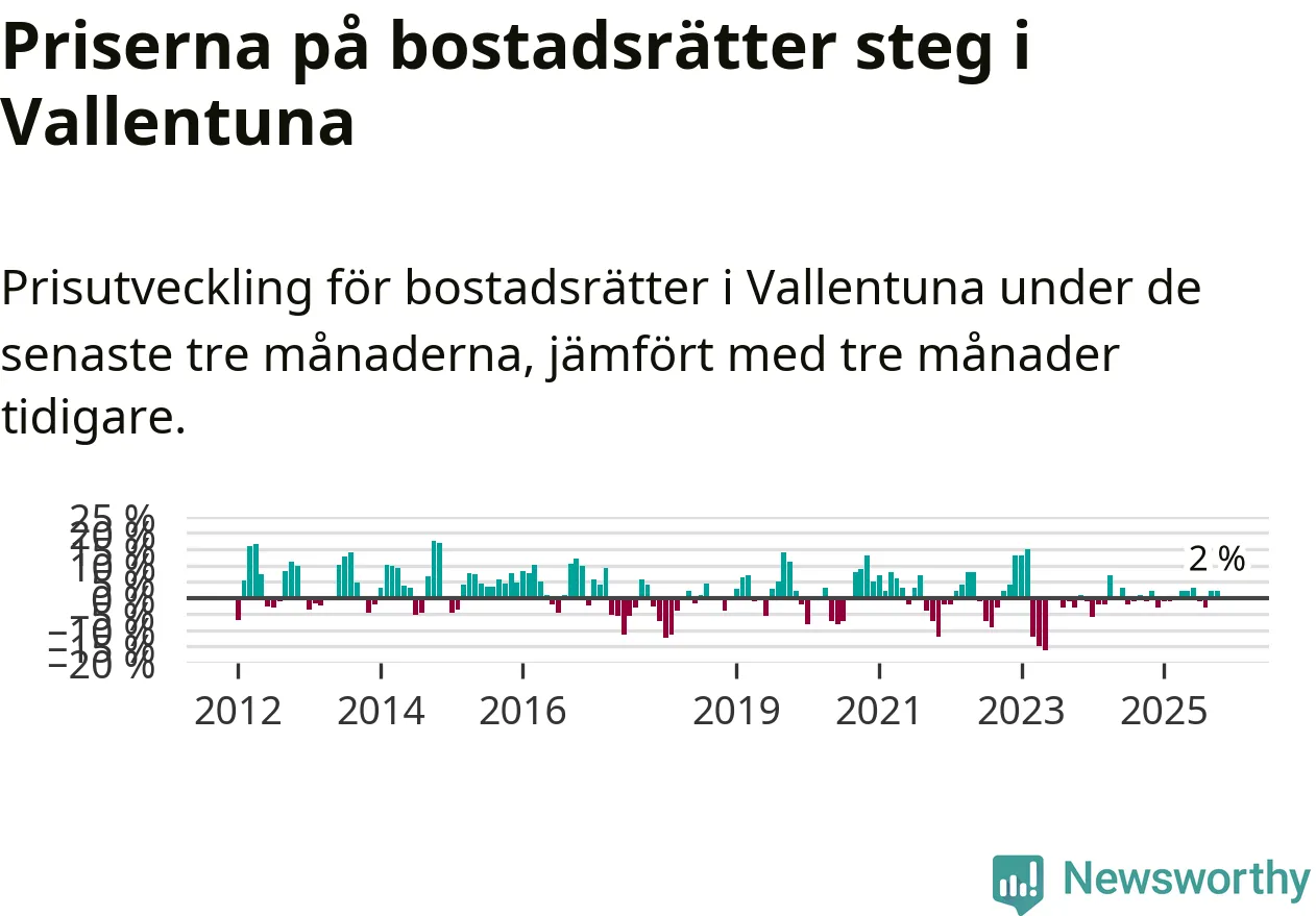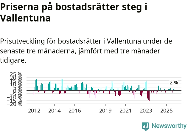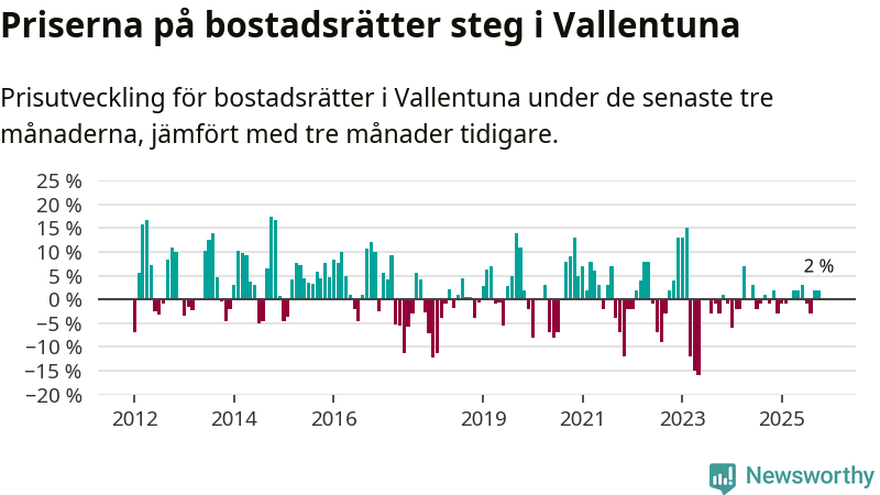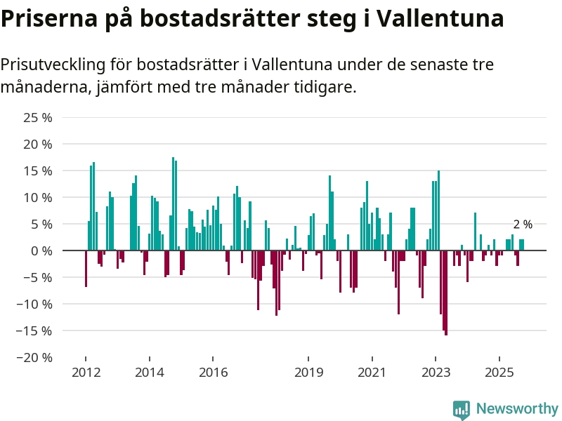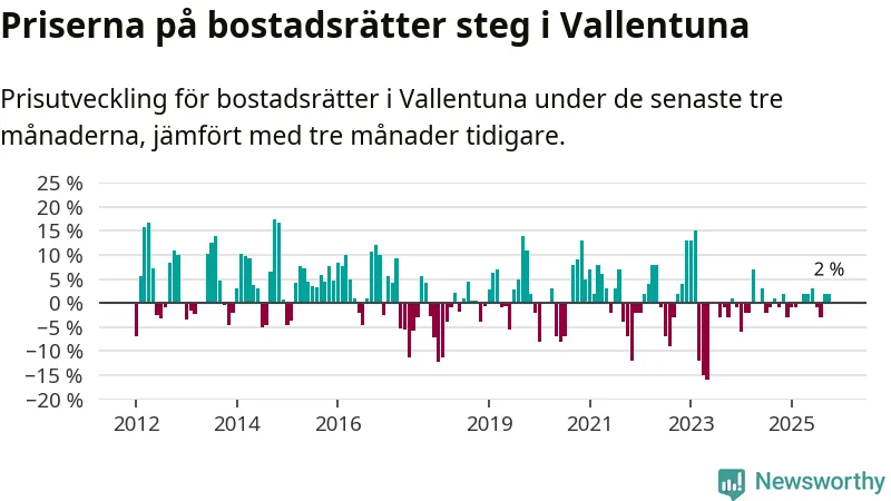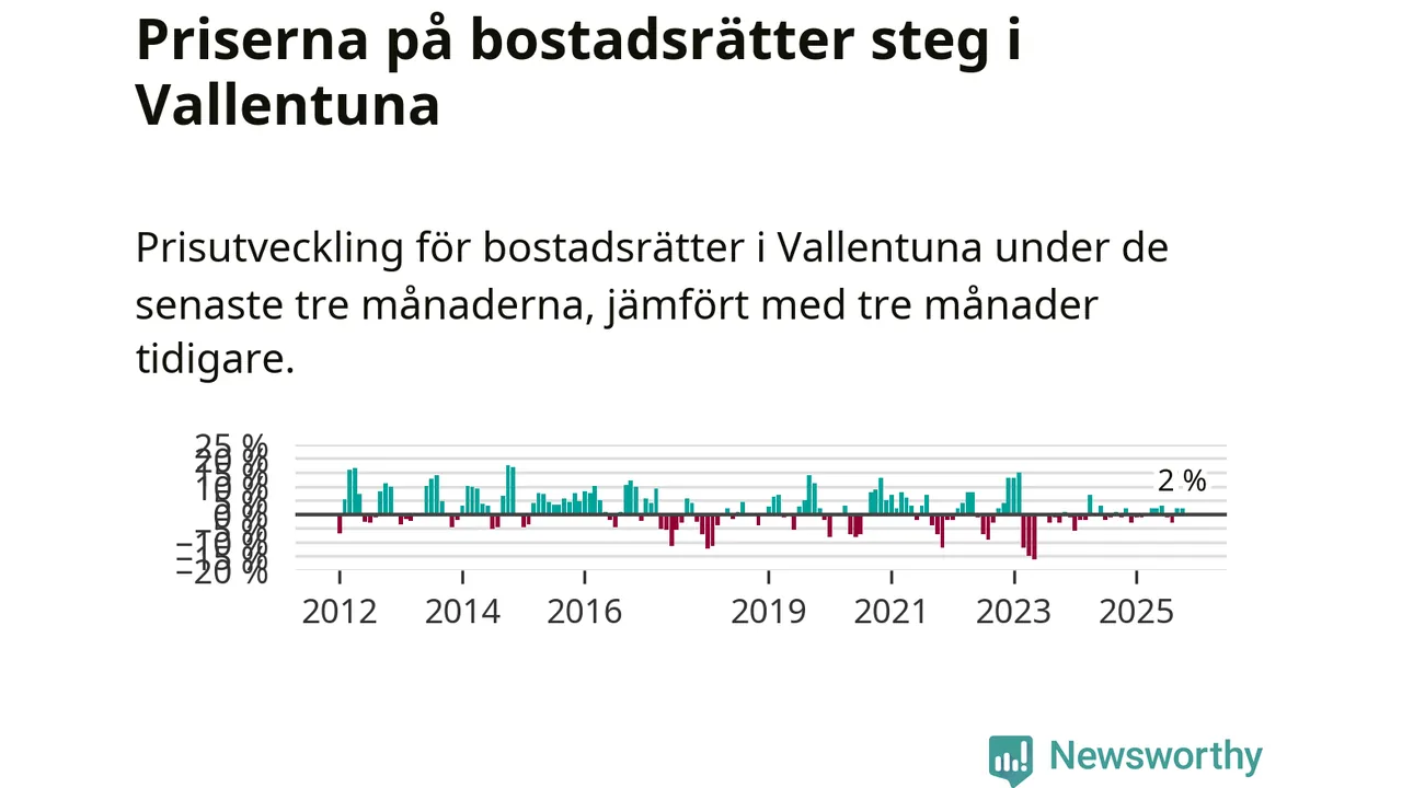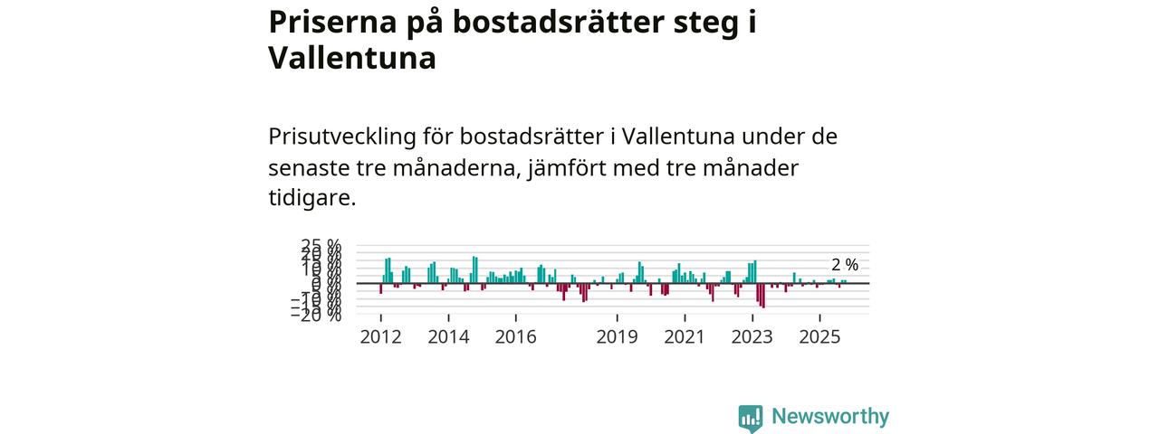 Priserna på bostadsrätter har gått upp i Vallentuna kommun. Medelpriset på försäljningarna under de senaste tre månaderna visar på en uppgång med 2 procent.