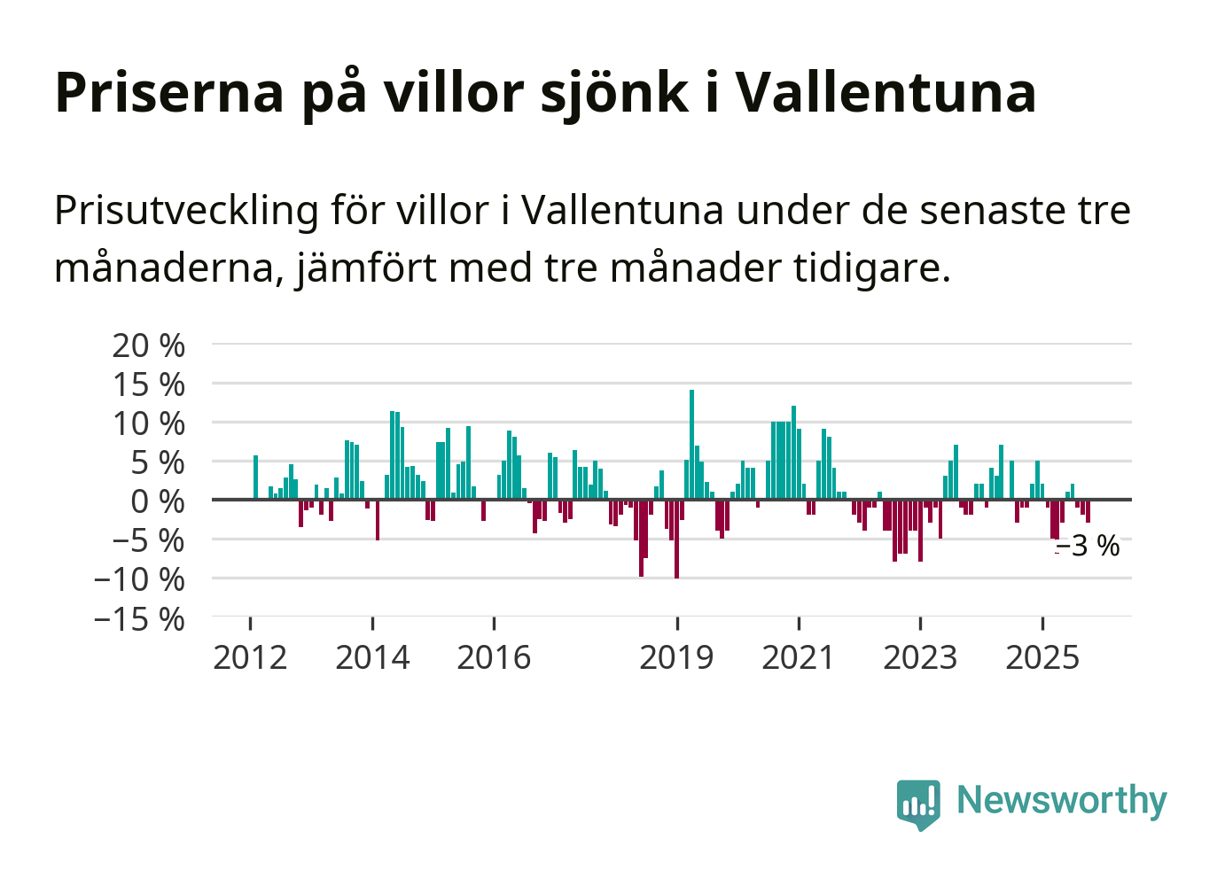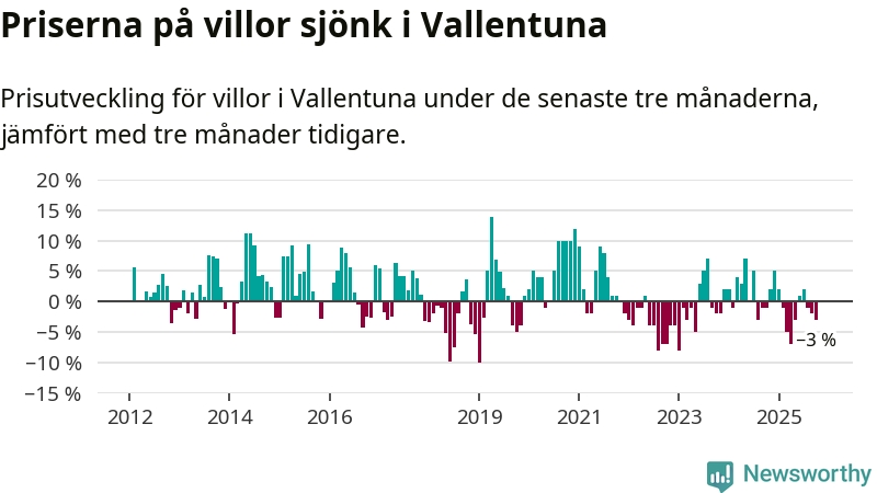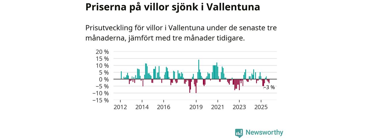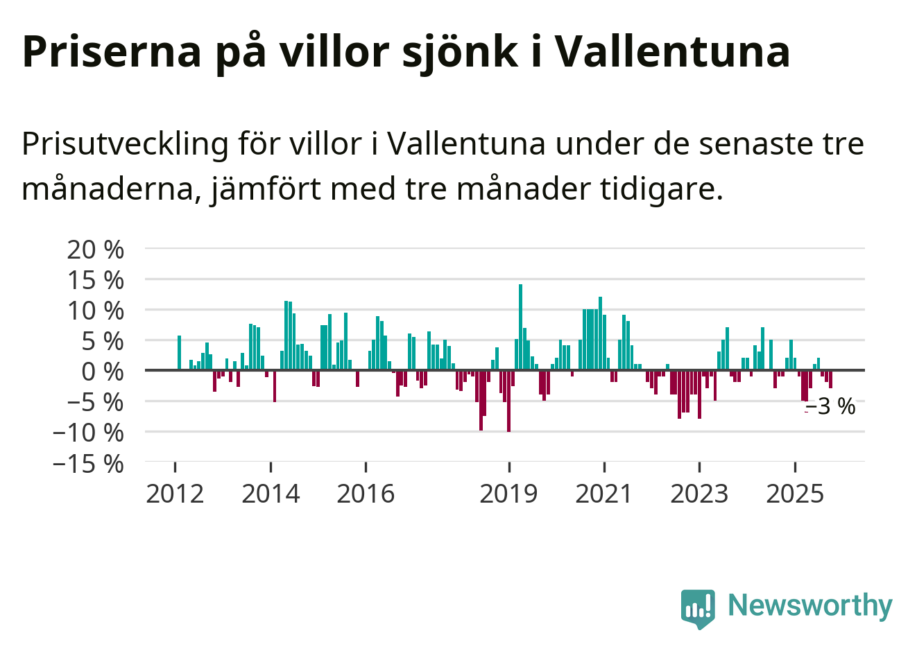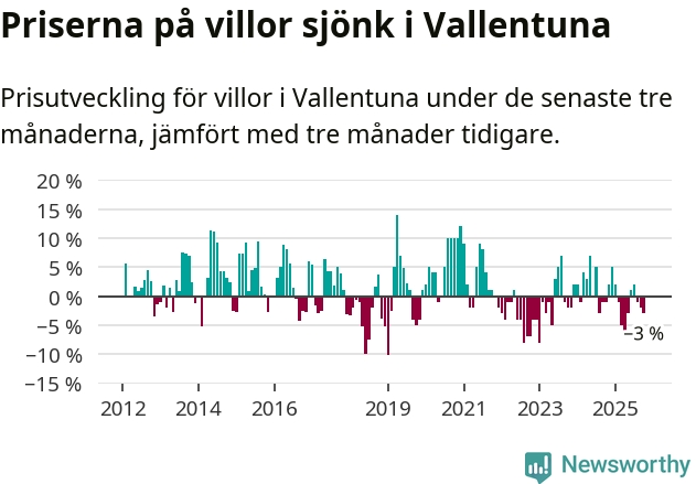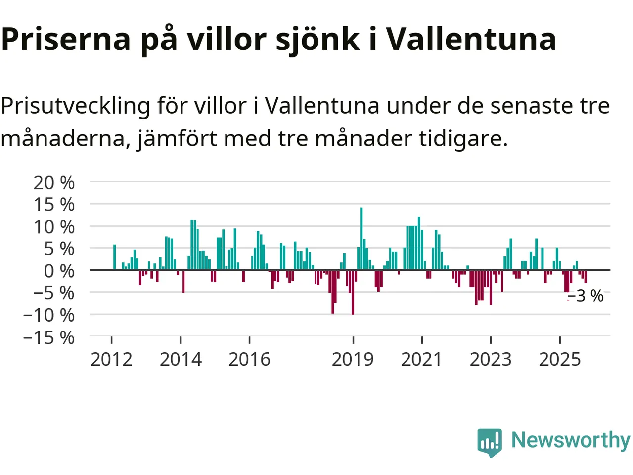Villapriserna har gått ner i Vallentuna kommun. Medelpriset på försäljningarna under de senaste tre månaderna visar på en nedgång med 3 procent.