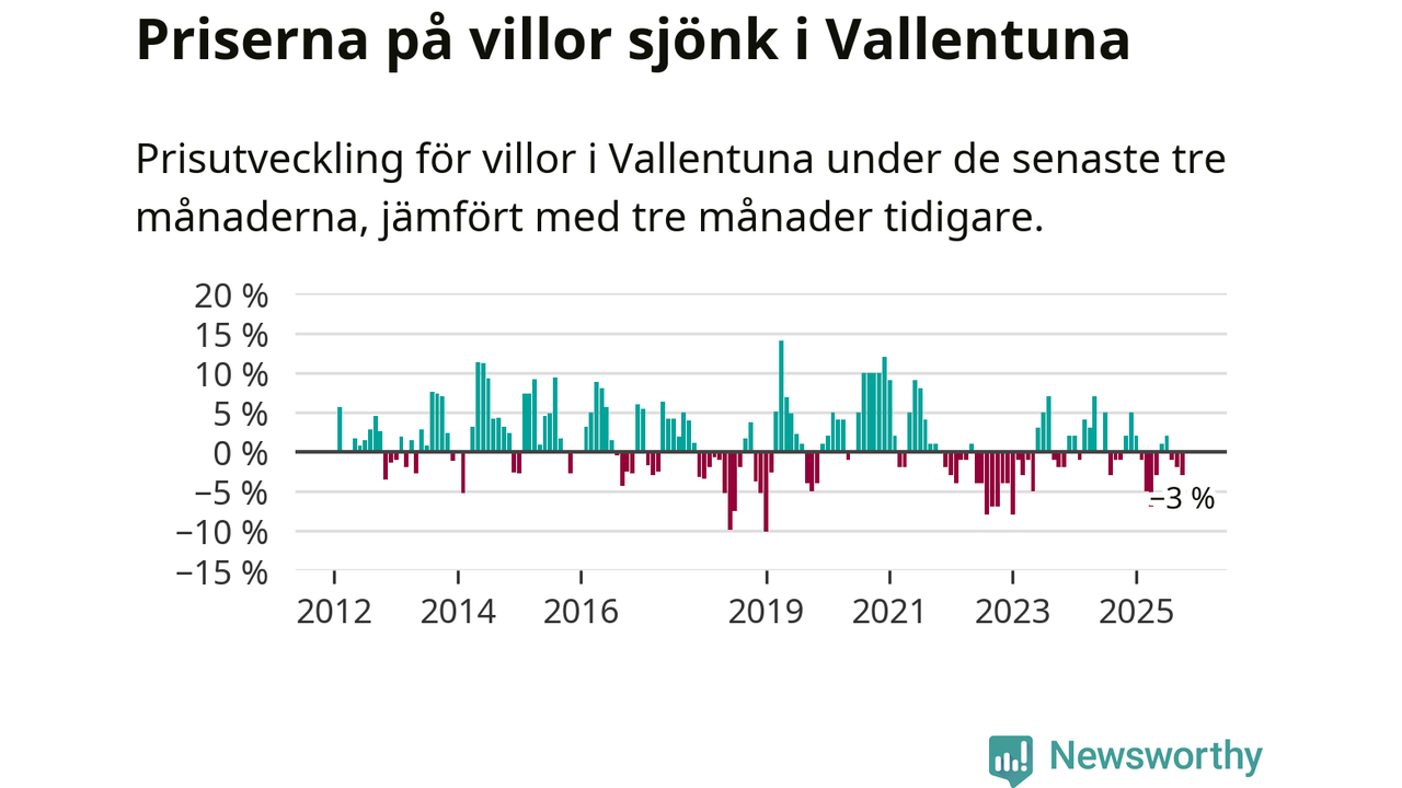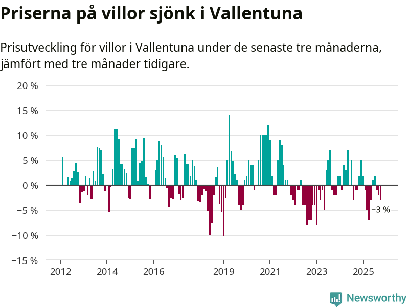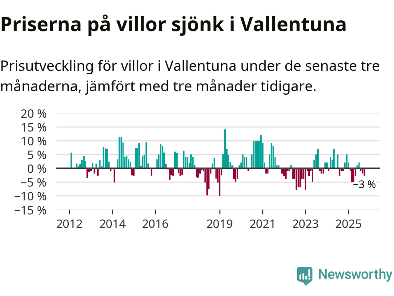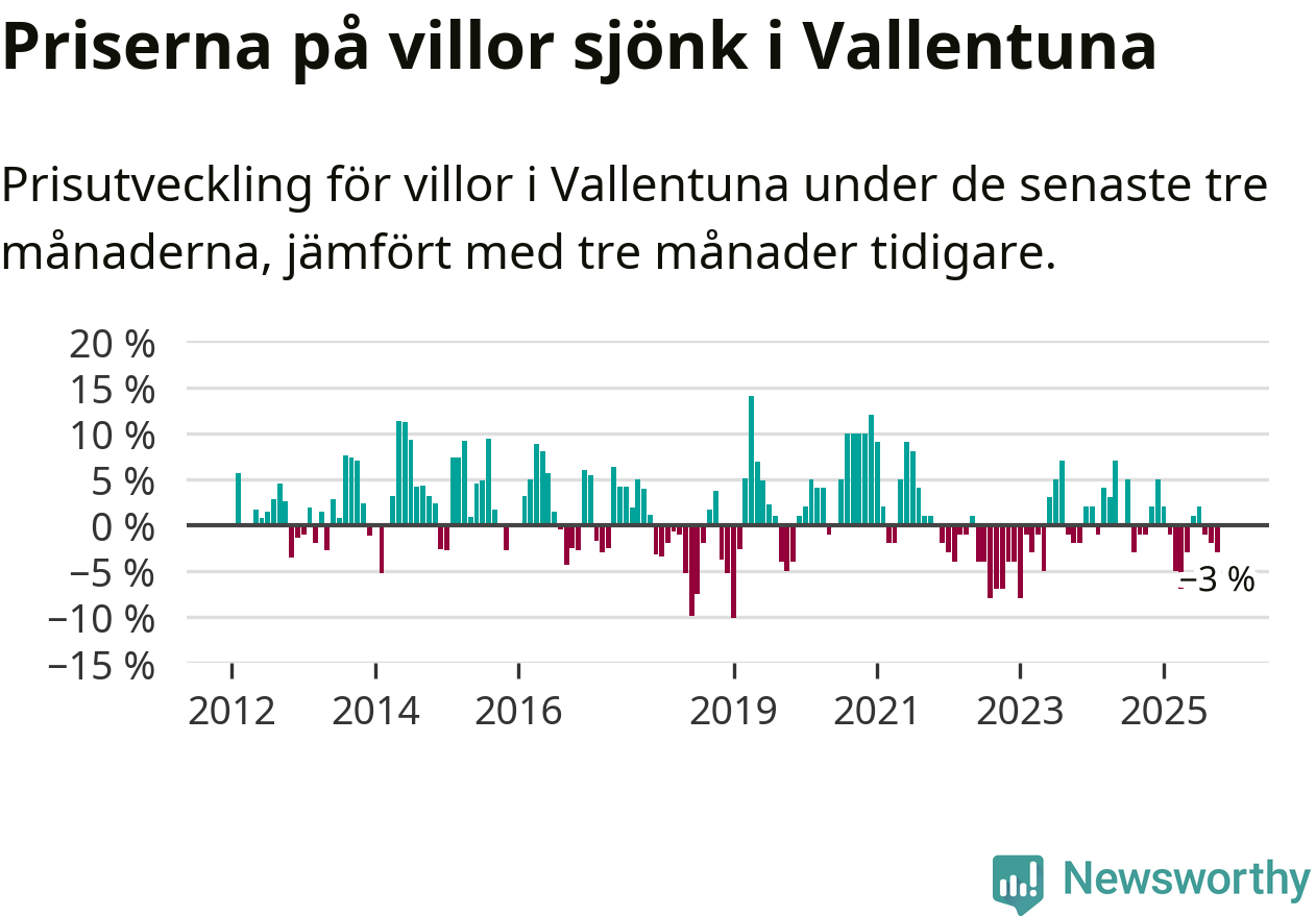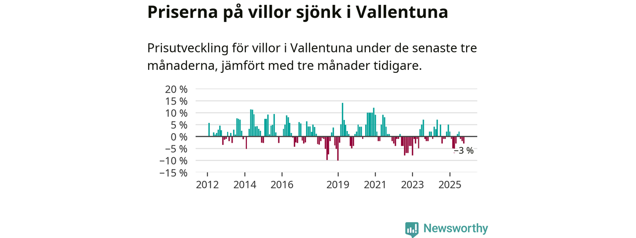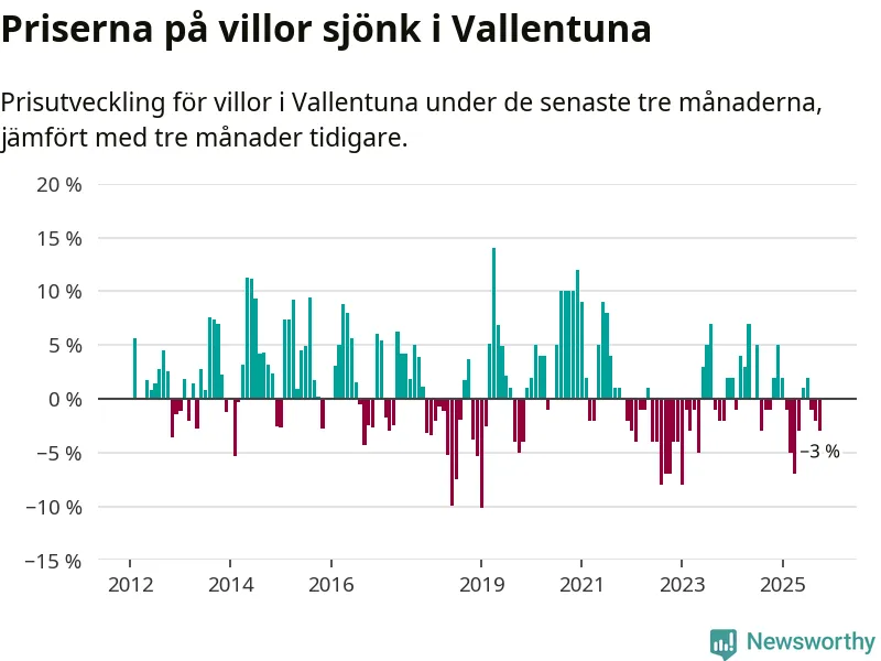 Villapriserna har gått ner i Vallentuna kommun. Medelpriset på försäljningarna under de senaste tre månaderna visar på en nedgång med 3 procent.