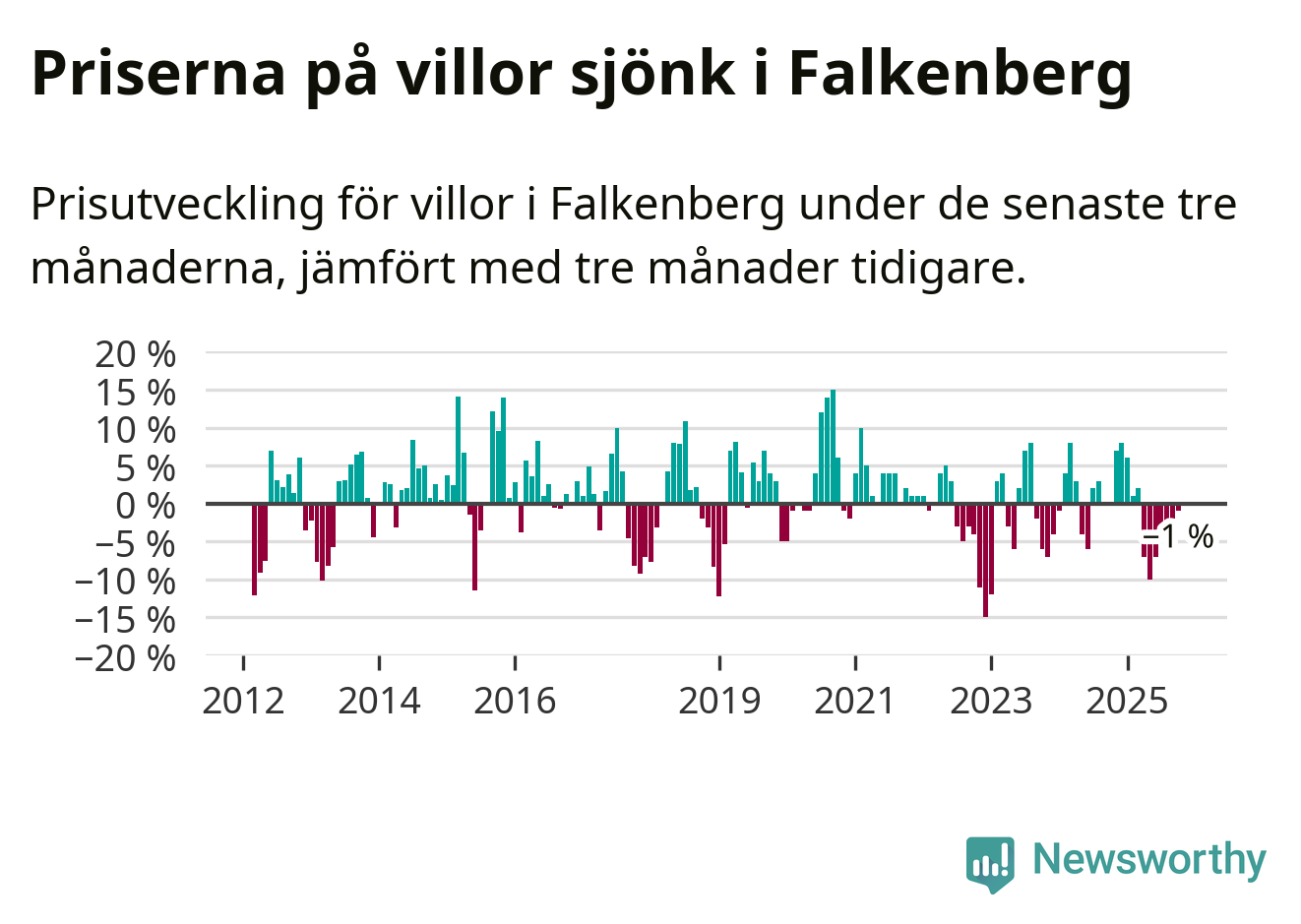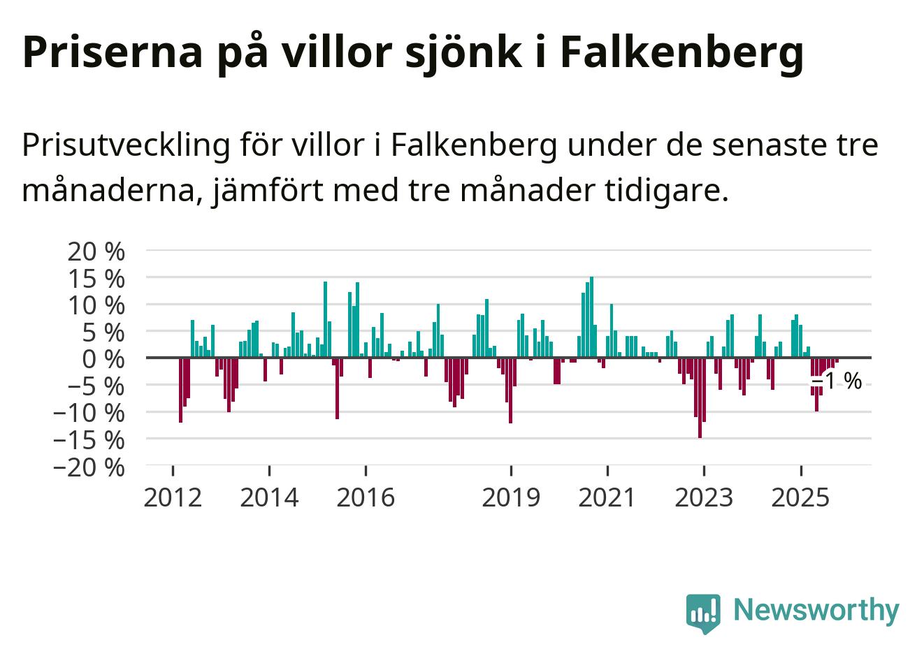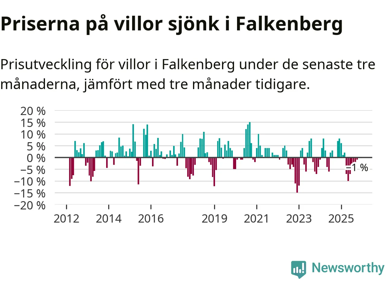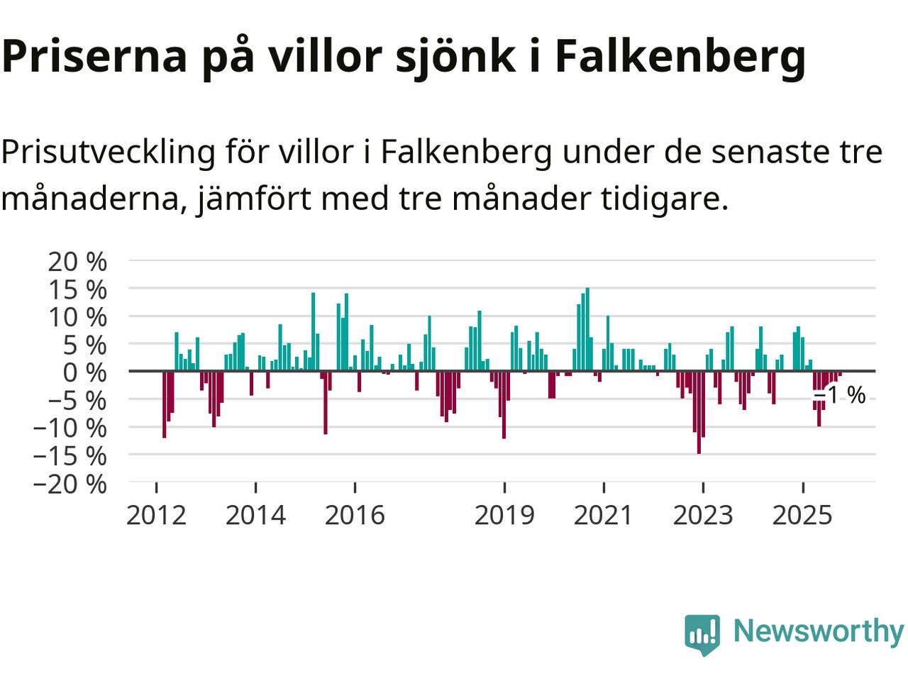 Villapriserna har gått ner i Falkenbergs kommun. Medelpriset på försäljningarna under de senaste tre månaderna visar på en nedgång med 1 procent.