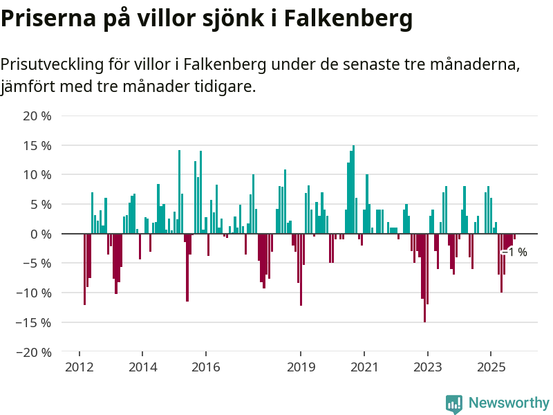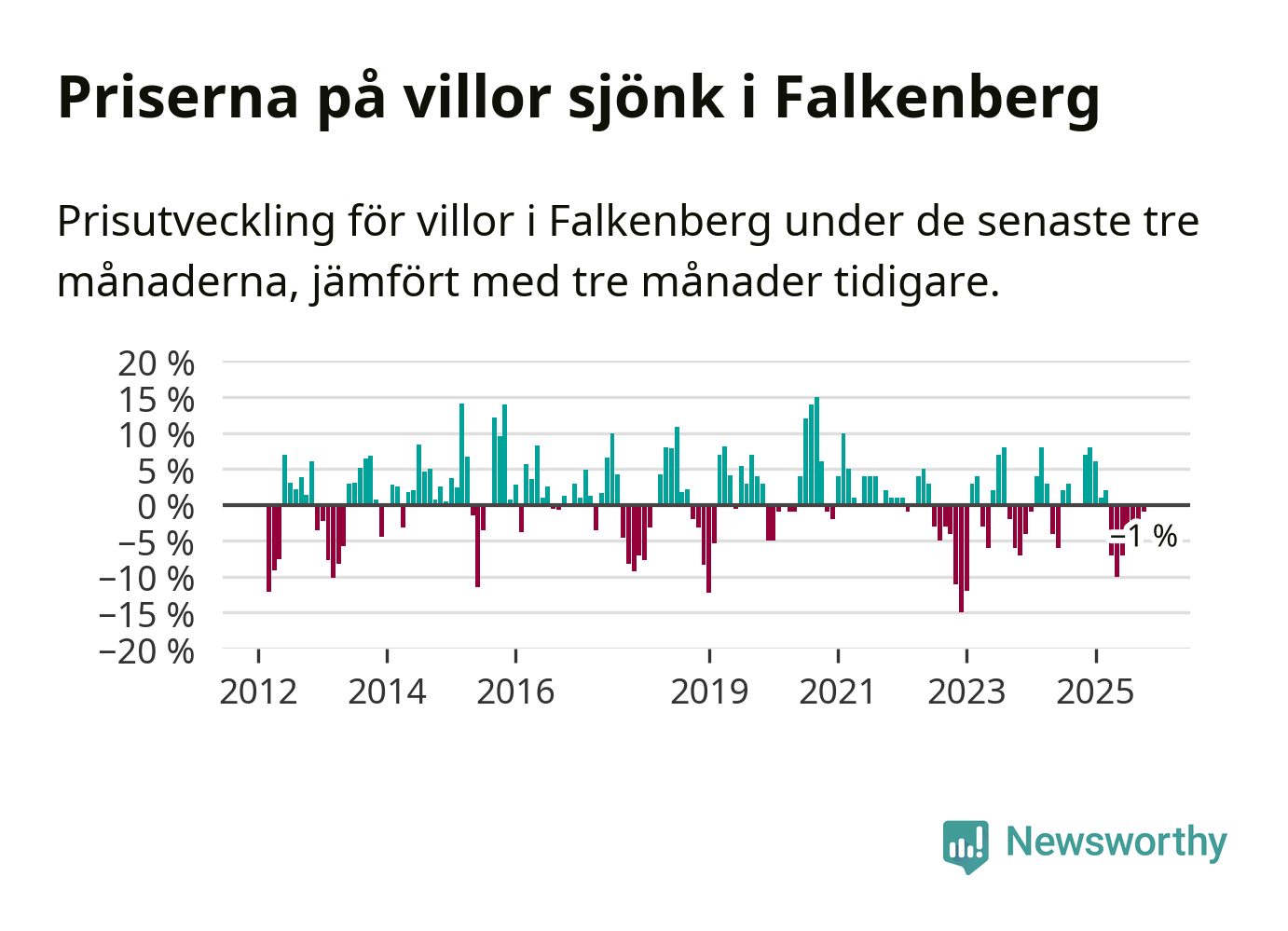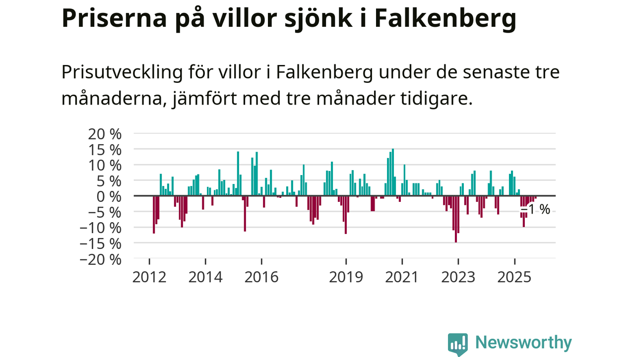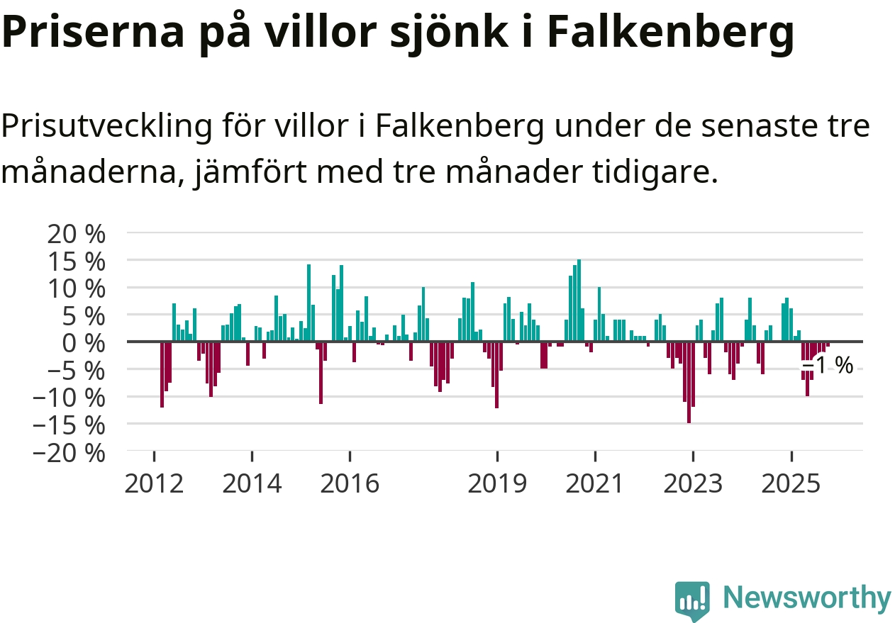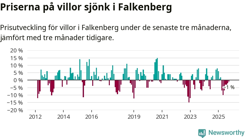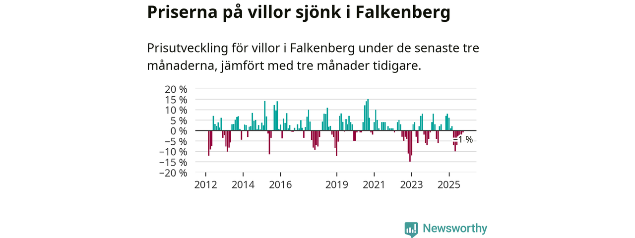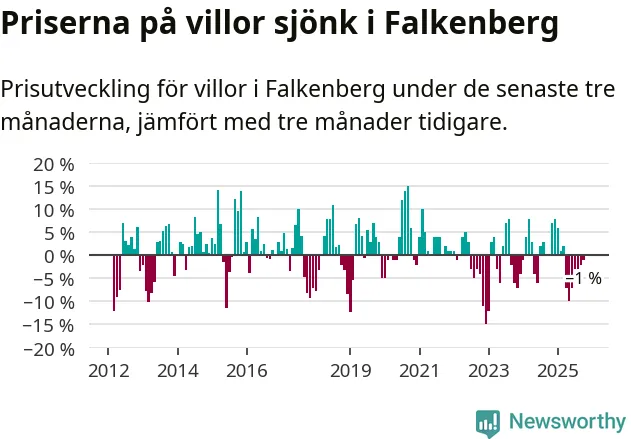 Villapriserna har gått ner i Falkenbergs kommun. Medelpriset på försäljningarna under de senaste tre månaderna visar på en nedgång med 1 procent.