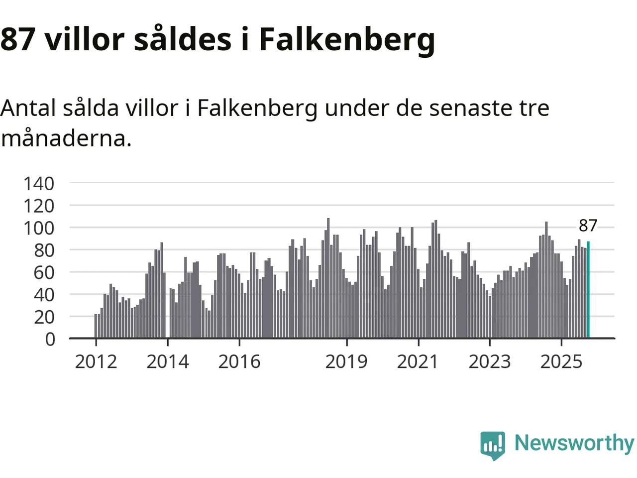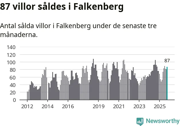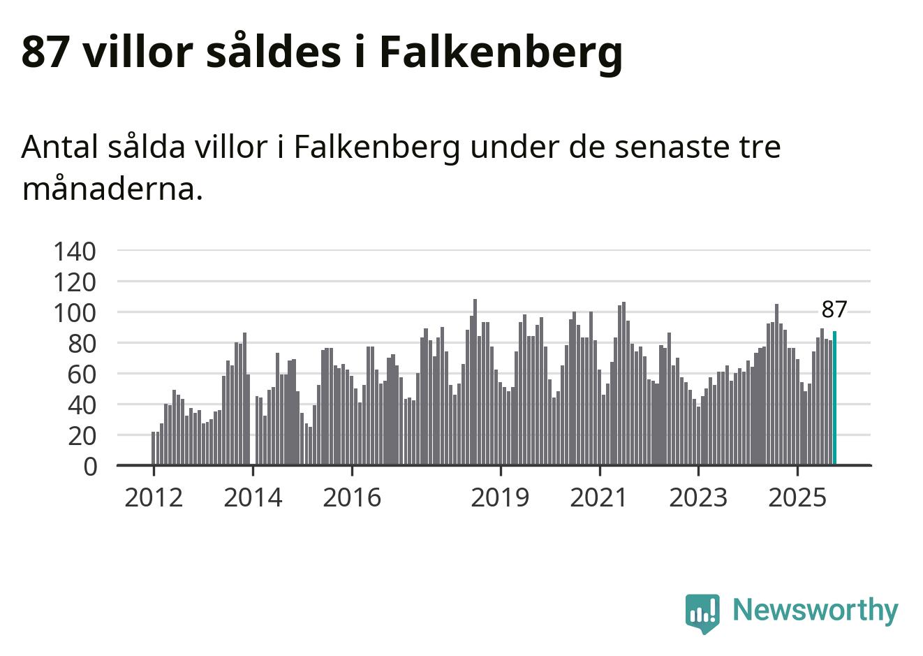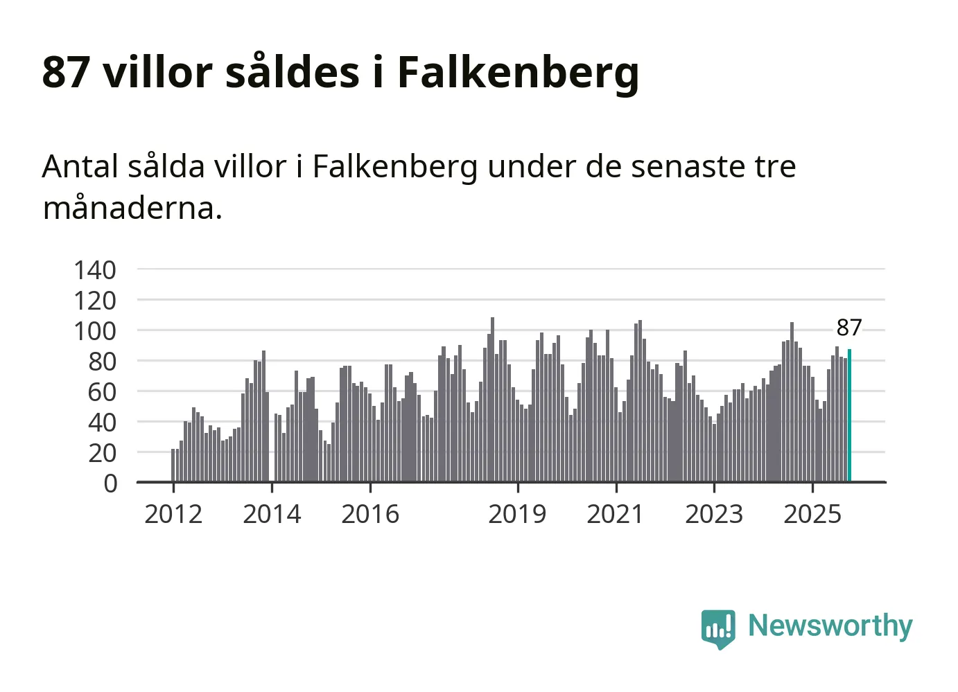 Sammanlagt såldes 87 villor i Falkenbergs kommun mellan augusti och oktober till ett genomsnittligt pris på 3,6 miljoner kronor. I fjol gjordes 88 affärer vid den här tiden på året.
