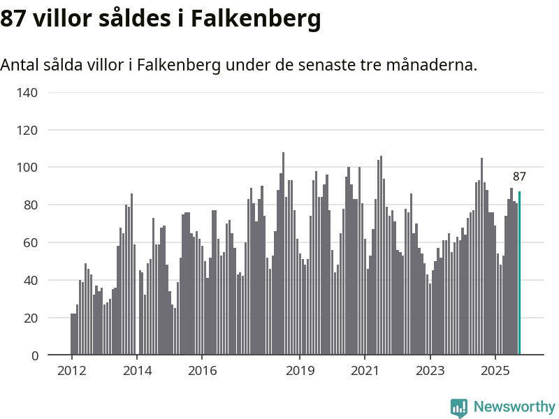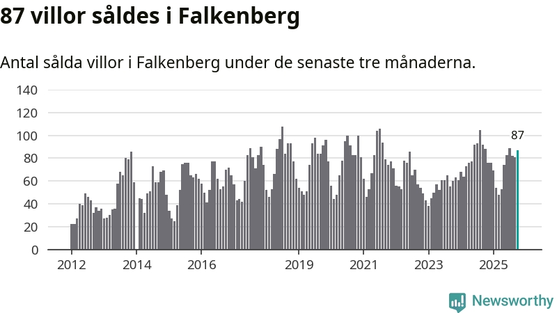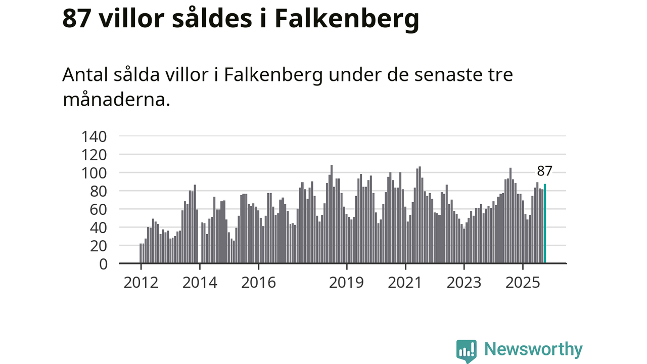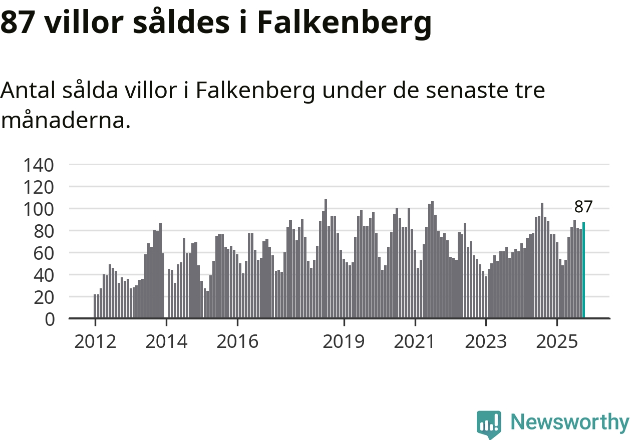 Sammanlagt såldes 87 villor i Falkenbergs kommun mellan augusti och oktober till ett genomsnittligt pris på 3,6 miljoner kronor. I fjol gjordes 88 affärer vid den här tiden på året.