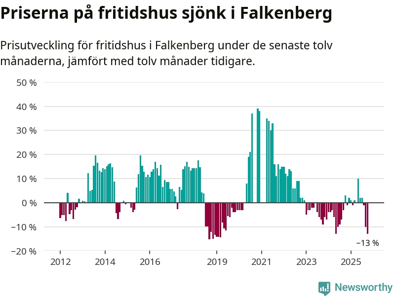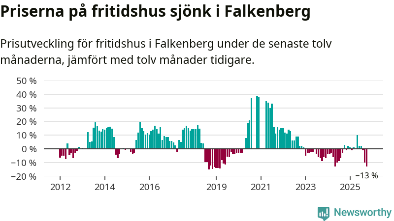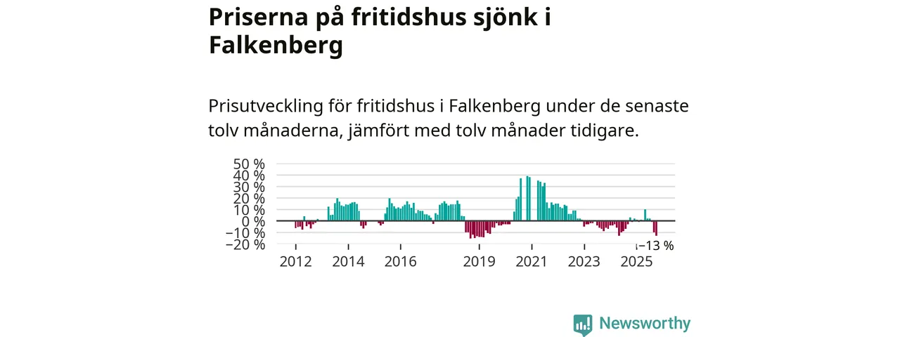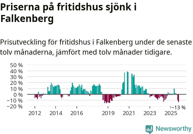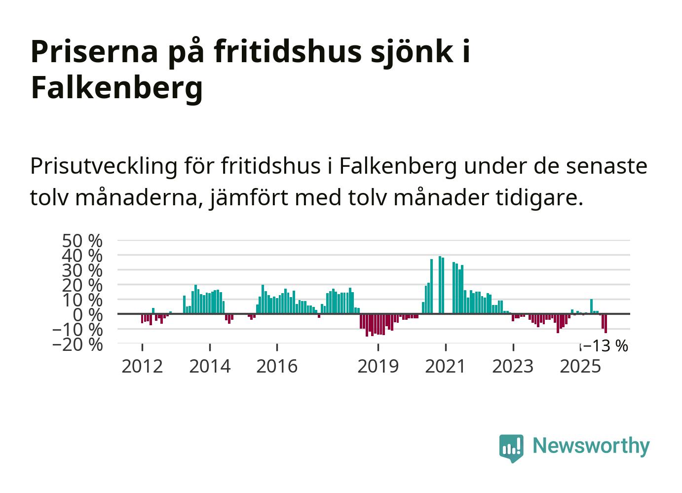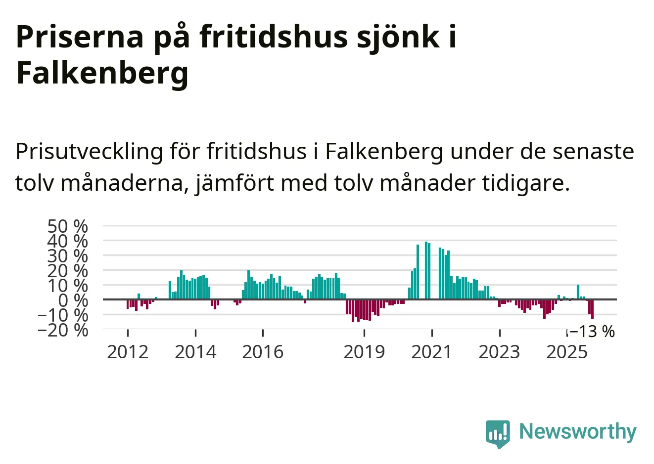 Priserna på fritidshus har gått ner i Falkenbergs kommun. Medelpriset på försäljningarna under de senaste tolv månaderna visar på en nedgång med 13 procent.