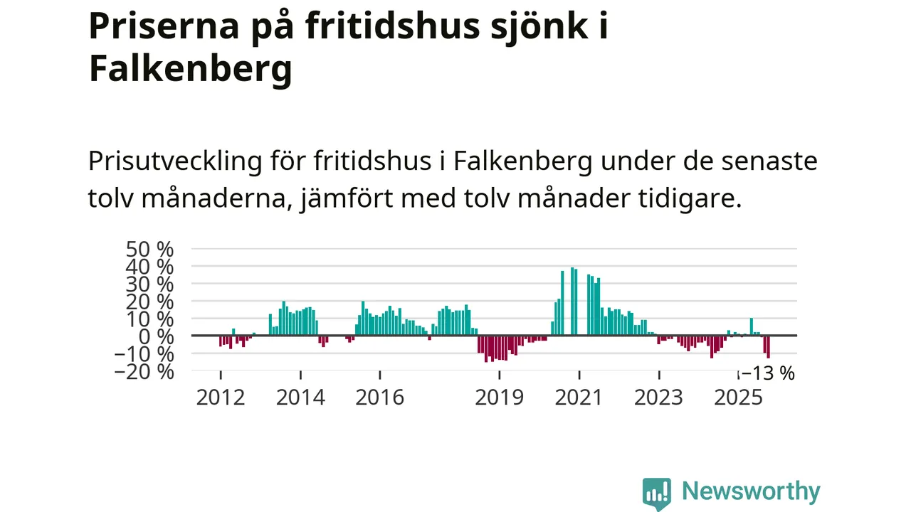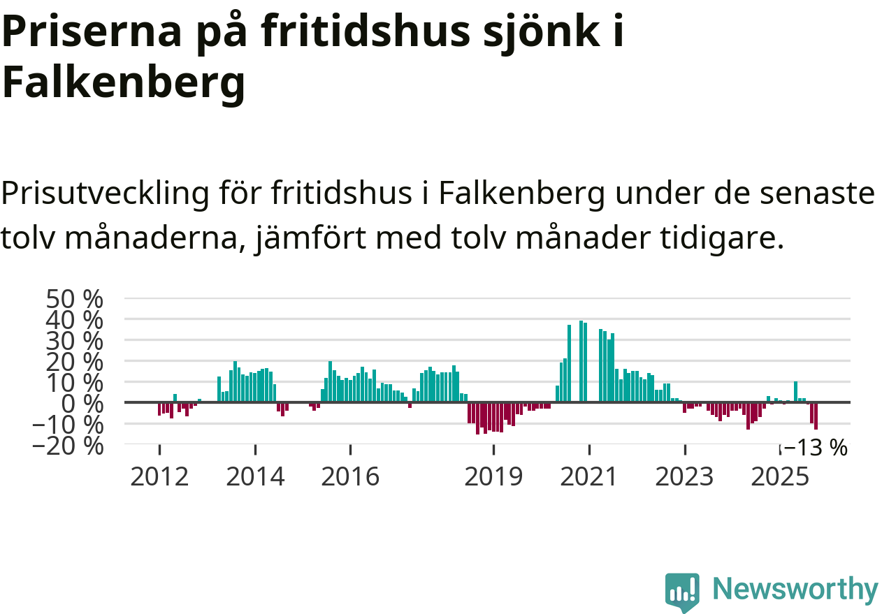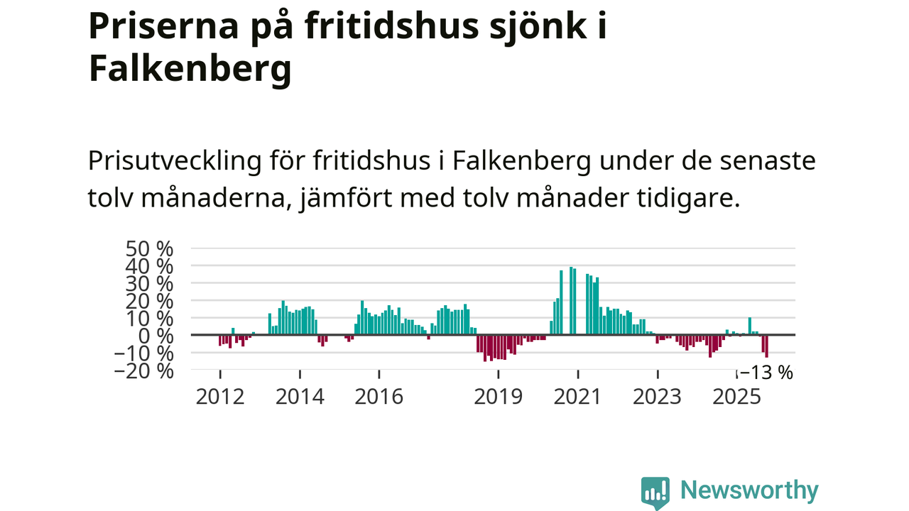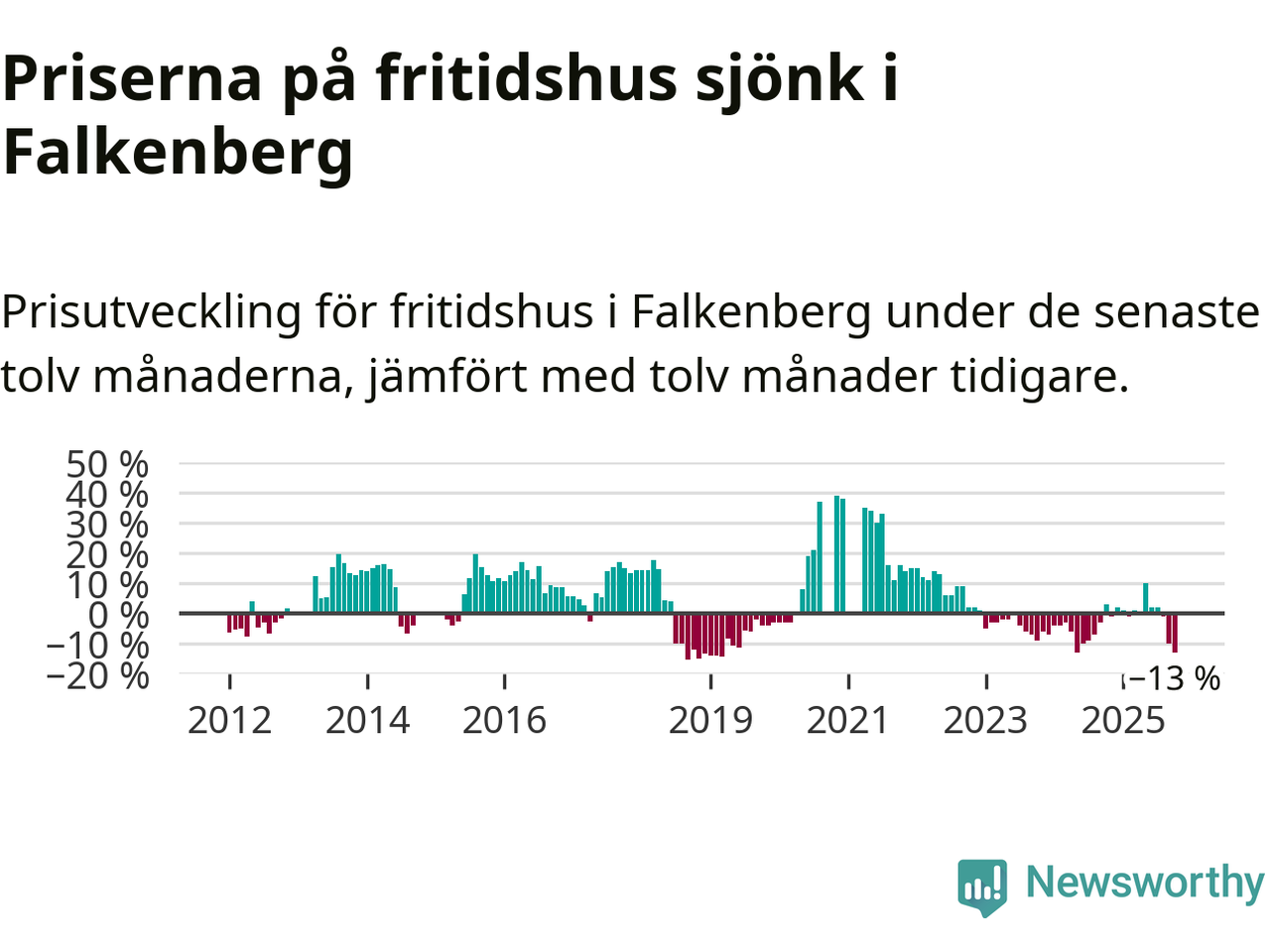 Priserna på fritidshus har gått ner i Falkenbergs kommun. Medelpriset på försäljningarna under de senaste tolv månaderna visar på en nedgång med 13 procent.