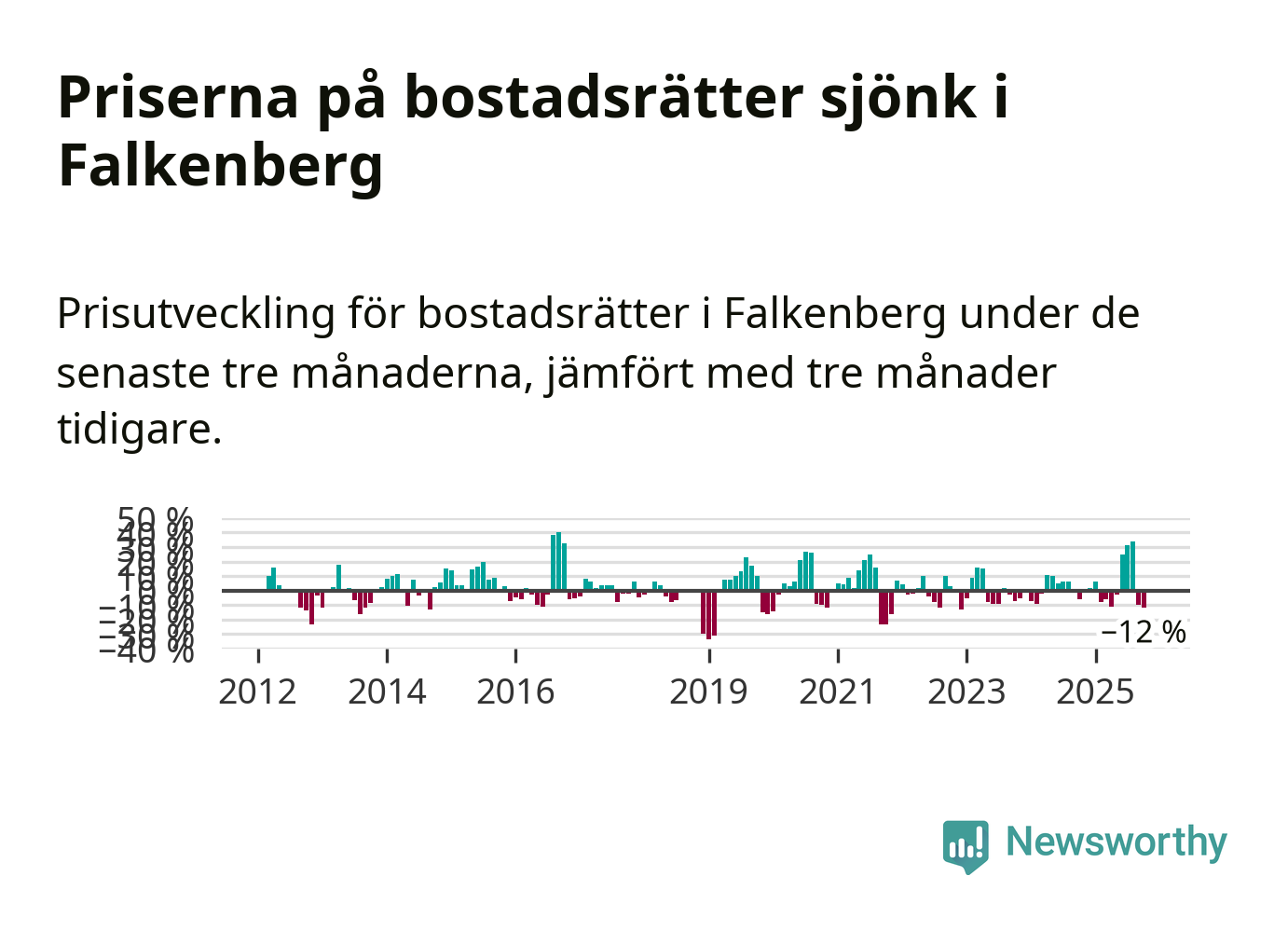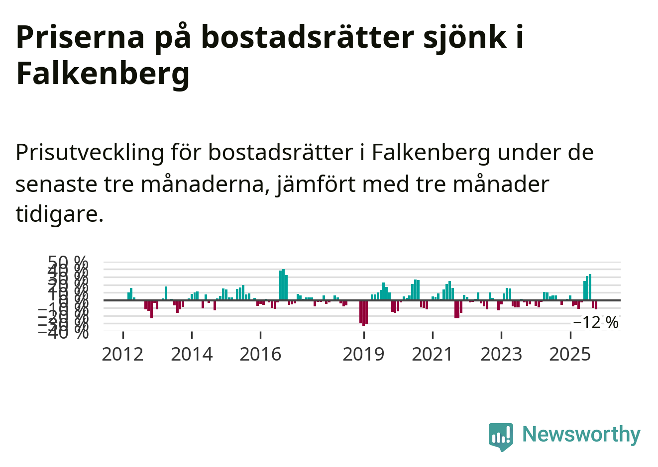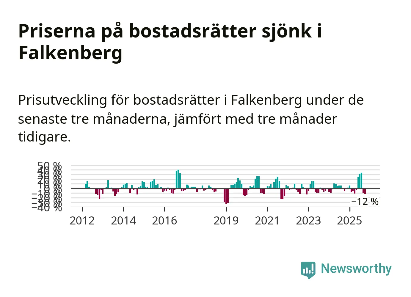 Priserna på bostadsrätter har gått ner i Falkenbergs kommun. Medelpriset på försäljningarna under de senaste tre månaderna visar på en nedgång med 12 procent.